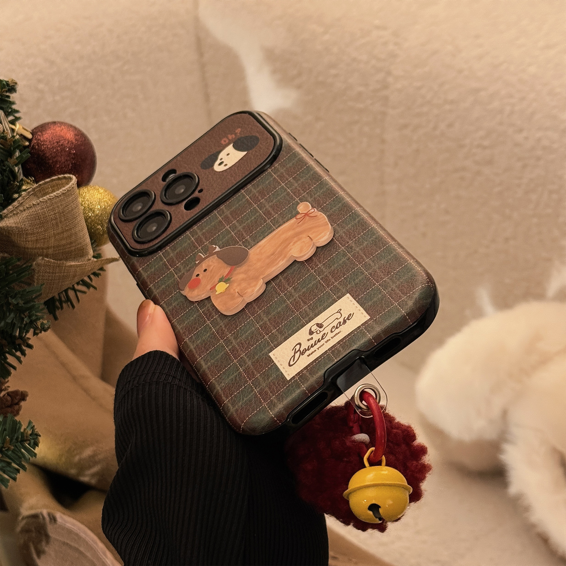 레트로 체크무늬 애플 16 휴대폰 케이스 아이폰15 크리스마스 강아지 14프로맥스 가죽 17 플러시 끈스토어 가기