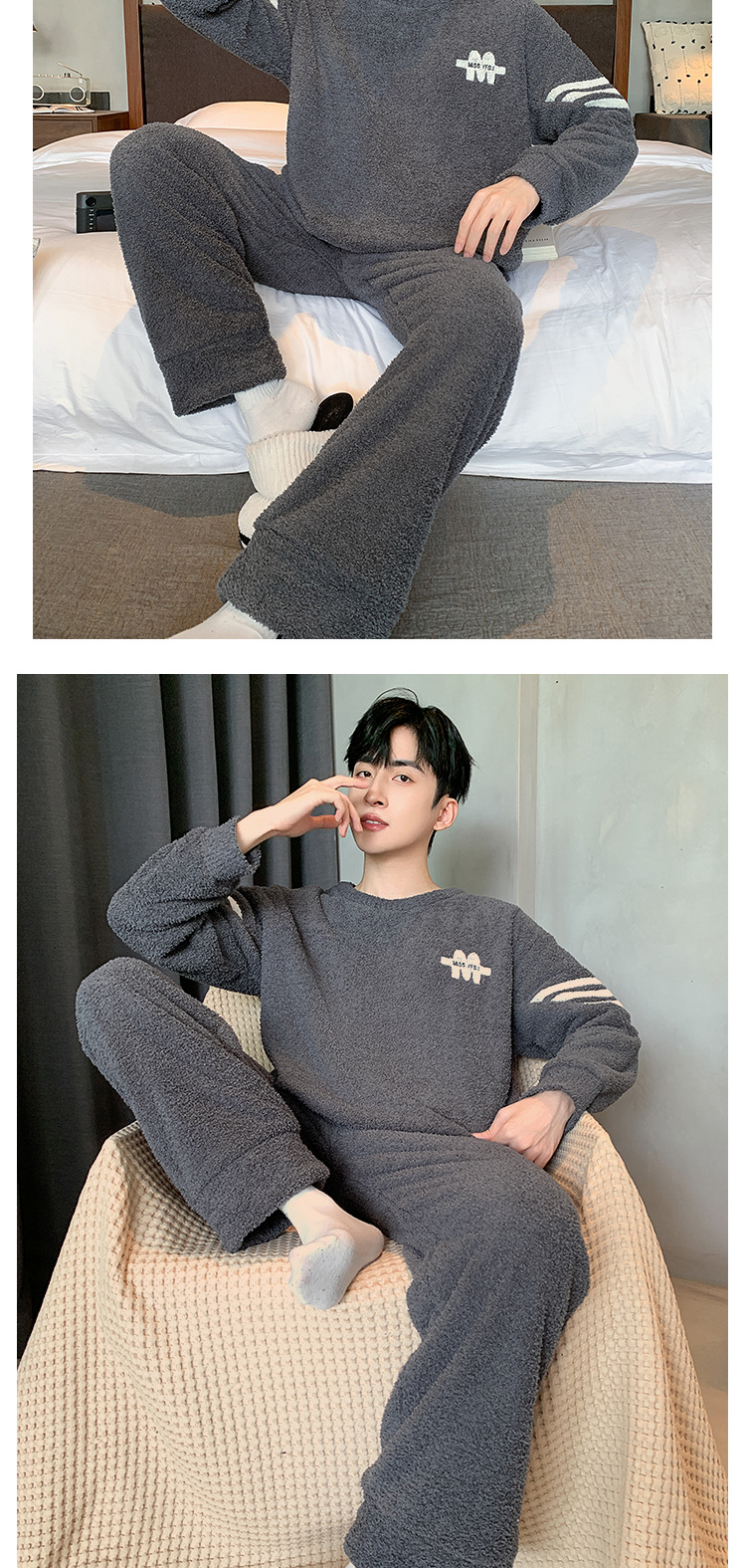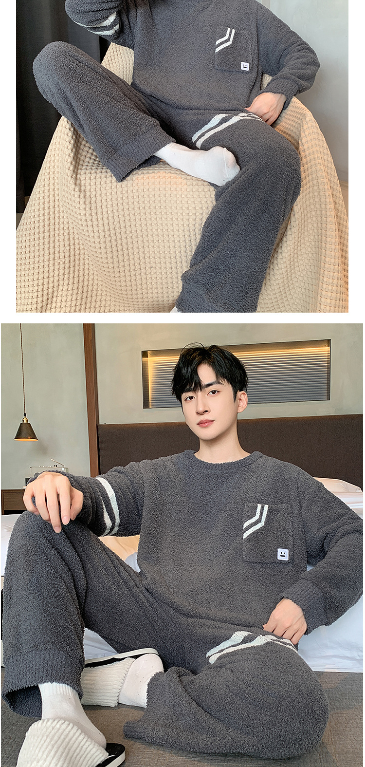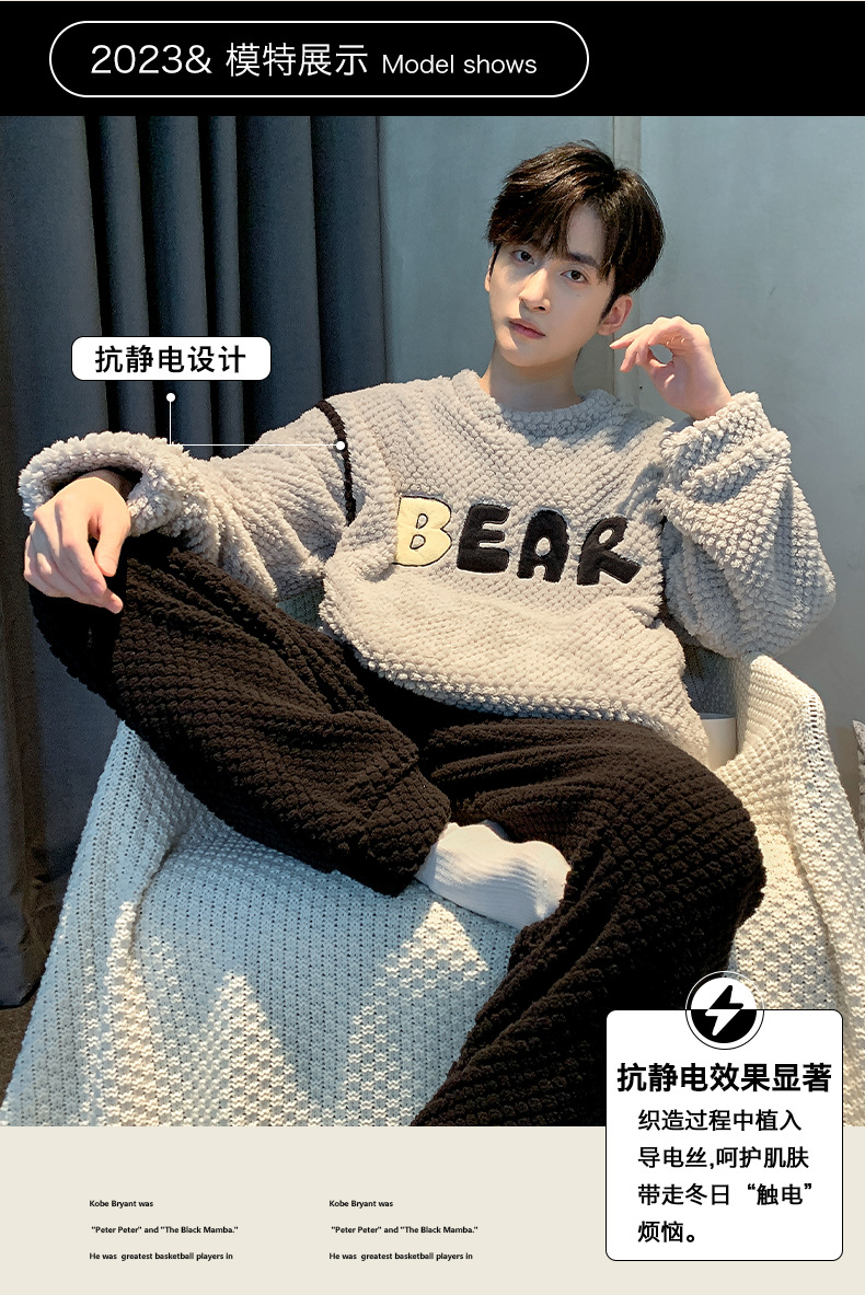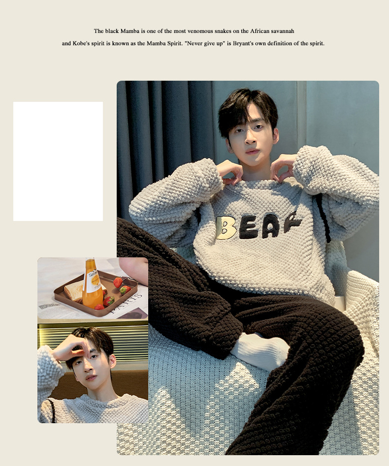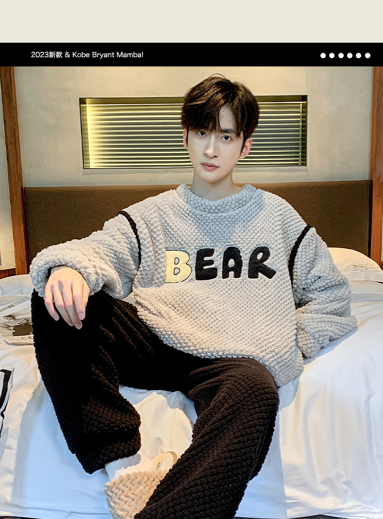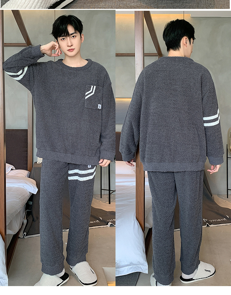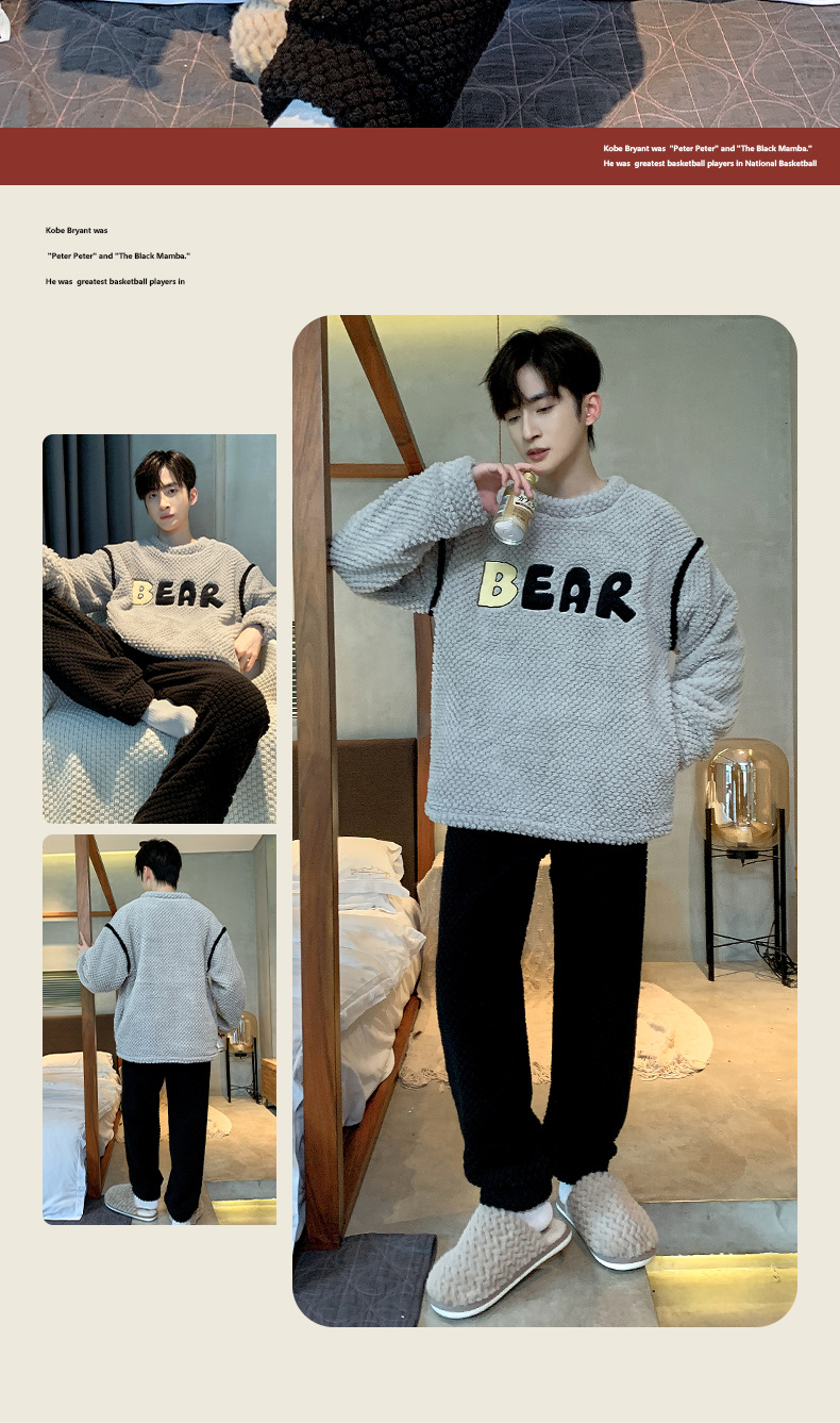 [소프트 하프 벨벳] 남자 잠옷 가을과 겨울 느슨한 두꺼운 산호 양털 가정 옷은 세트 입을 수 있습니다스토어 가기