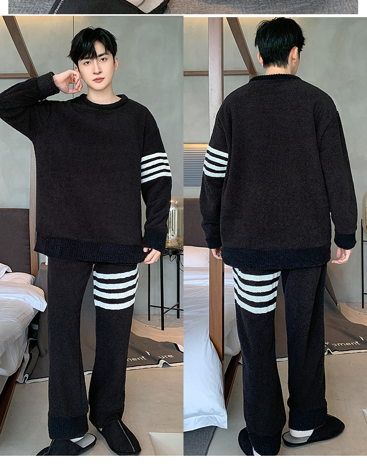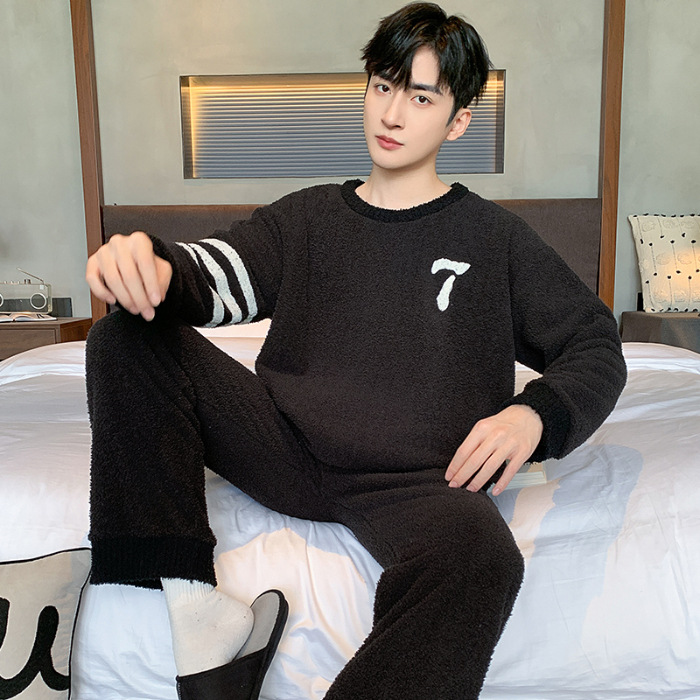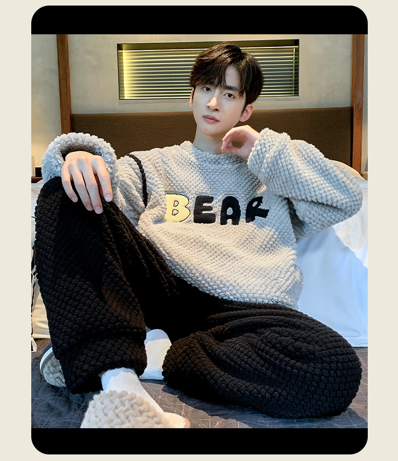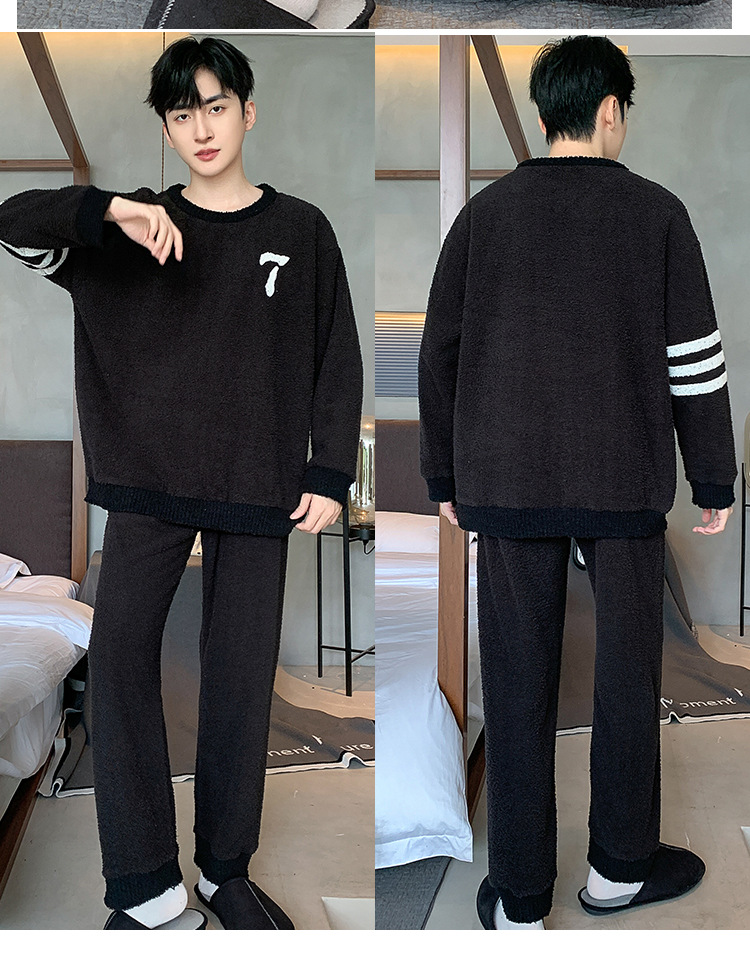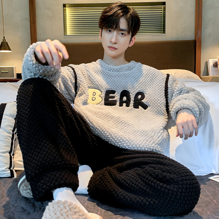 [소프트 하프 벨벳] 남자 잠옷 가을과 겨울 느슨한 두꺼운 산호 양털 가정 옷은 세트 입을 수 있습니다