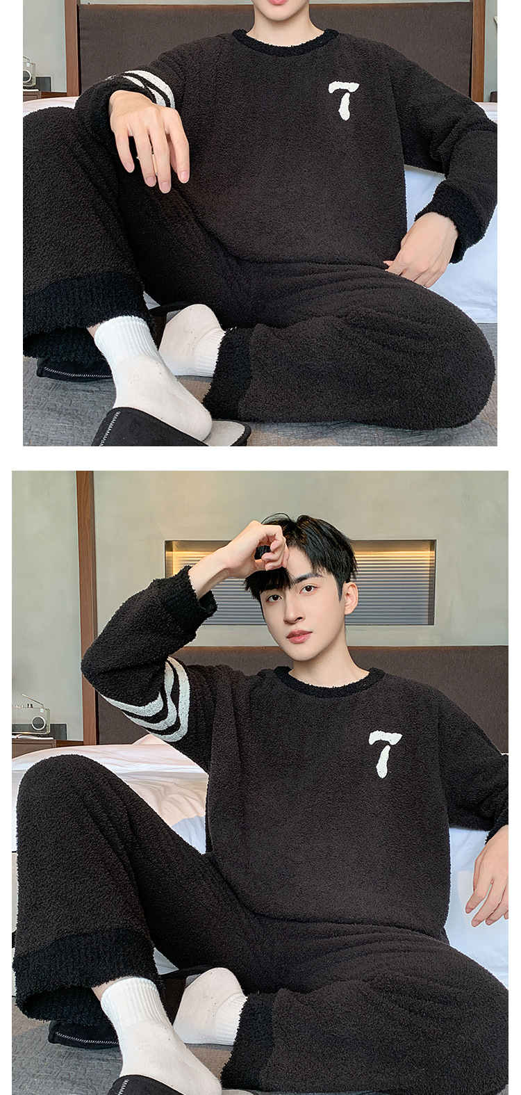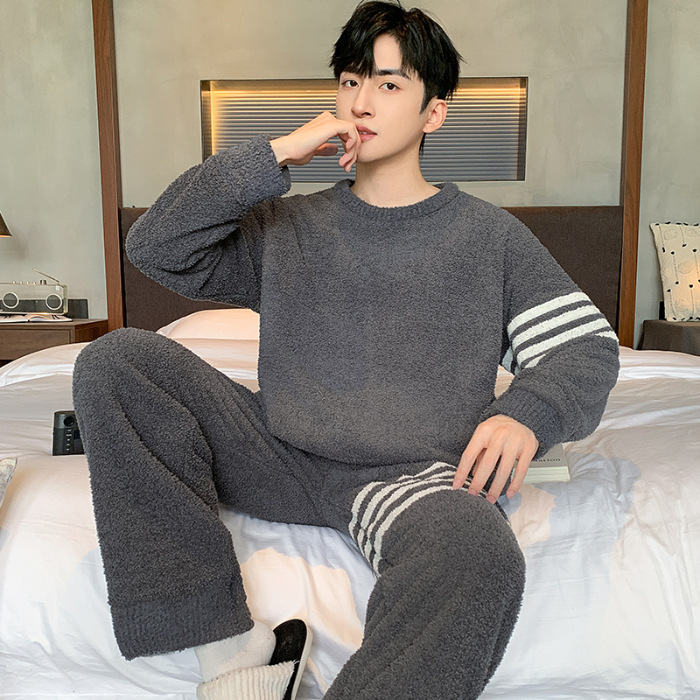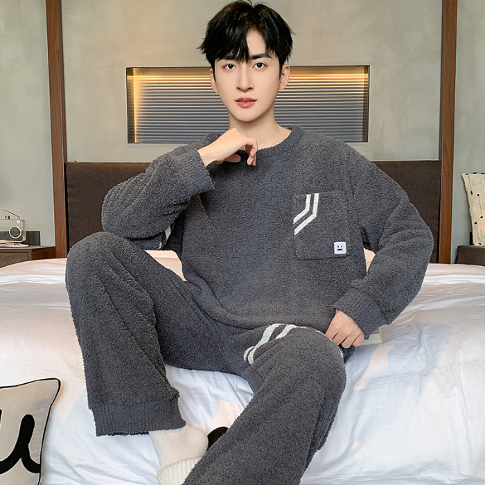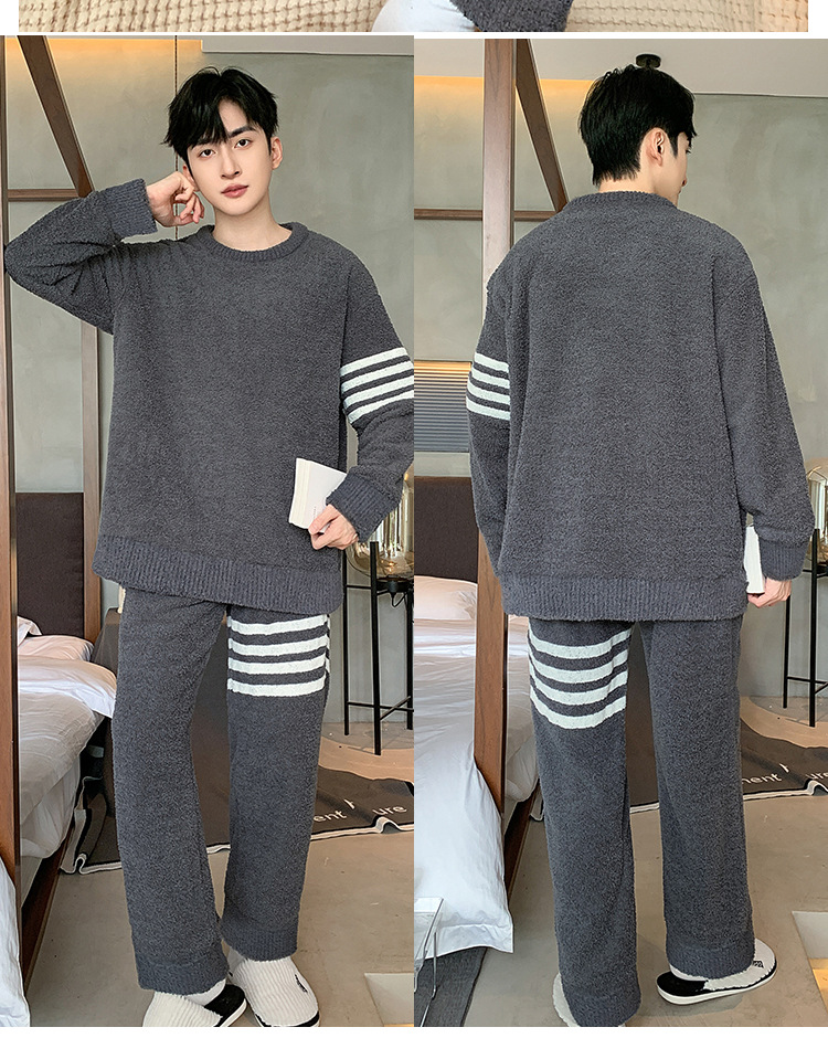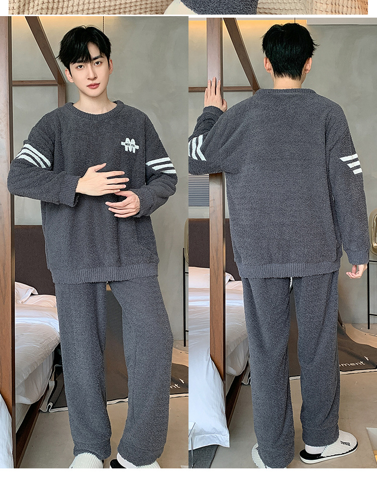 [소프트 하프 벨벳] 남자 잠옷 가을과 겨울 느슨한 두꺼운 산호 양털 가정 옷은 세트 입을 수 있습니다
