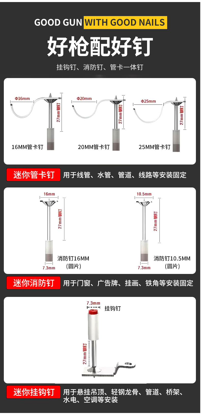 공급 미니 네일 건 홀더 물 및 전기 모니터링 도어 및 창문 파이프 클램프 트렁킹 엘리베이터 설치 소음기 총 못 총