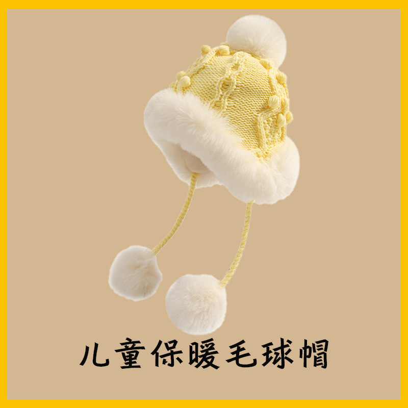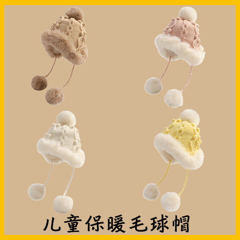 벨벳 따뜻하고 귀여운 모피 볼 모직 모자로 어린이 겨울 귀 보호 모자, 여자 아기를 위한 방풍 귀 보호 니트 바람 및 눈 모자