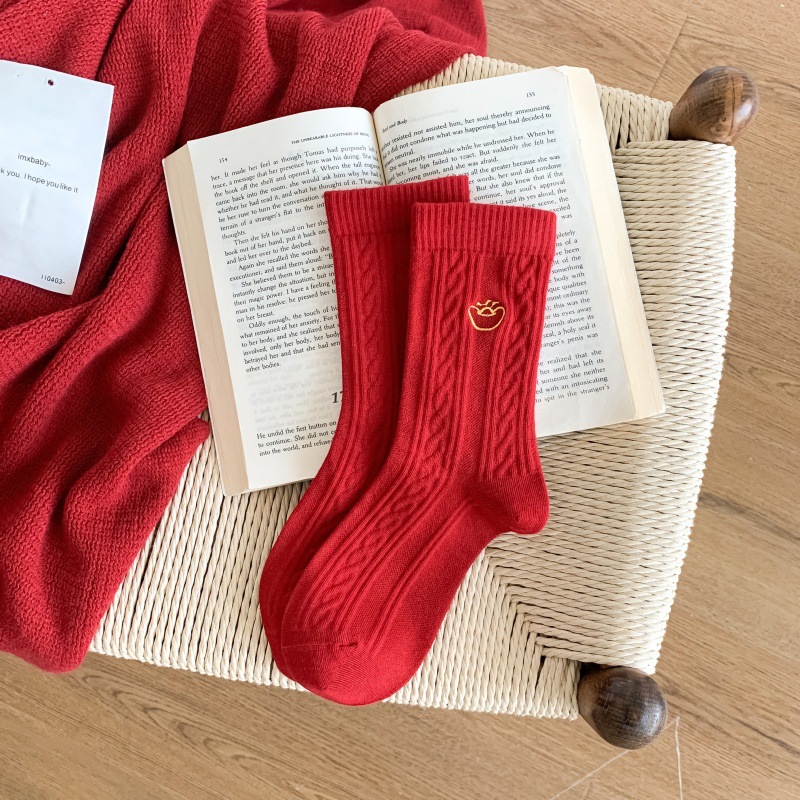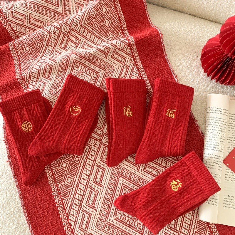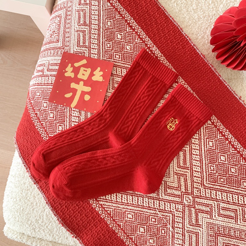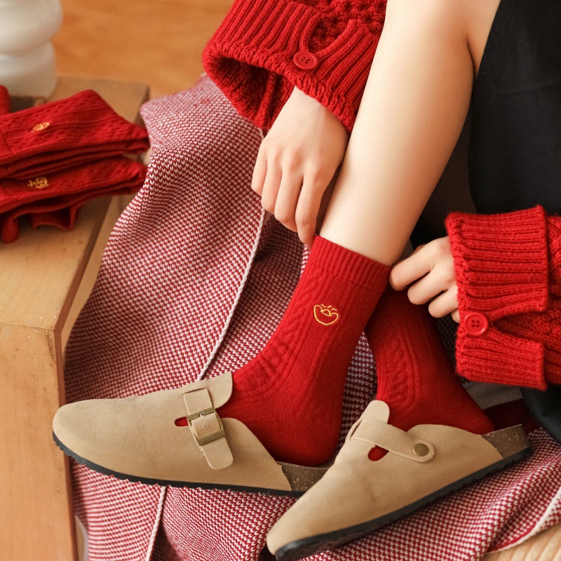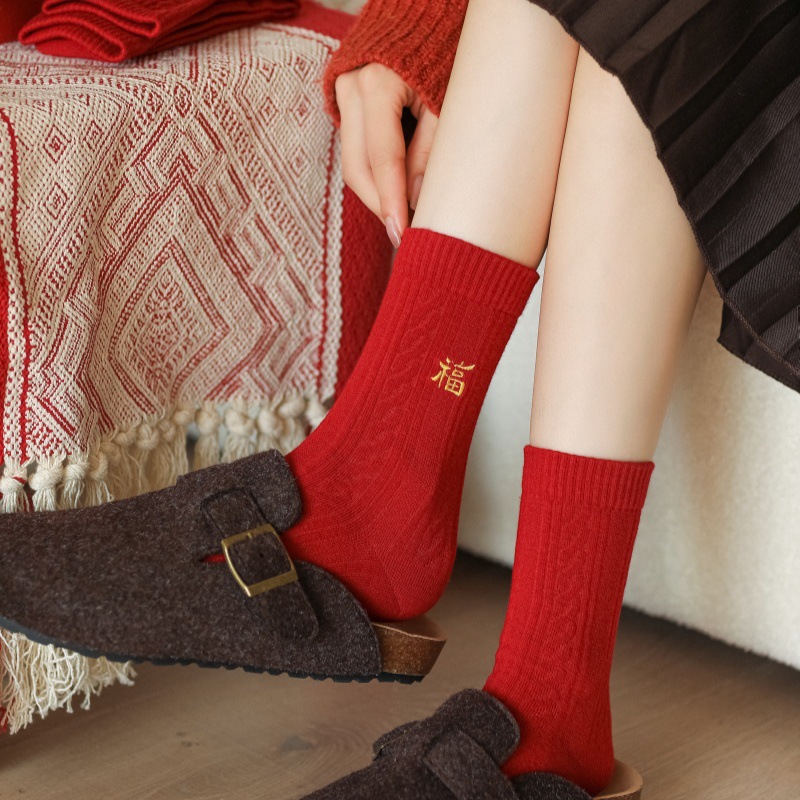 축복받은 빨간 양말 여성용 중간 길이 양말 24 가을 겨울 축제 웨딩 커플 양말 빗질면 스타킹