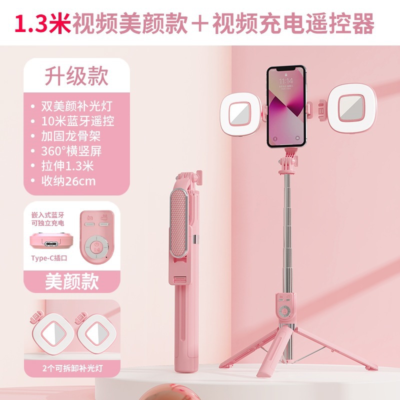 • P86TC 듀얼 필 라이트 모델 핑크 [셀카봉 1.3m 개 + 충전식 다기능 블루투스 리모컨 + 대형 미러 필 라이트 2 개]