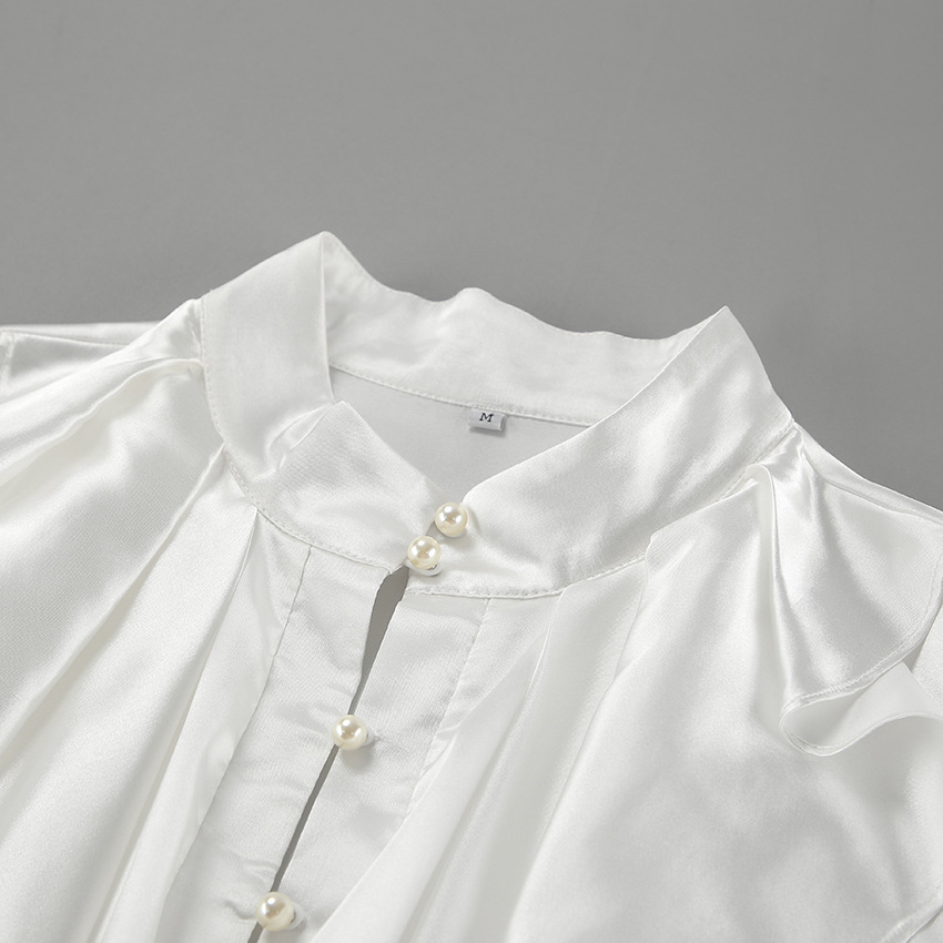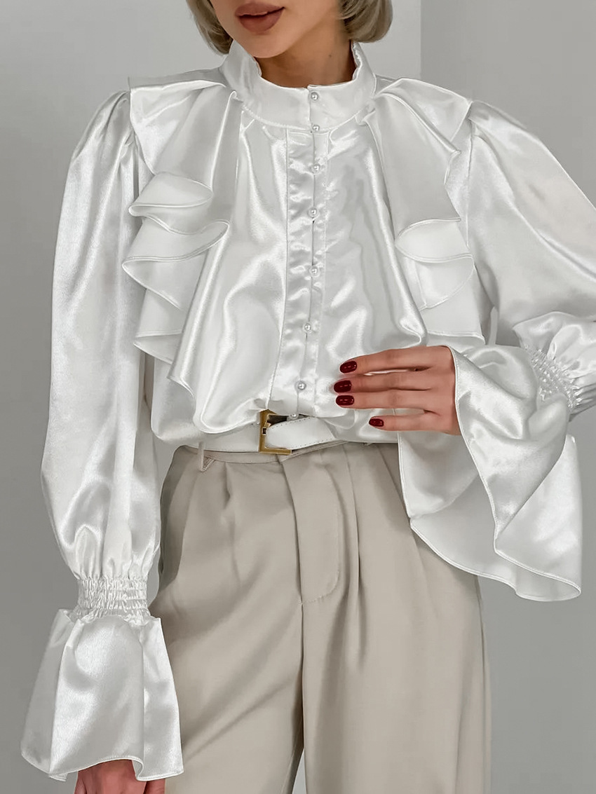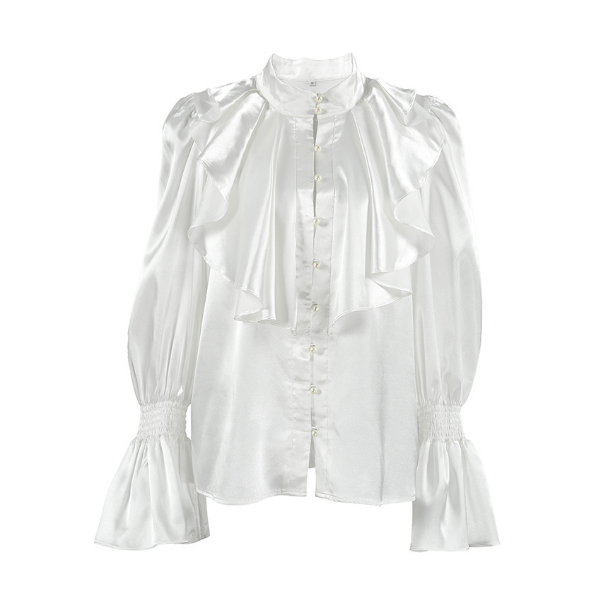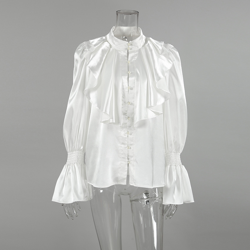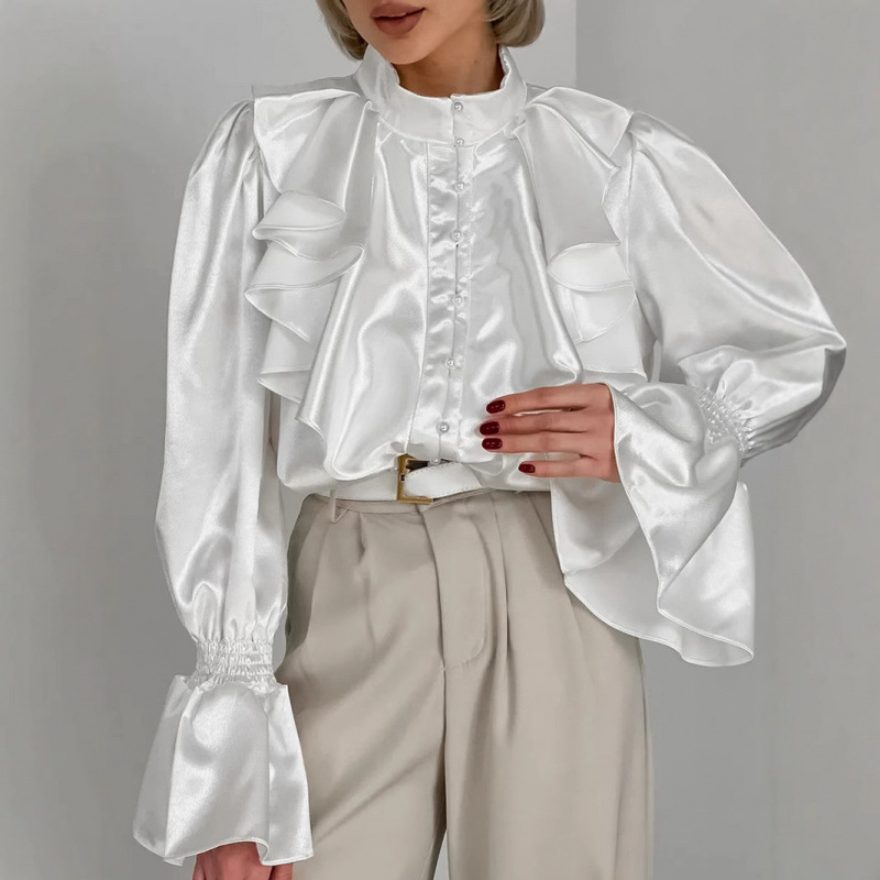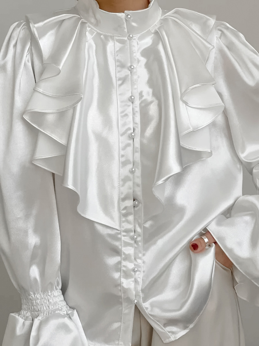 궁전 스타일 주름진 작은 스탠드 칼라 싱글 브레스트 웨스턴 스타일 카디건 가을 광택 호른 소매 느슨한 여성용 탑