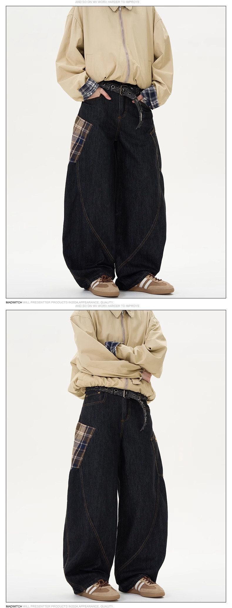 미국 틈새 디자인 센스 바느질 격자 무늬 시미 타르 청바지 남성 봄과 가을 새로운 느슨한 복고풍 캐주얼 바지