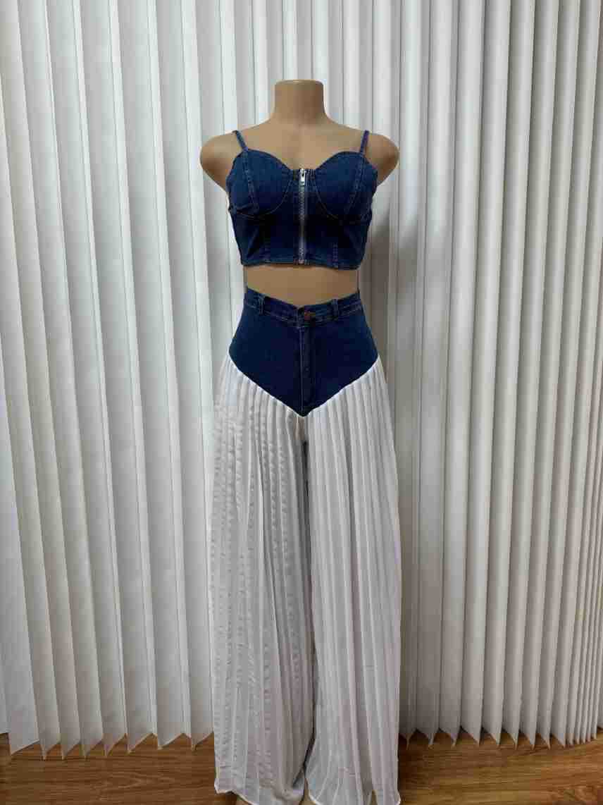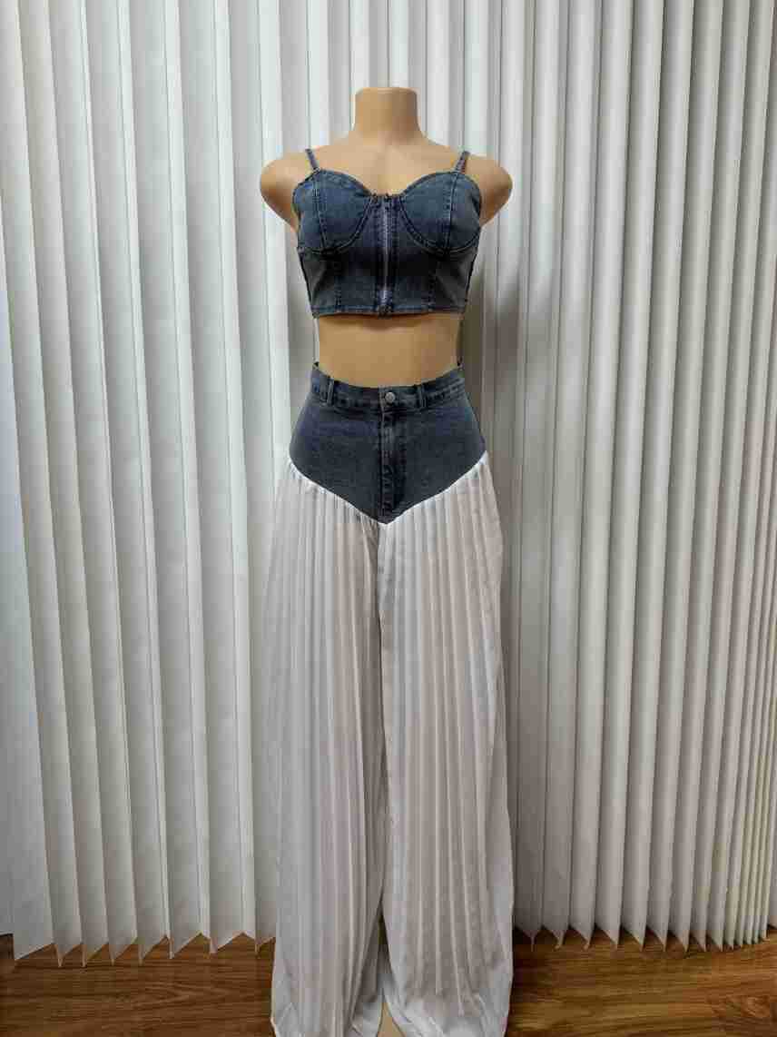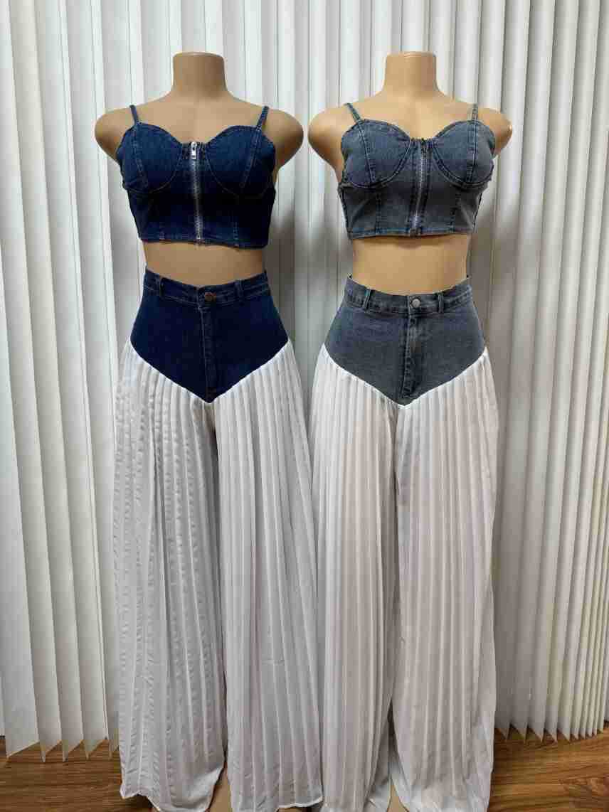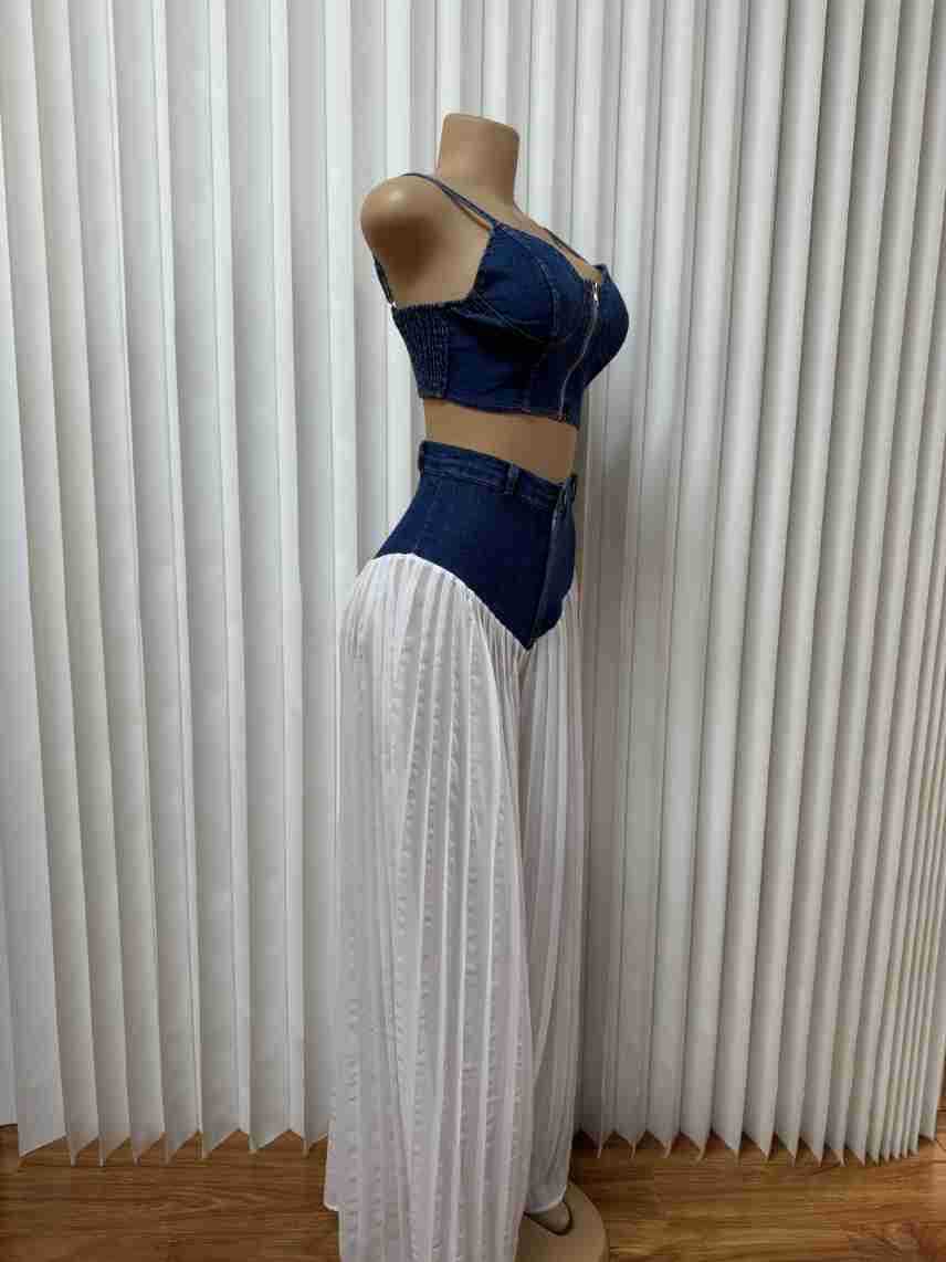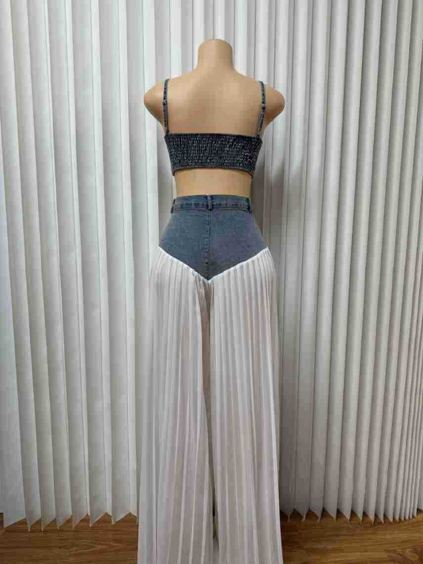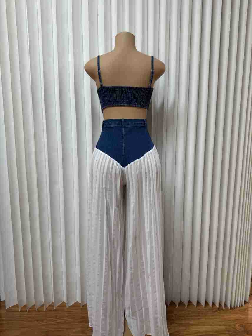 유럽과 미국의 여성 의류 아마존 국경 간 베스트셀러 새로운 멜빵 V-neck 조끼 주름 데님 쉬폰 바지 세트