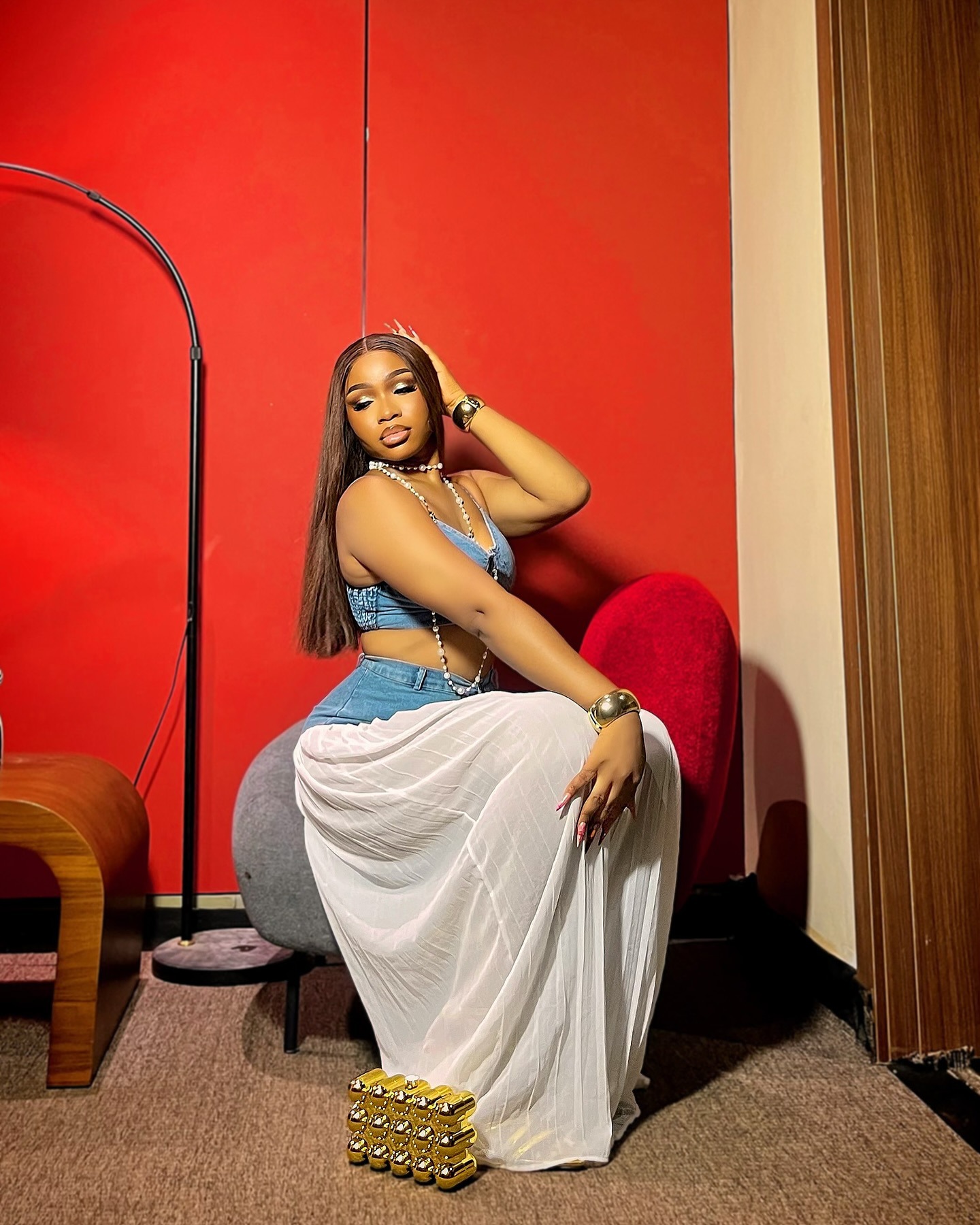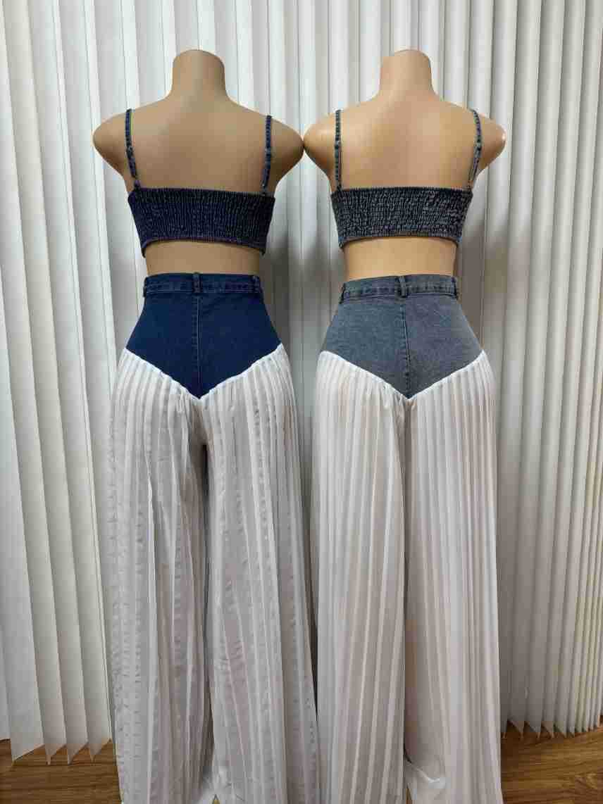 유럽과 미국의 여성 의류 아마존 국경 간 베스트셀러 새로운 멜빵 V-neck 조끼 주름 데님 쉬폰 바지 세트스토어 가기