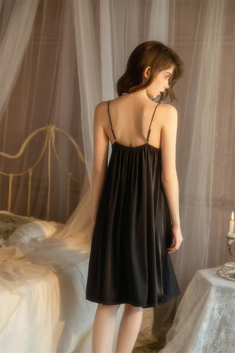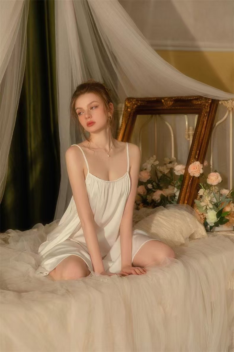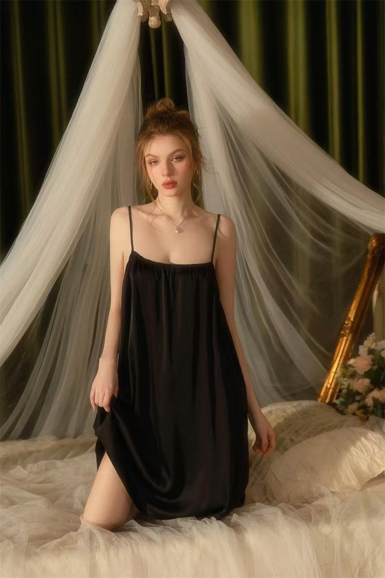 여성용 플러스 사이즈 잠옷, 얇은 등이 없는 서스펜더 스커트, 여성용 순수한 섹시 스타일, 뚱뚱한 여성용 홈웨어, 중간 길이 잠옷, 얇은 어깨끈 잠옷스토어 가기