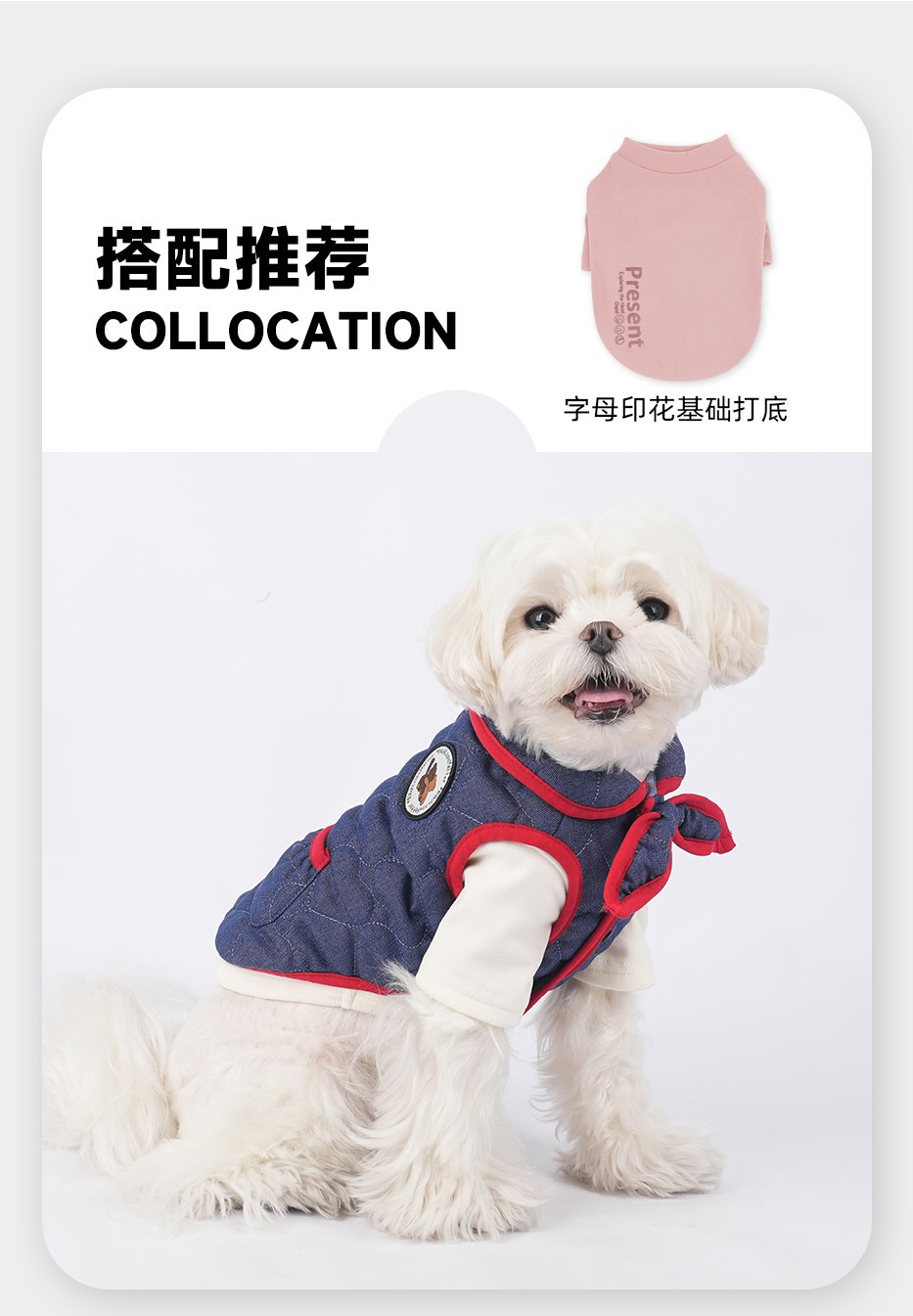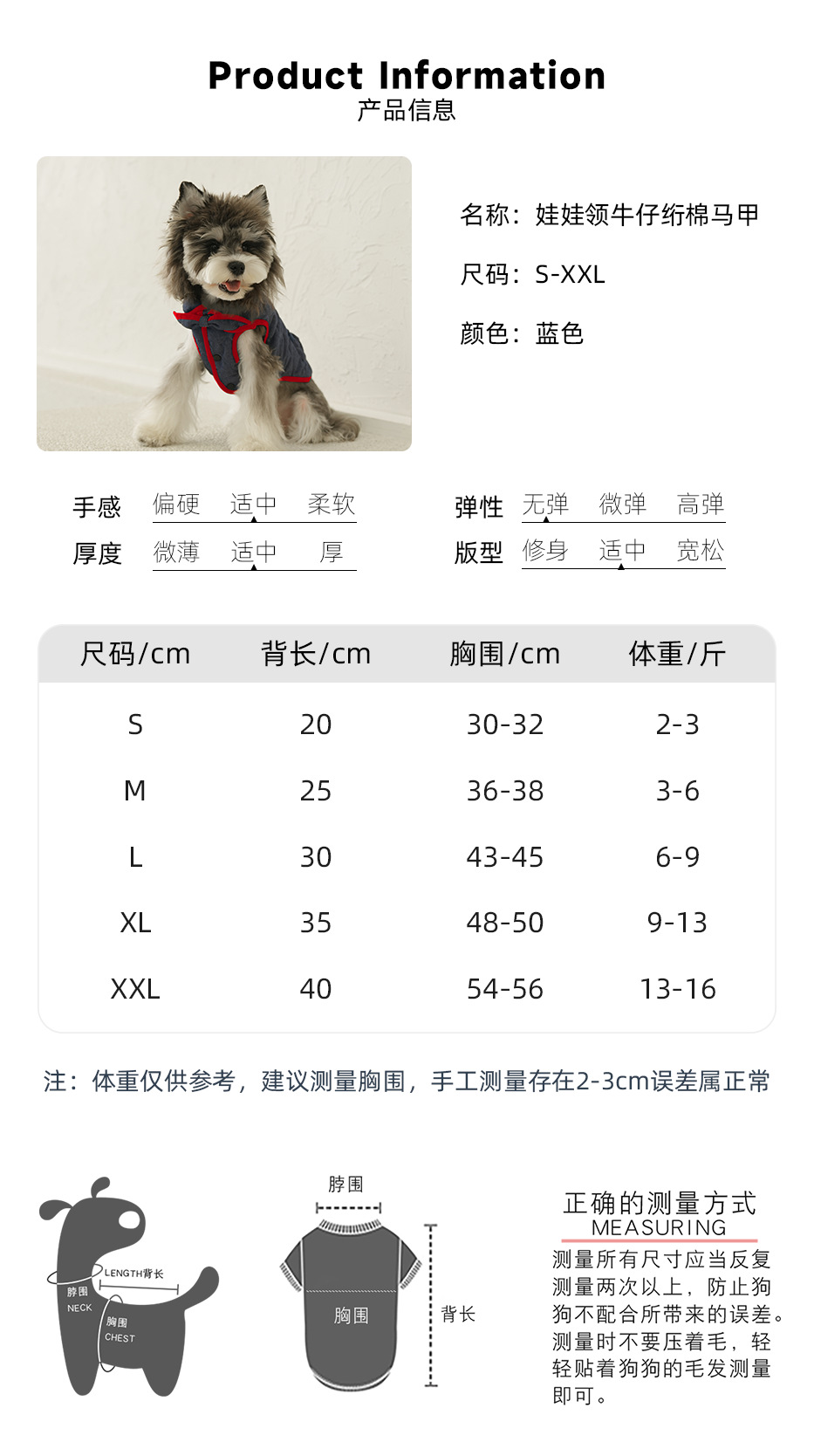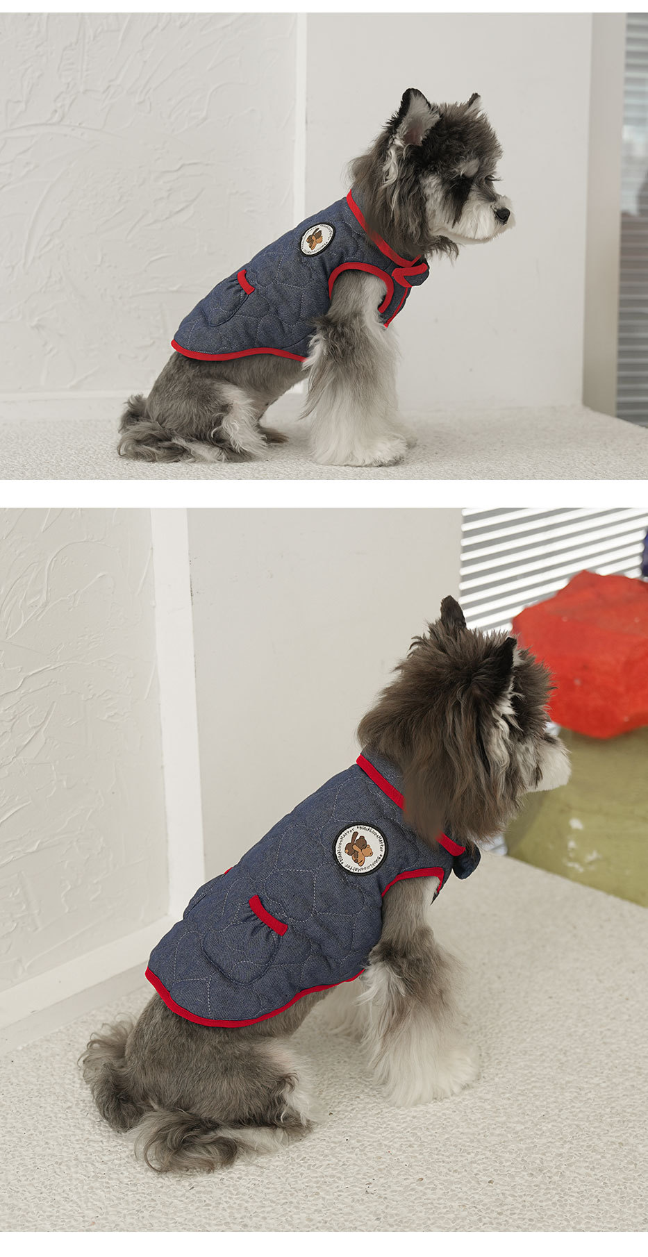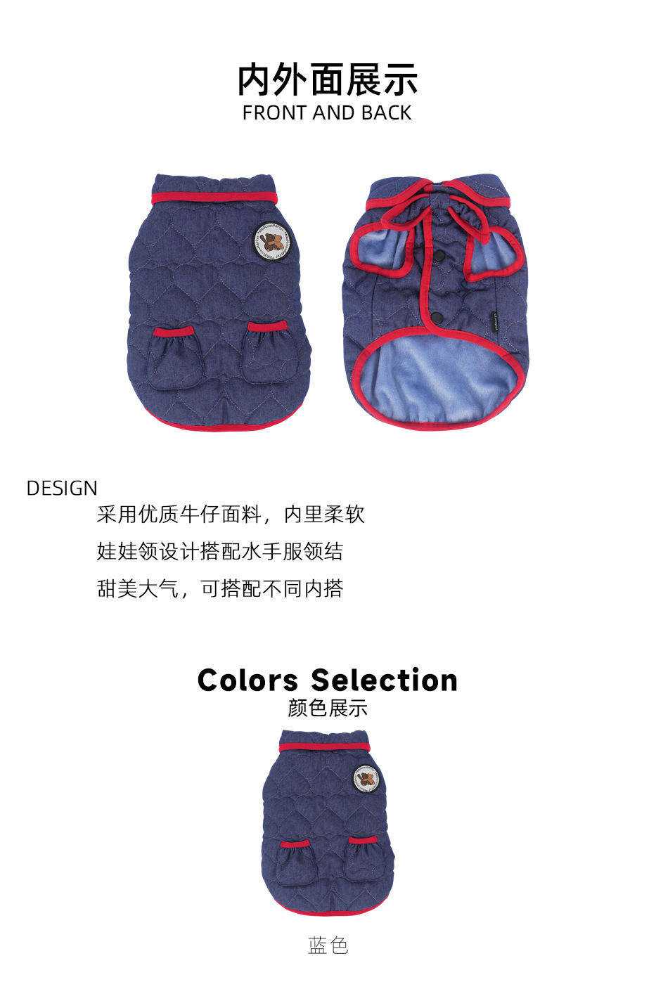 가을과 겨울 새로운 강아지 의류 인형 칼라 대조 컬러 데님 조끼 작은 개 두 다리 면 패딩 재킷 애완 동물 의류스토어 가기