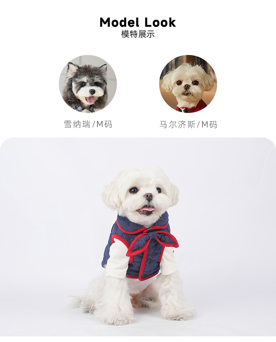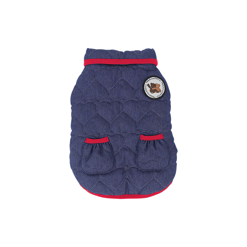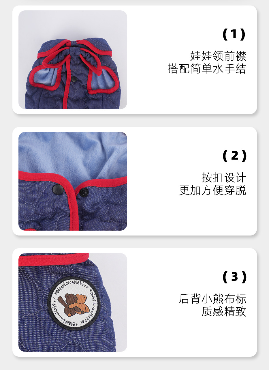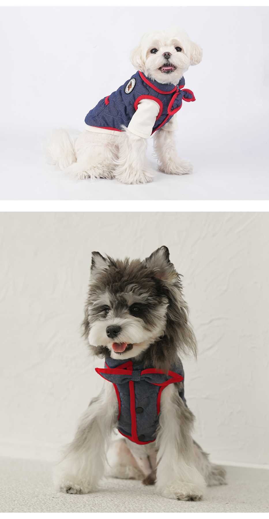 가을과 겨울 새로운 강아지 의류 인형 칼라 대조 컬러 데님 조끼 작은 개 두 다리 면 패딩 재킷 애완 동물 의류스토어 가기