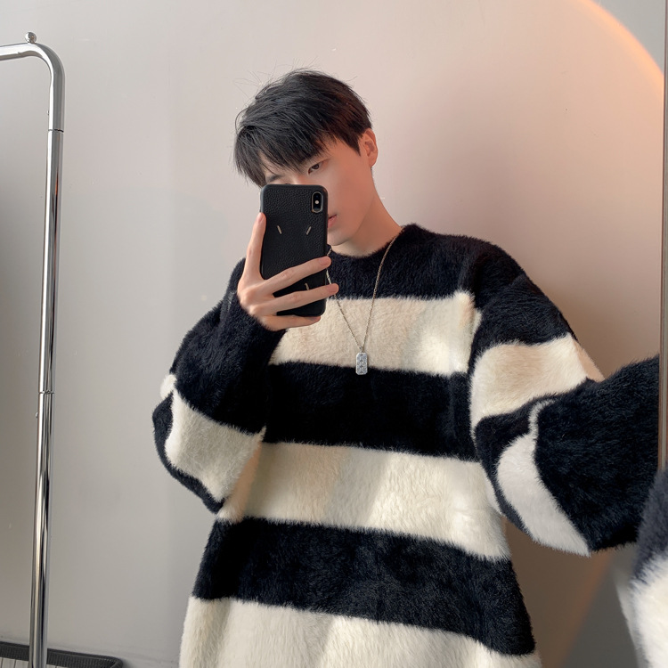 모조 해마 헤어 흑백 스트라이프 스웨터 남성 가을과 겨울 하이 엔드 소프트 왁스 같은 미국식 오버 사이즈 게으른 스웨터