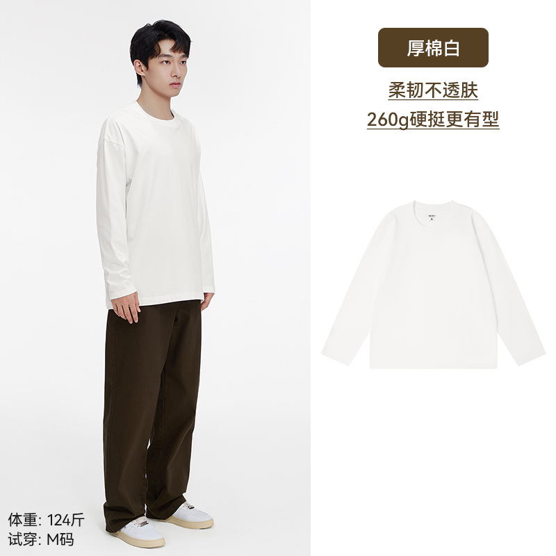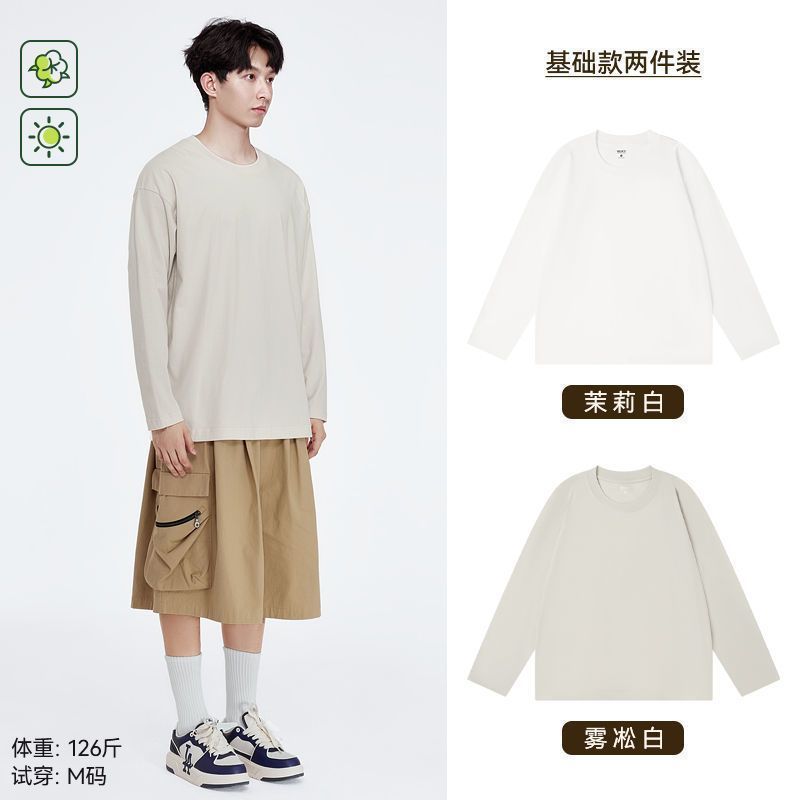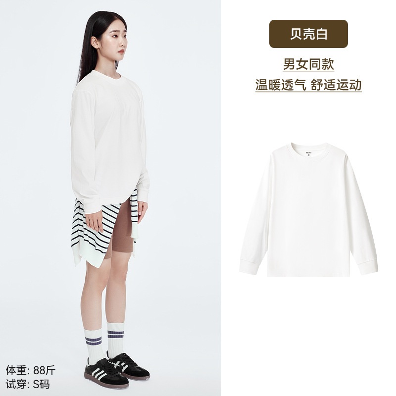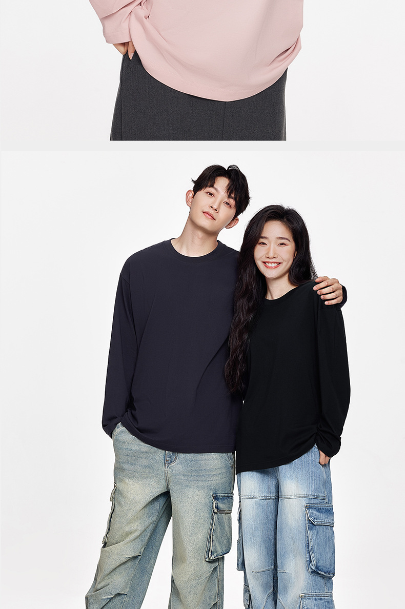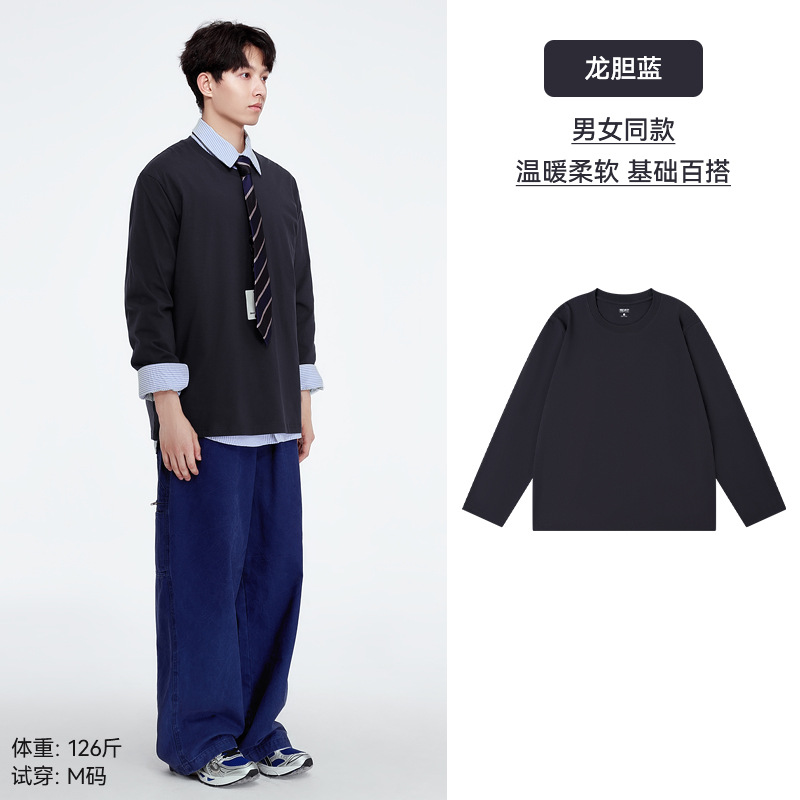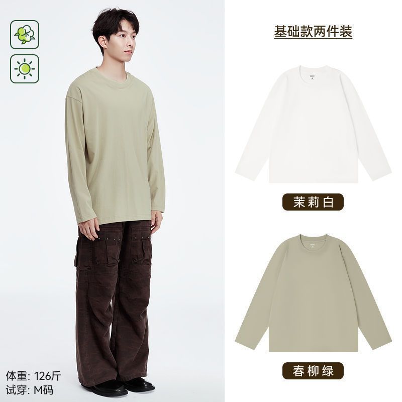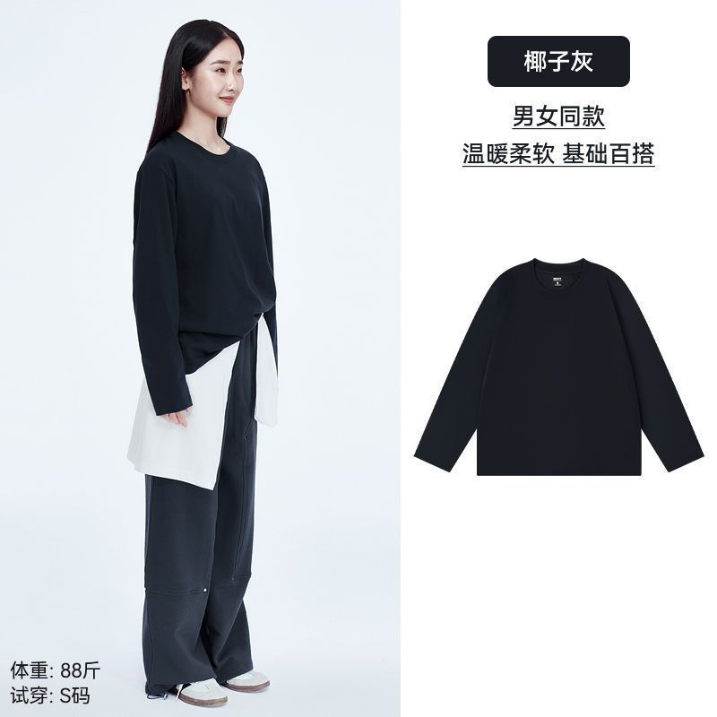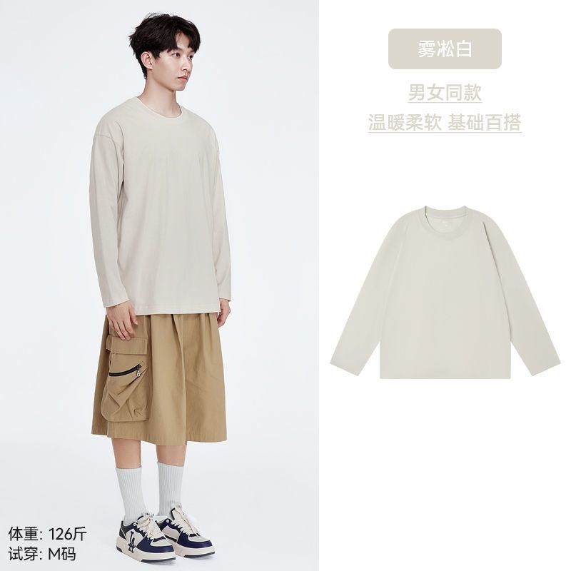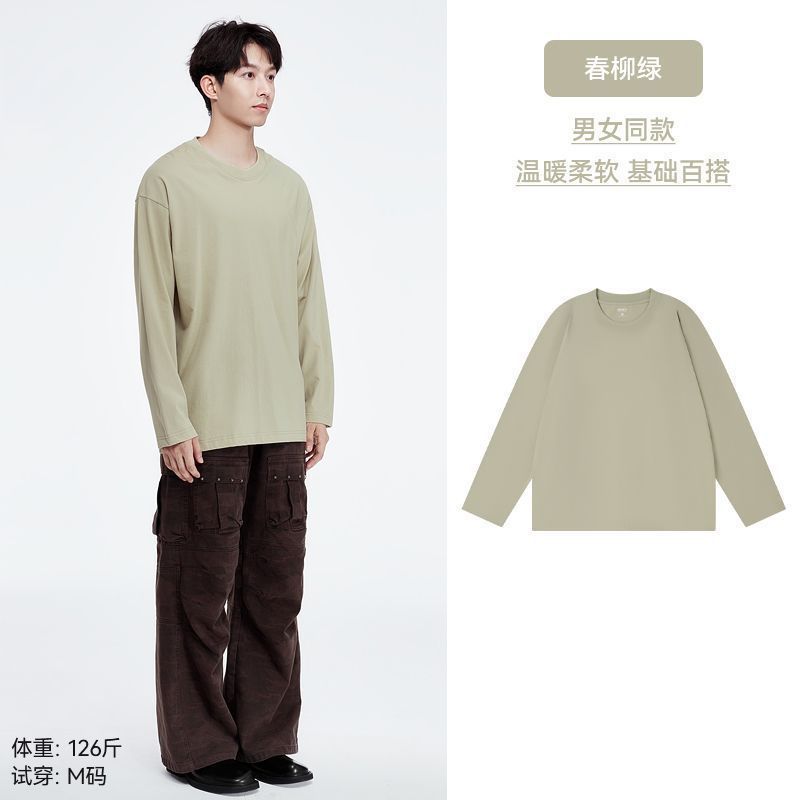 "면화의 미학" 중량순면 긴팔 티셔츠 남자 초가을 단색 느슨한 크루 넥 탑 남녀 베이스 셔츠