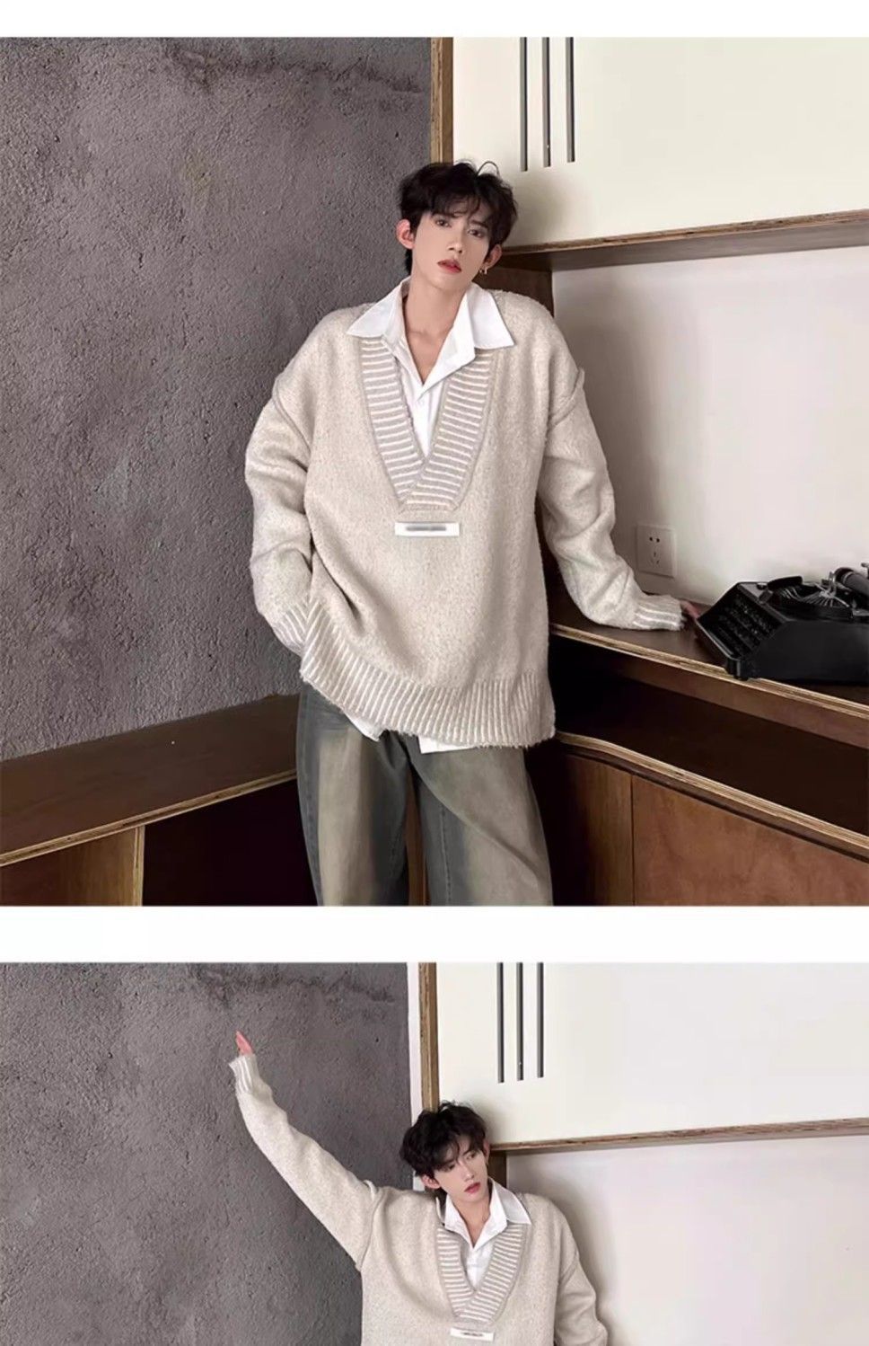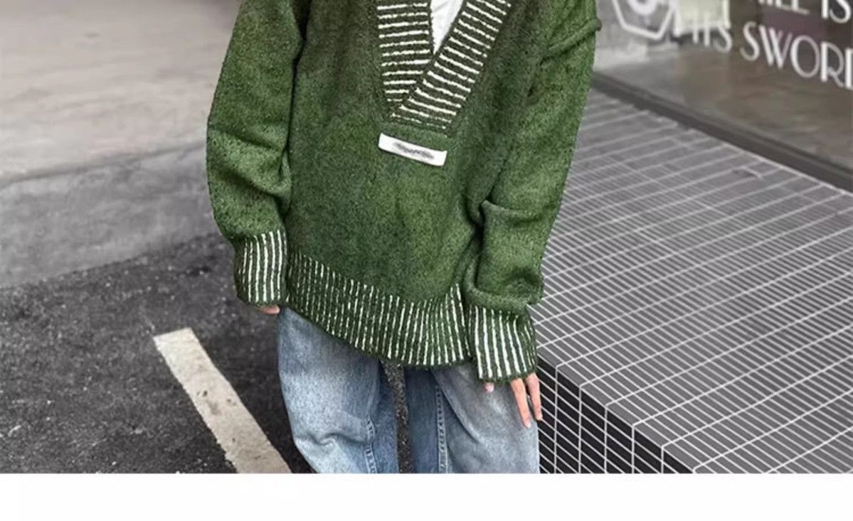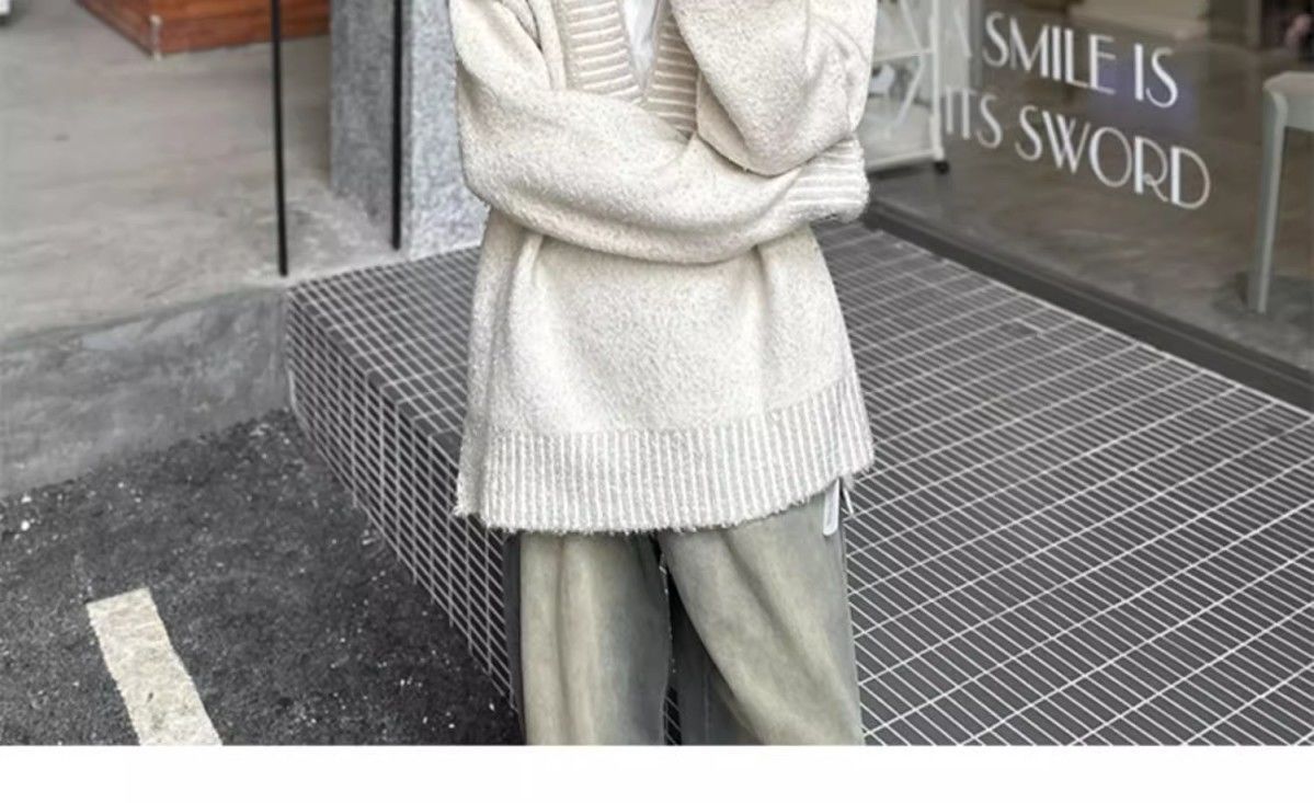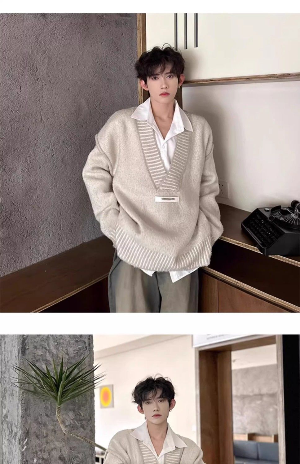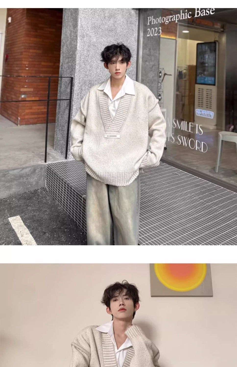 살구색 V 넥 스웨터 남성 아메리칸 스타일 커플 스웨터 복고풍 게으른 스타일 로우 칼라 코트 오버 사이즈스토어 가기