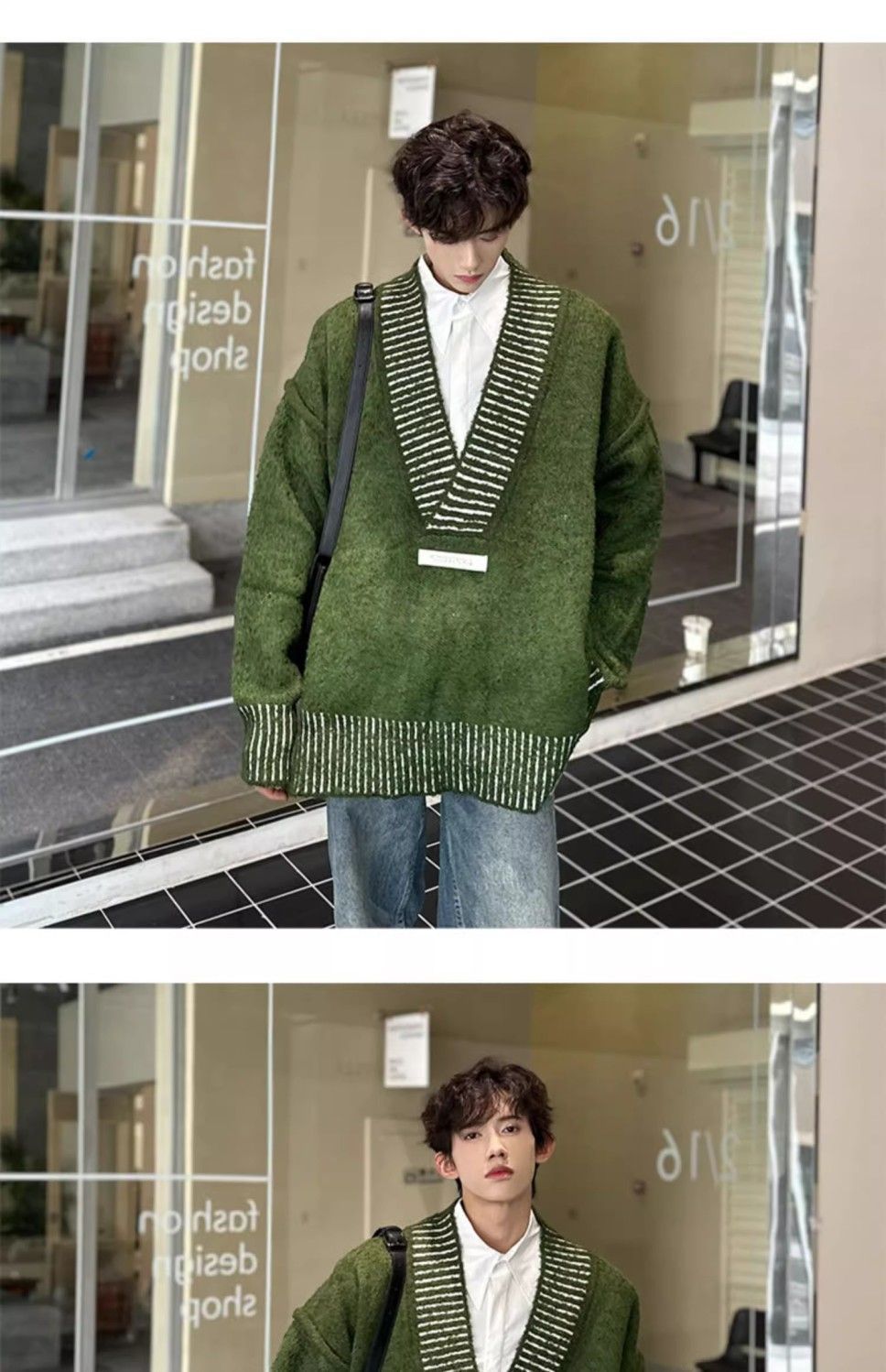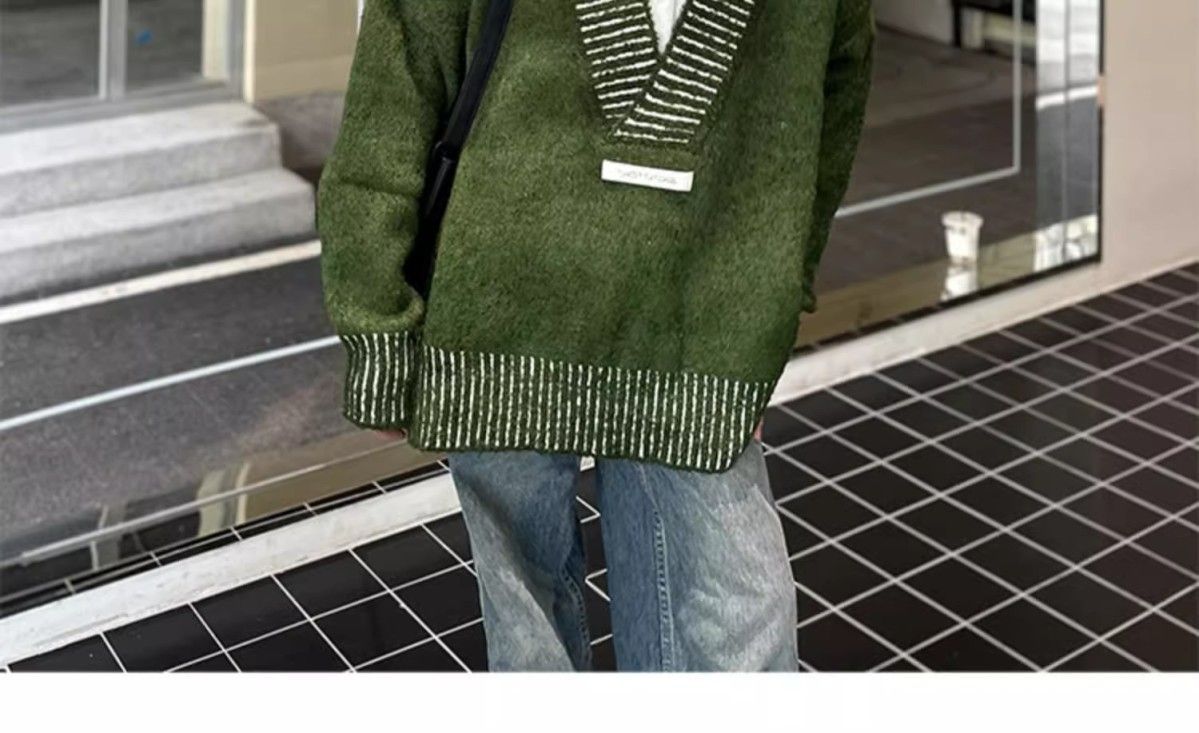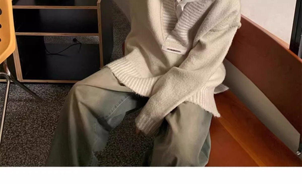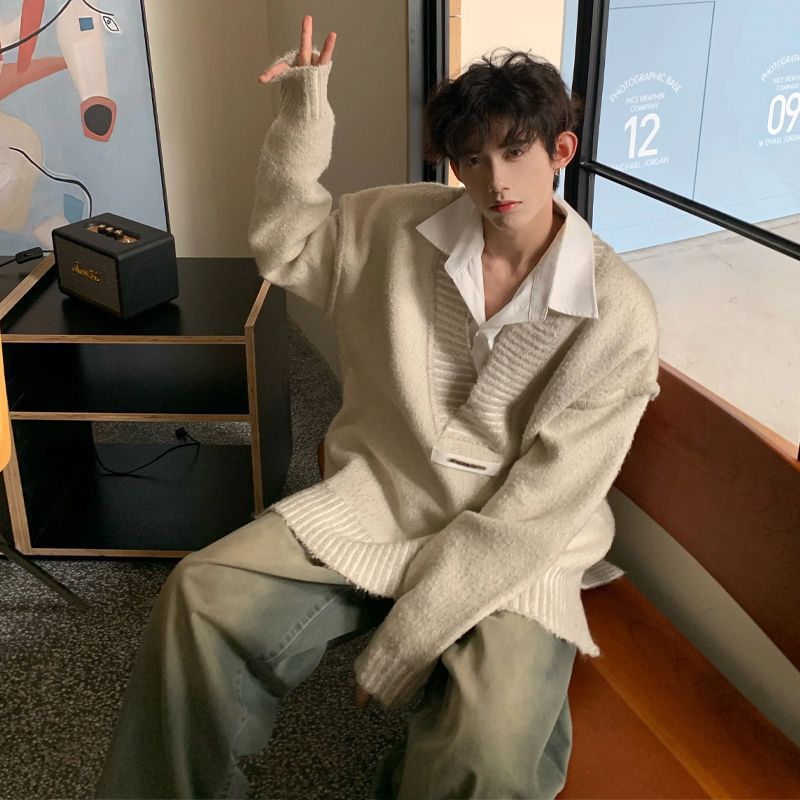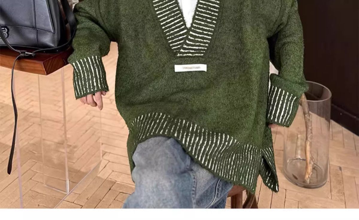 살구색 V 넥 스웨터 남성 아메리칸 스타일 커플 스웨터 복고풍 게으른 스타일 로우 칼라 코트 오버 사이즈스토어 가기