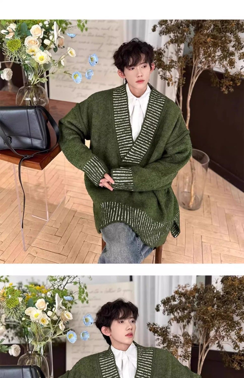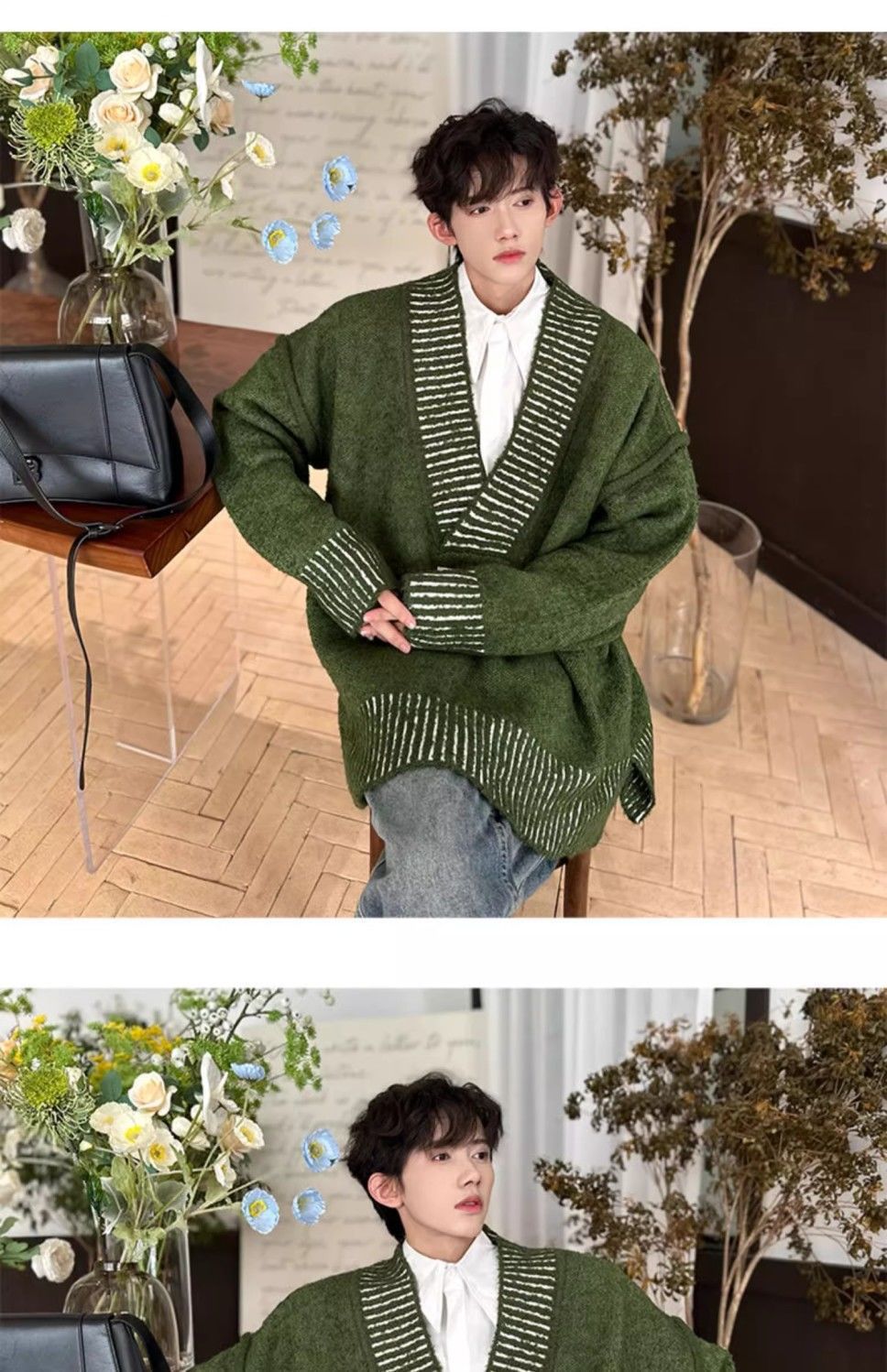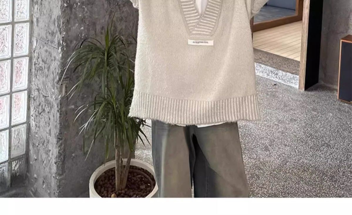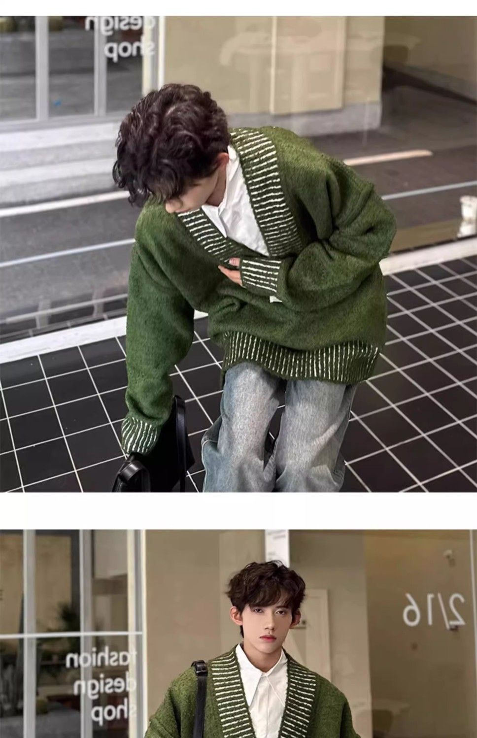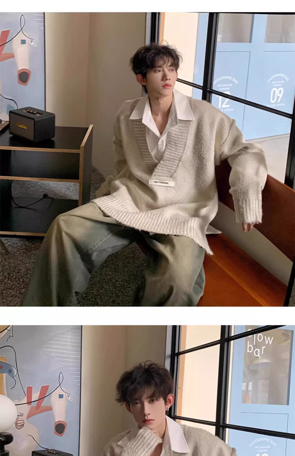 살구색 V 넥 스웨터 남성 아메리칸 스타일 커플 스웨터 복고풍 게으른 스타일 로우 칼라 코트 오버 사이즈스토어 가기