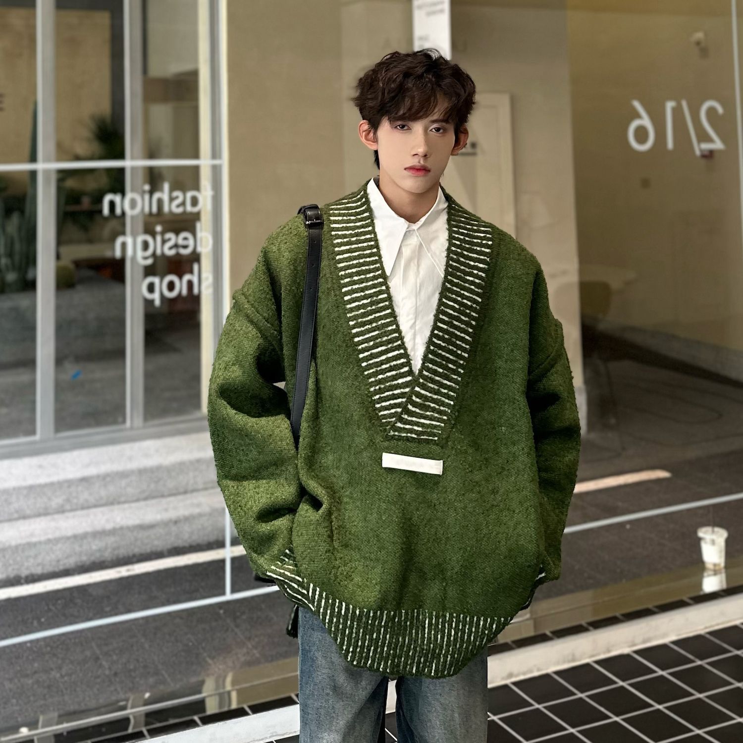 살구색 V 넥 스웨터 남성 아메리칸 스타일 커플 스웨터 복고풍 게으른 스타일 로우 칼라 코트 오버 사이즈