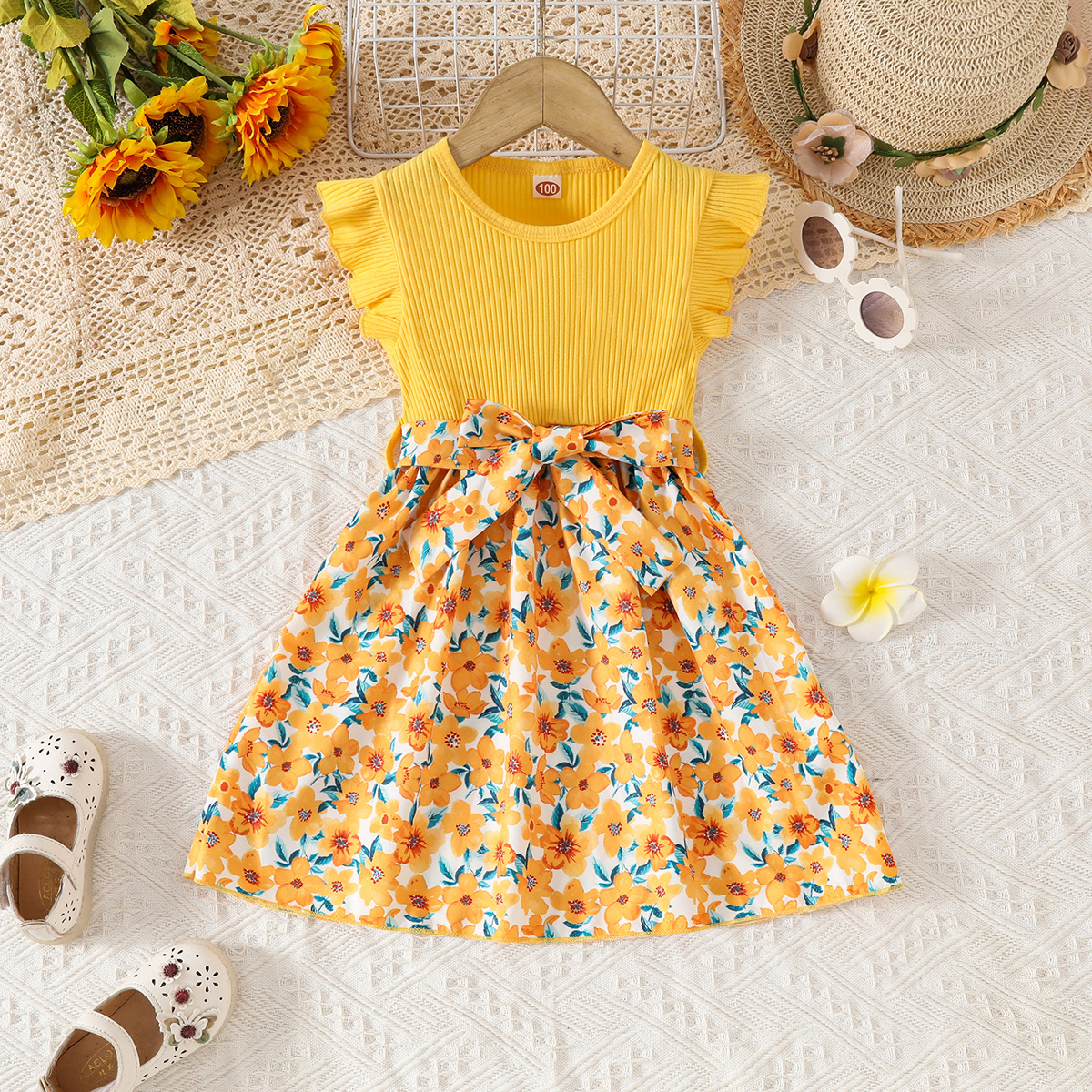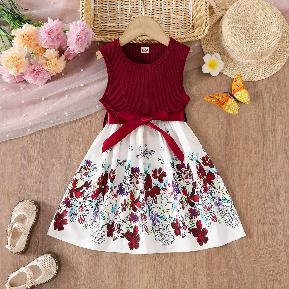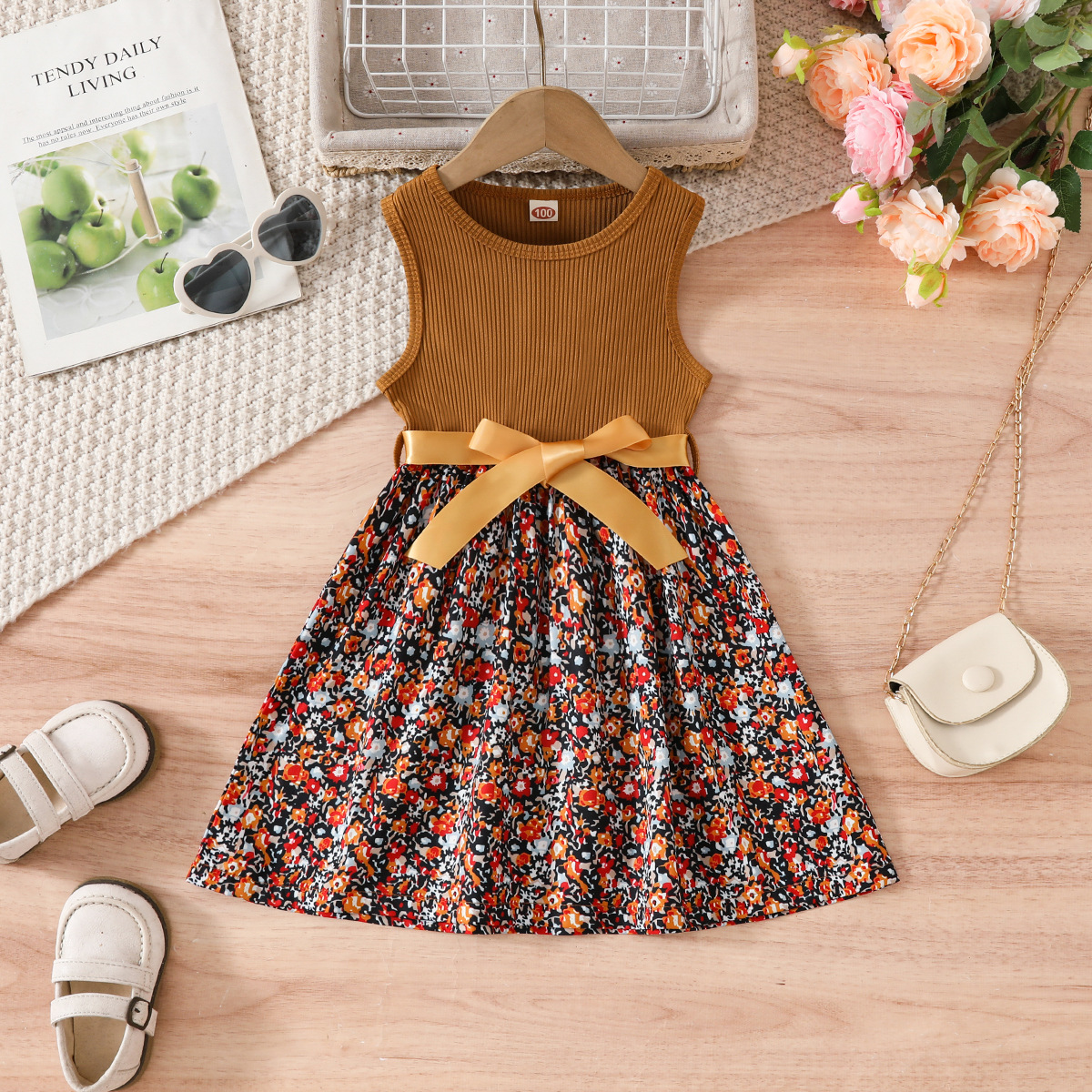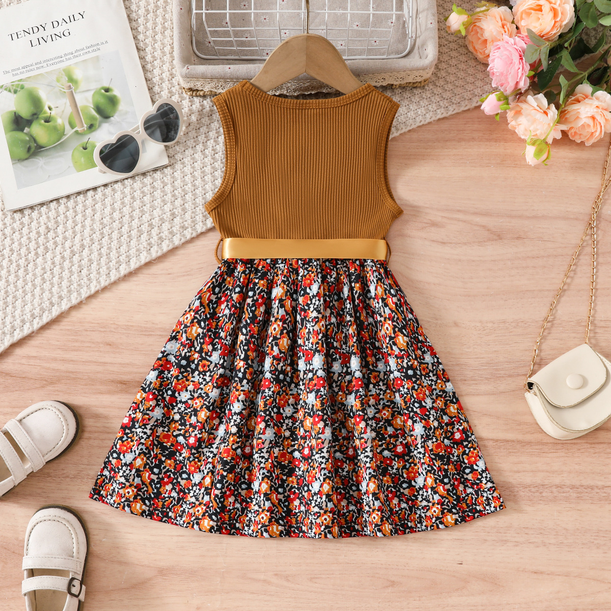 국경 간 대외 무역 어린이 민소매 둥근 목 목가적 인 작은 꽃 원피스 벨트 2 피스 세트