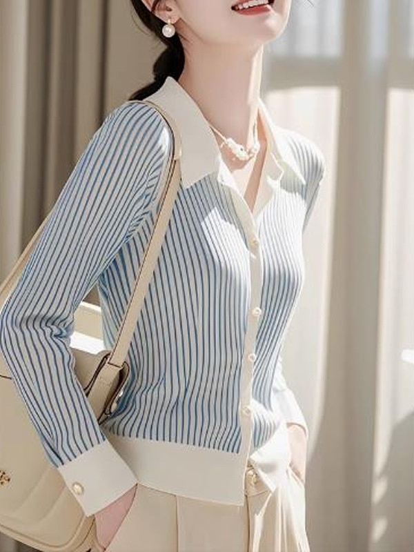 올해 인기있는 아름다운 파란색 줄무늬 셔츠 여성의 초가을 새로운 외국 스타일의 고급 세련된 프랑스 독특한 작은 탑