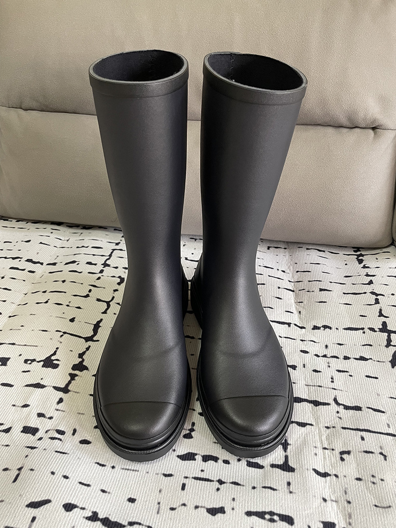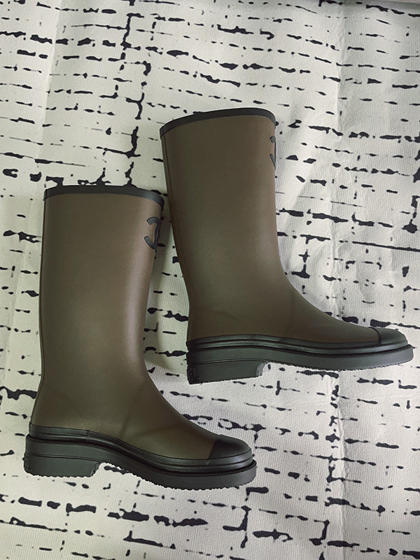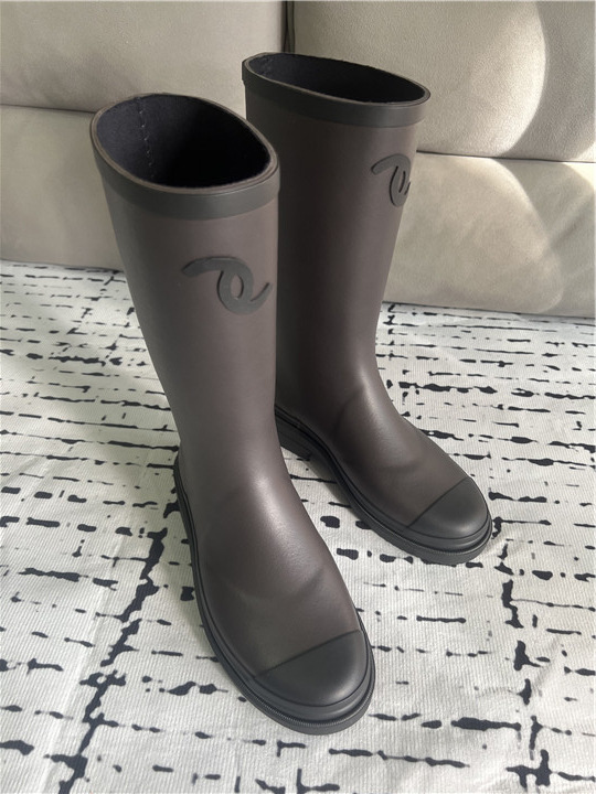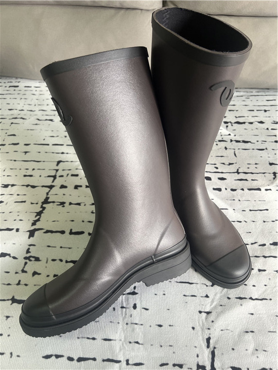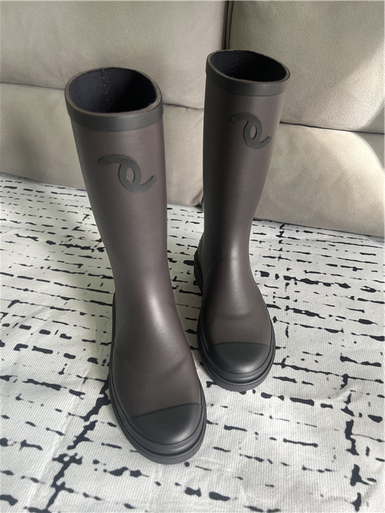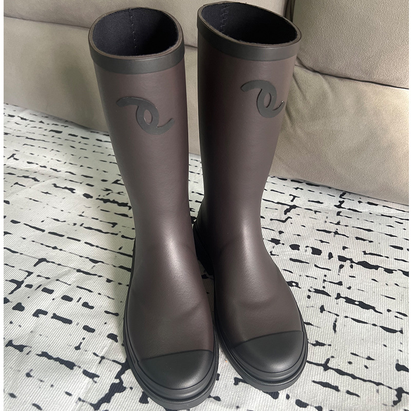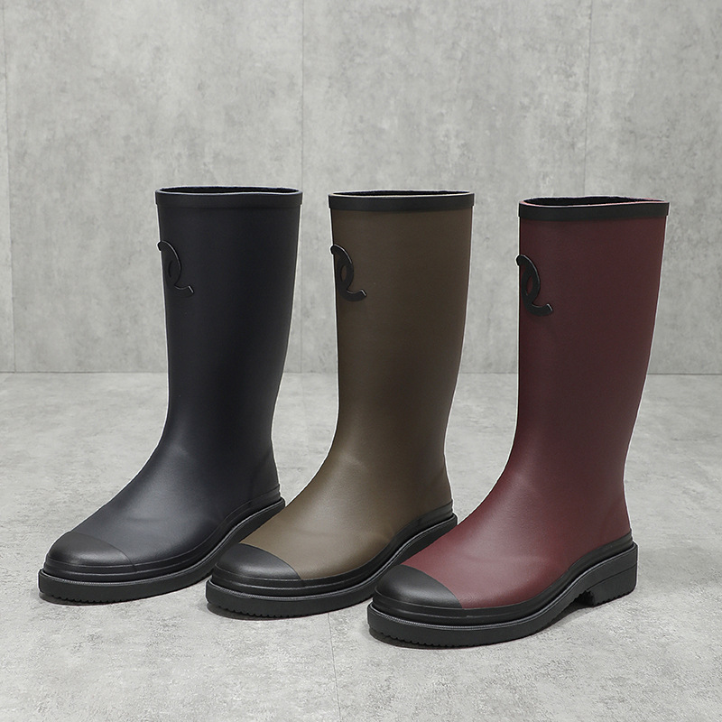 어두운 다크 브라운 방수 라운드 헤드 슬리브 여성용 컬러 블록 원활한 샤넬 스타일 고무 장화스토어 가기