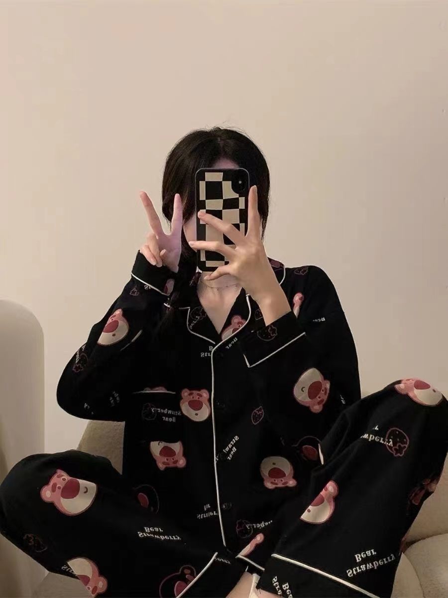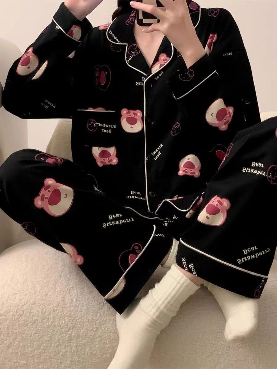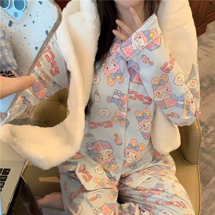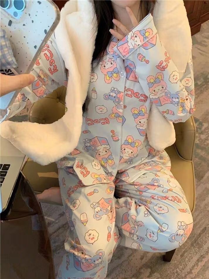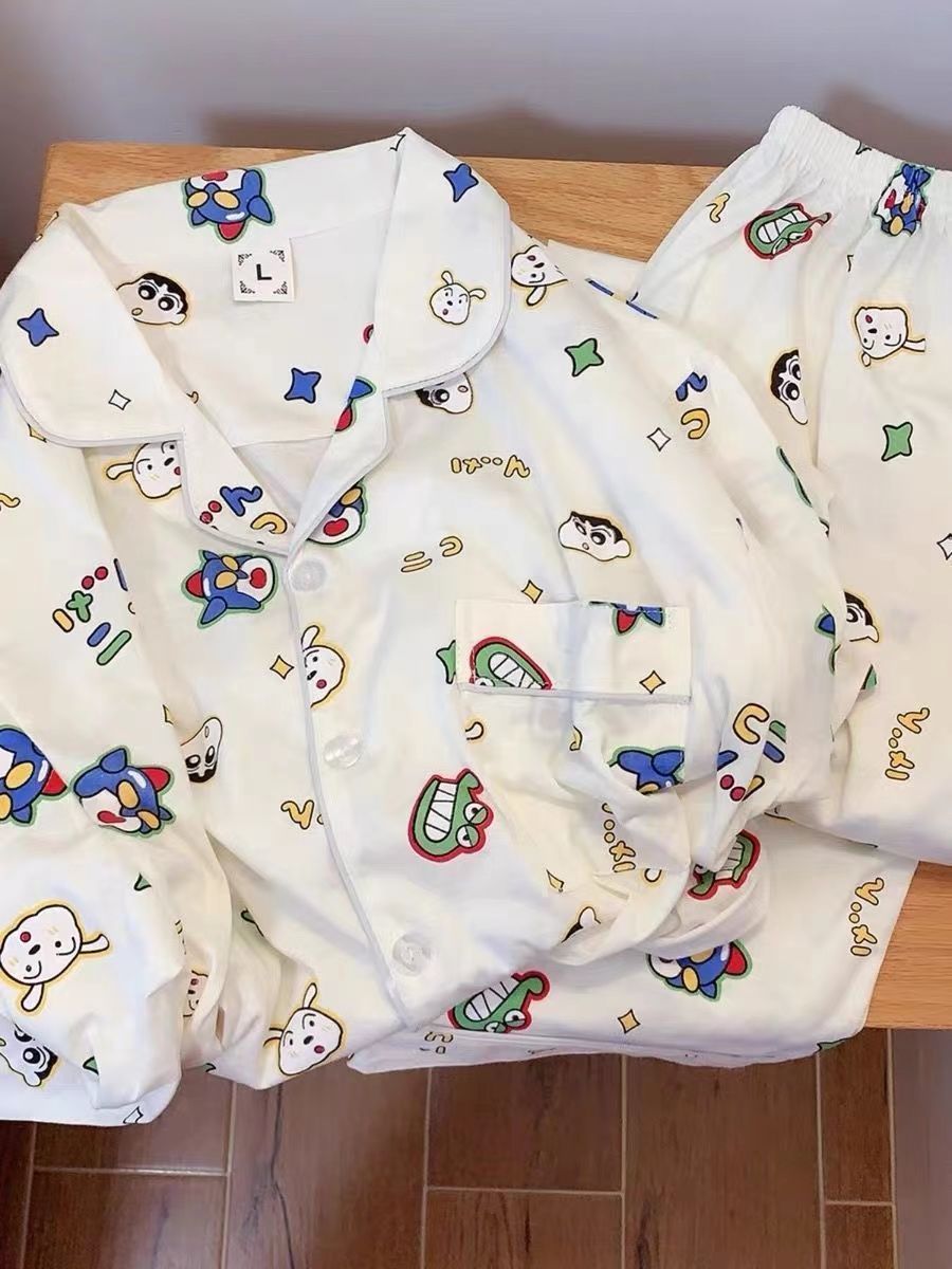 300kg 플러스 사이즈 크레용 작은 새 잠옷 가을/겨울 긴 소매 느슨한 달콤한 만화 애니메이션 학생들은 홈 옷을 입고