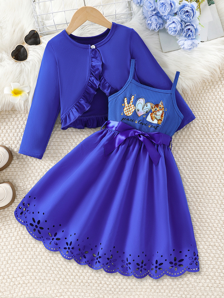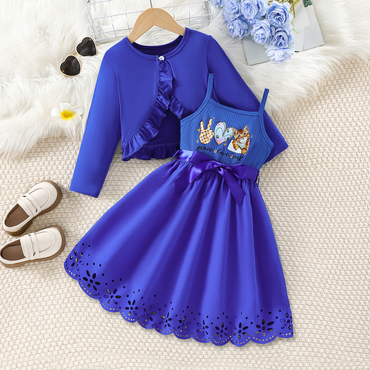소녀 원피스 세트 블루 긴팔 니트 자켓 나무 귀 슬립 스커트 동물 패턴 어린이 투피스 세트스토어 가기