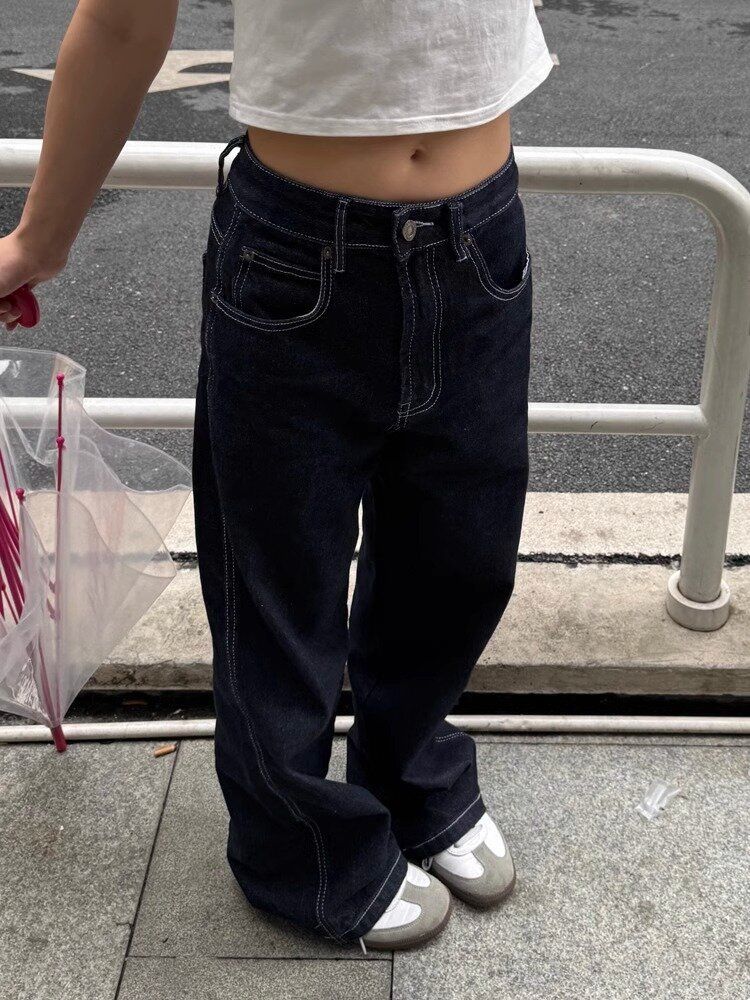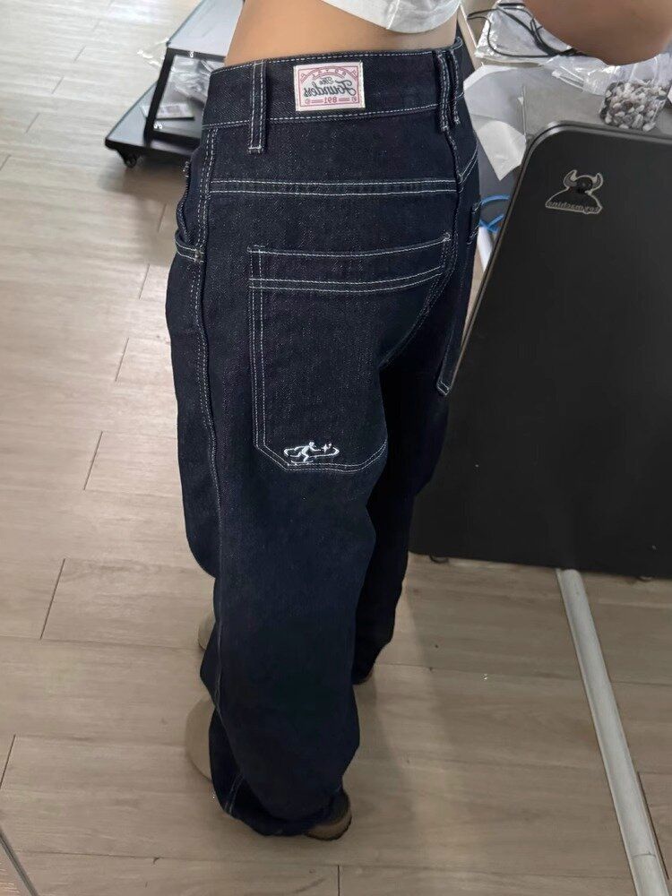 플러스 사이즈 아메리칸 스타일 레트로 수 놓은 느슨한 스트레이트 레그 청바지 여자 통통녀 올 매치 슬리밍 하이 웨이스트 와이드 레그 바지스토어 가기