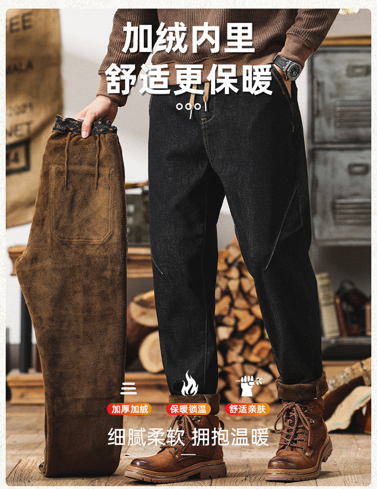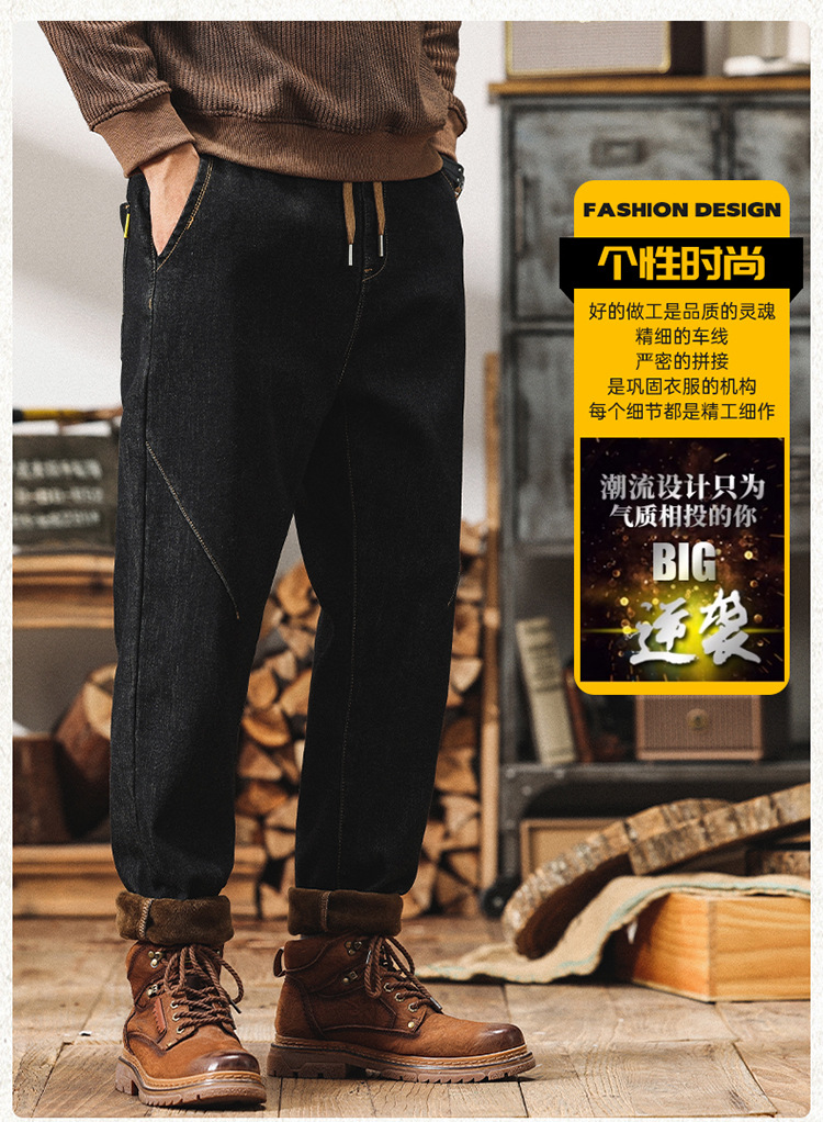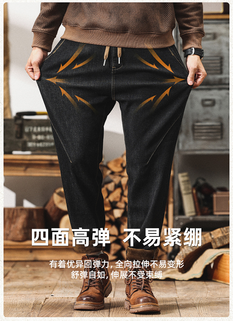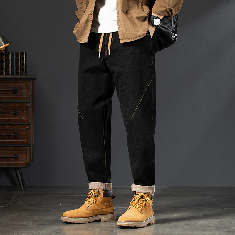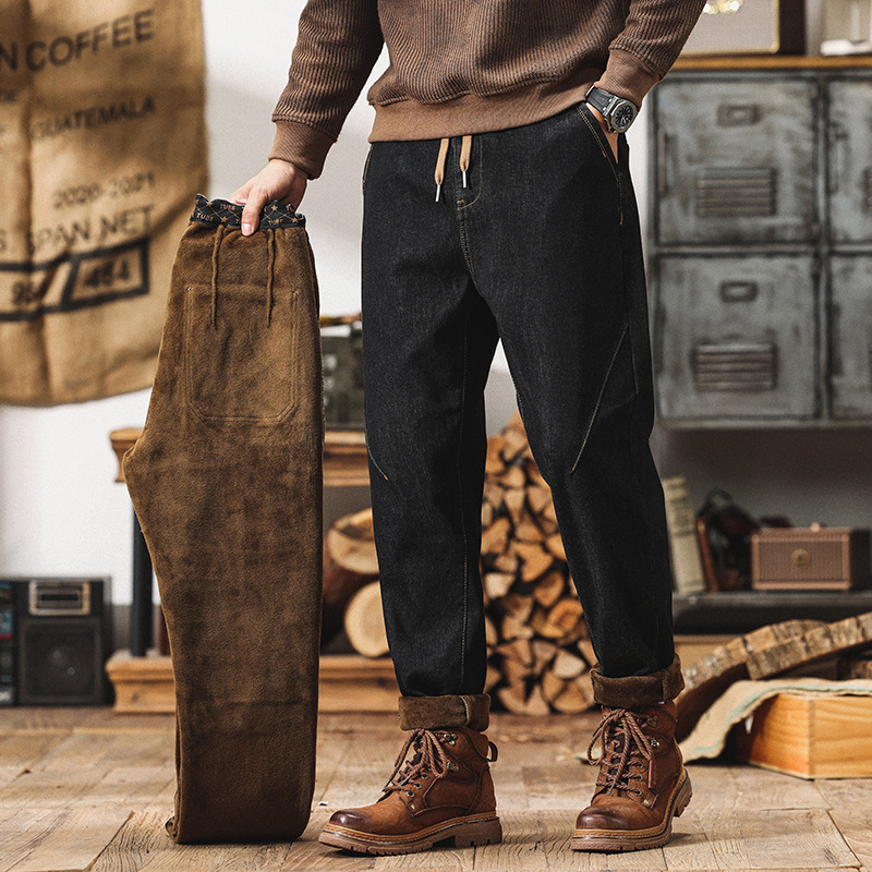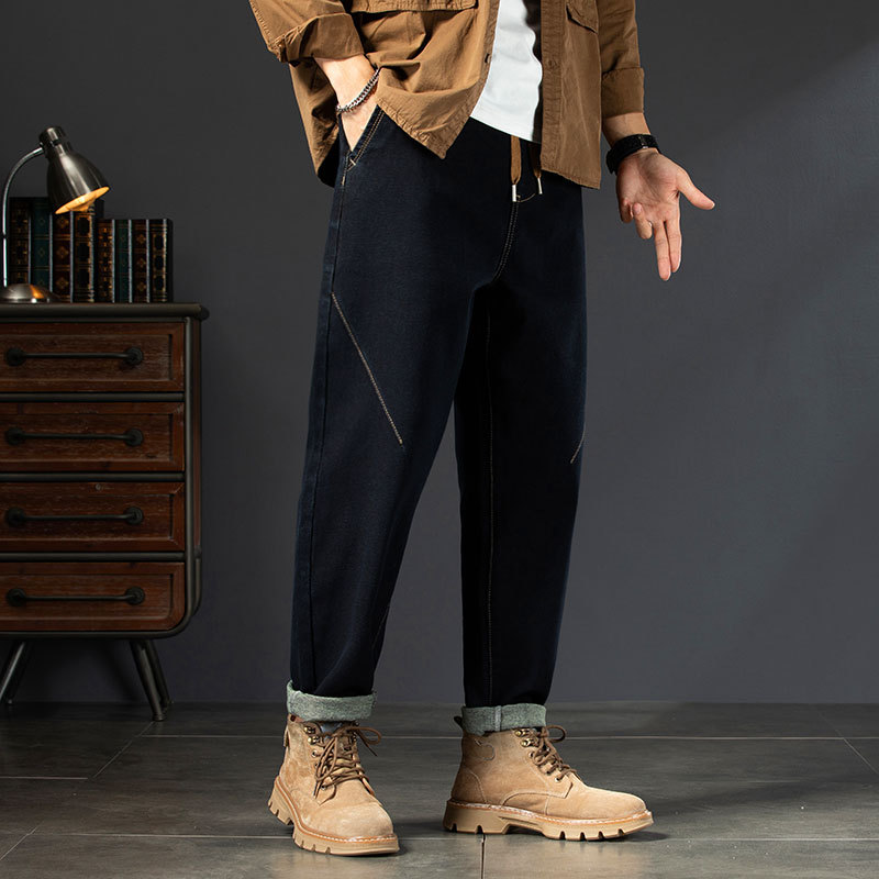 Winter Harlan 기모 청바지 남성용 느슨한 일본식 플러스 사이즈 드로스트링 스트레치 슬림 핏 타이드 스트레이트 바지스토어 가기