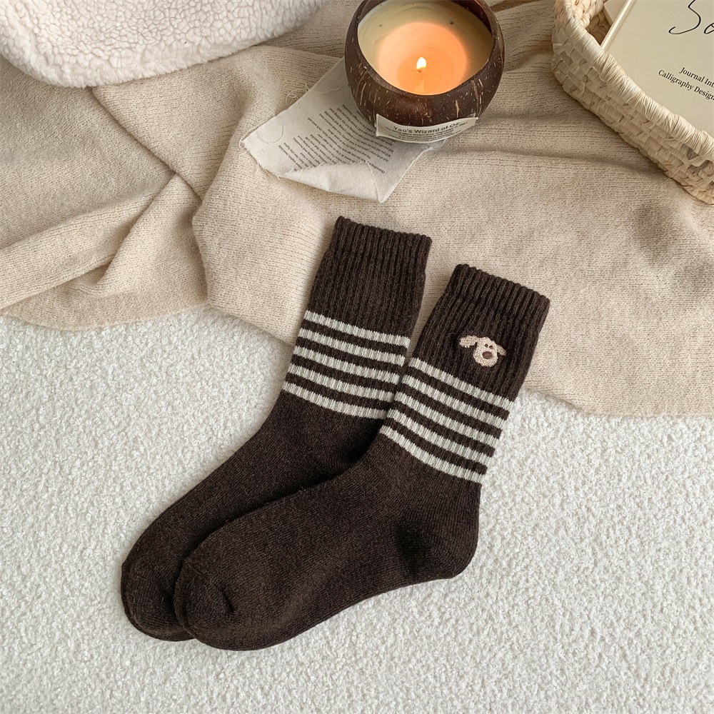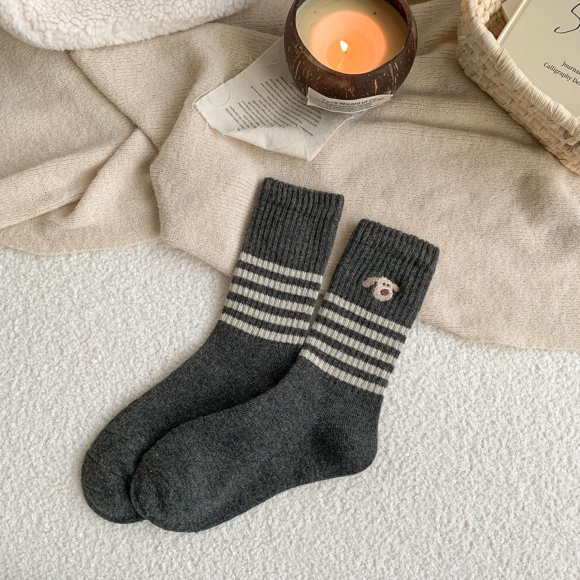 귀여운 큰 귀 강아지 자수 양모 양말 여성 두꺼운 따뜻한 양말 한국 아카데미 스타일 줄무늬 스택 양말