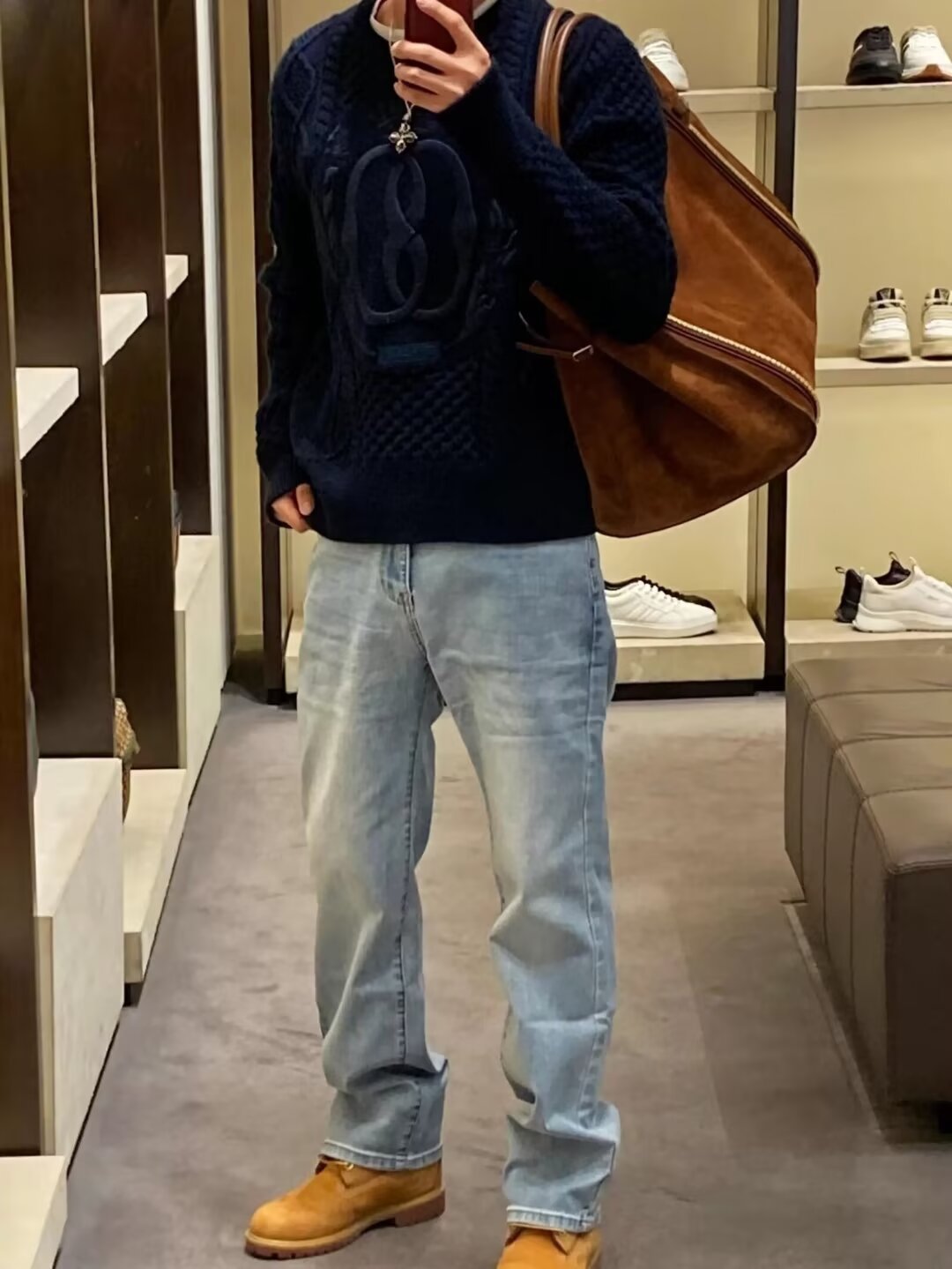 미국 거리 씻은 약한 청바지 남성용 봄과 가을 스트레이트 와이드 디자인 센스 틈새 바이브 스타일 긴 바지