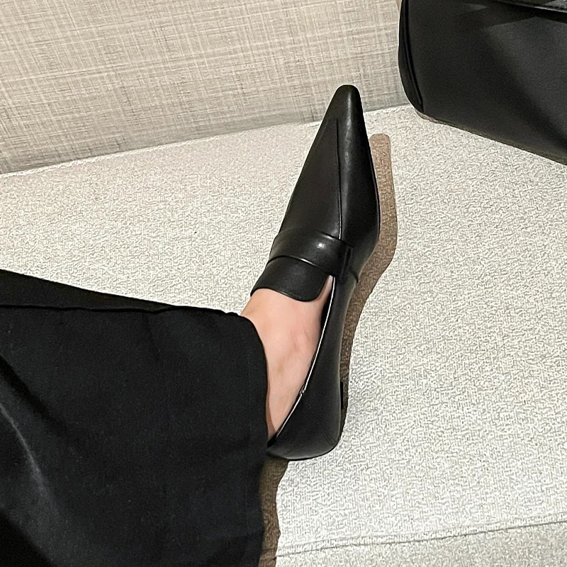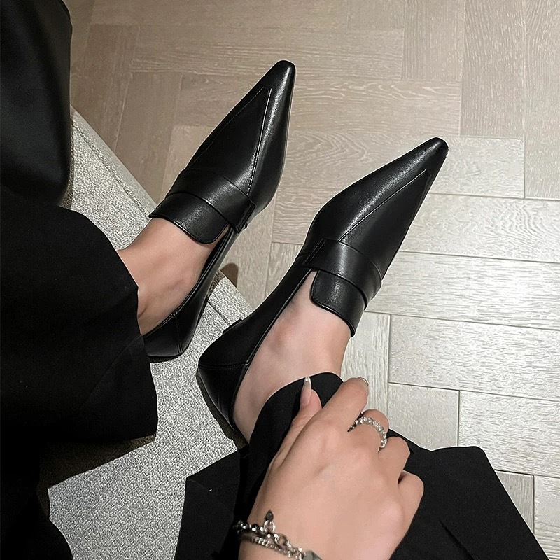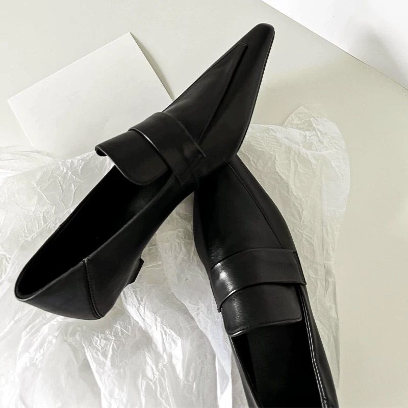 프랑스 니치 포인팅 테이퍼 힐 로퍼 작은 가죽 신발 여성의 가을과 겨울 새로운 올매치 하이 레벨 스타일 발가락 신발