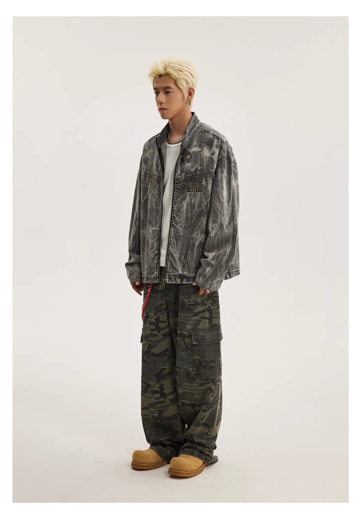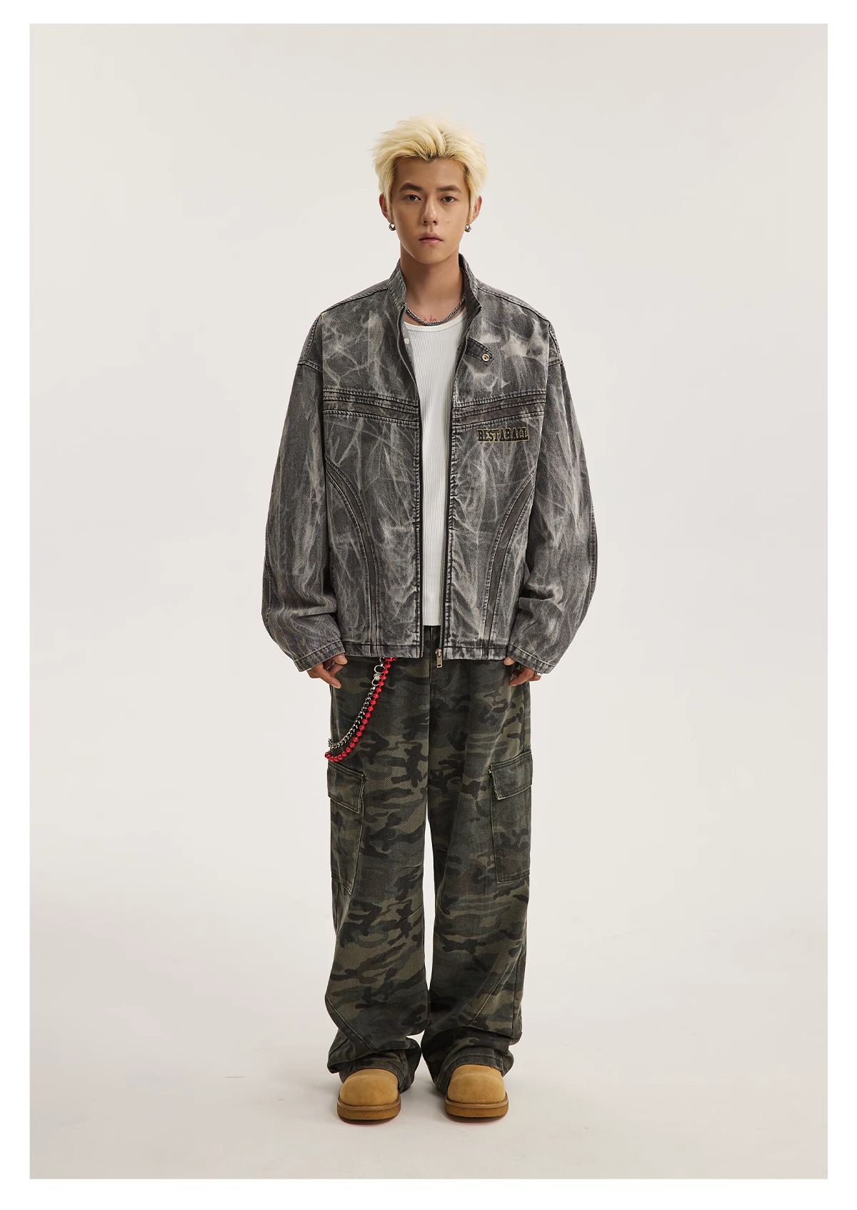 아메리칸 스타일 하이 스트리트 올드 그래피티 프린트 데님 재킷 남성 봄과 가을 새로운 느슨한 파괴 오토바이 재킷 탑