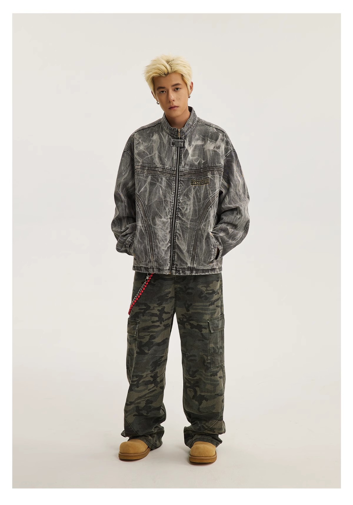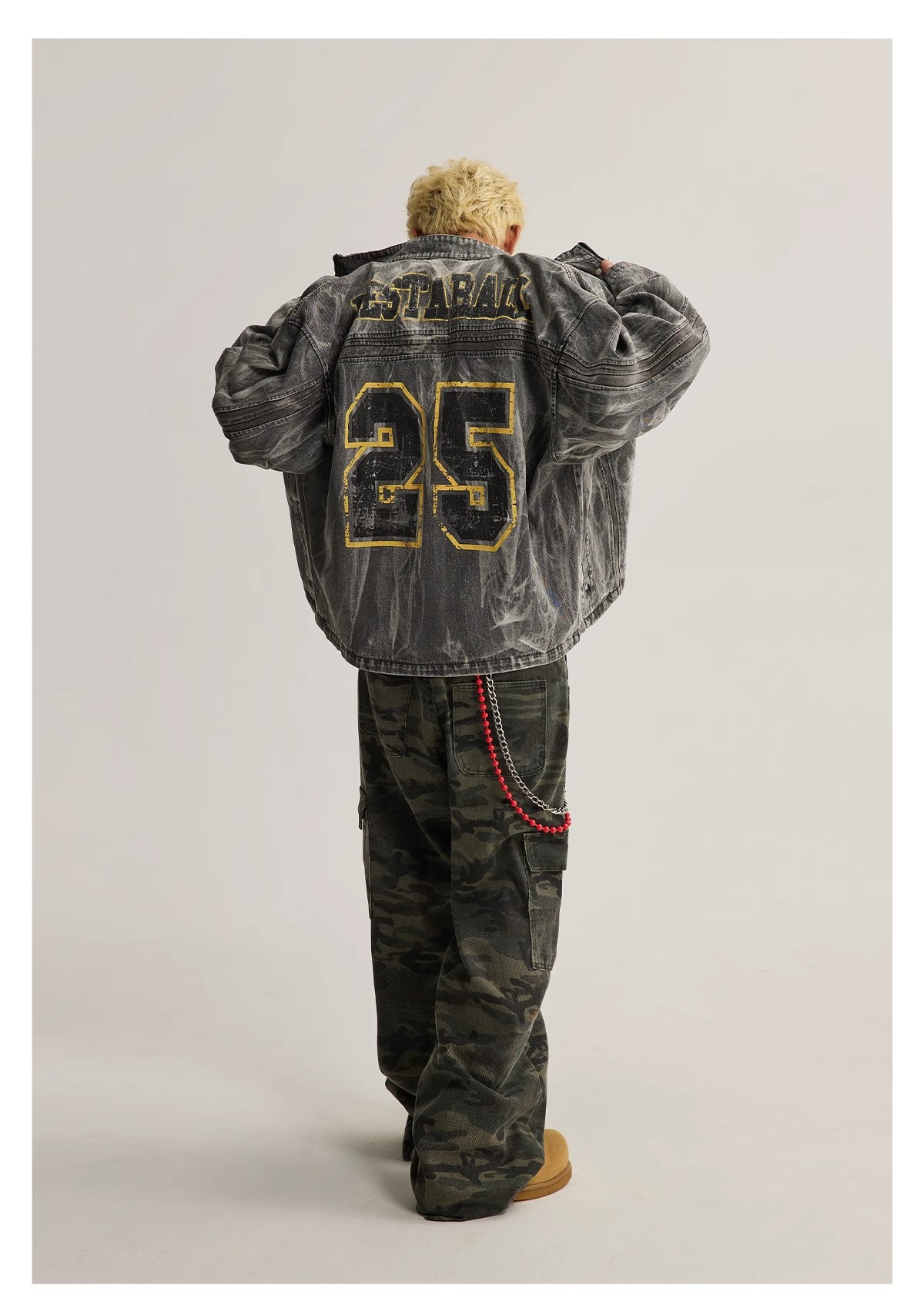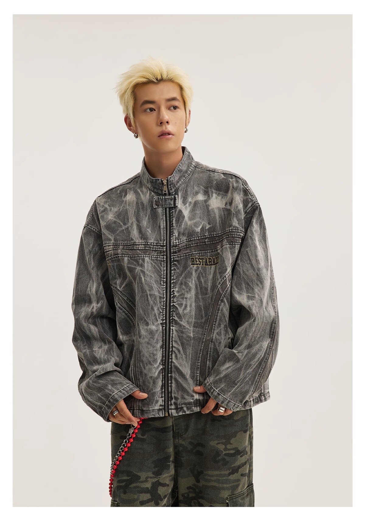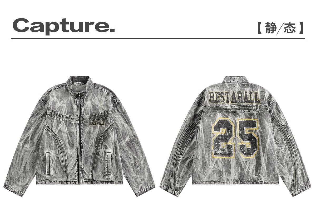 아메리칸 스타일 하이 스트리트 올드 그래피티 프린트 데님 재킷 남성 봄과 가을 새로운 느슨한 파괴 오토바이 재킷 탑스토어 가기