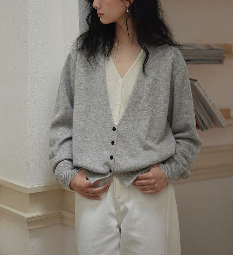 지식인은 명암 색 V-목 가짜 투피스 니트 카디건 여성용 그레이 착용스토어 가기