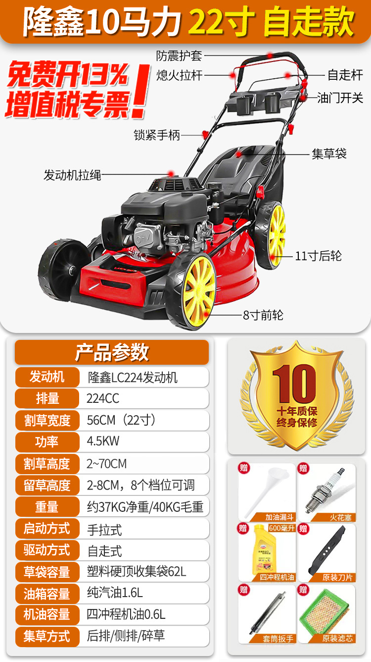 • Loncin 10HP 22inch 자체 추진형 매우 두꺼운 강철 바닥