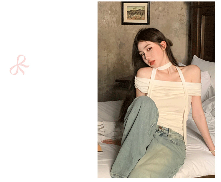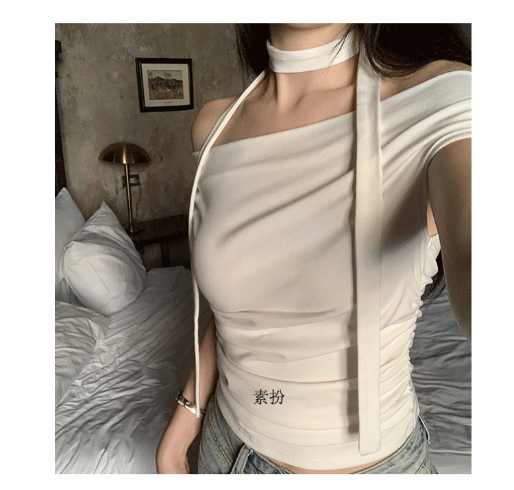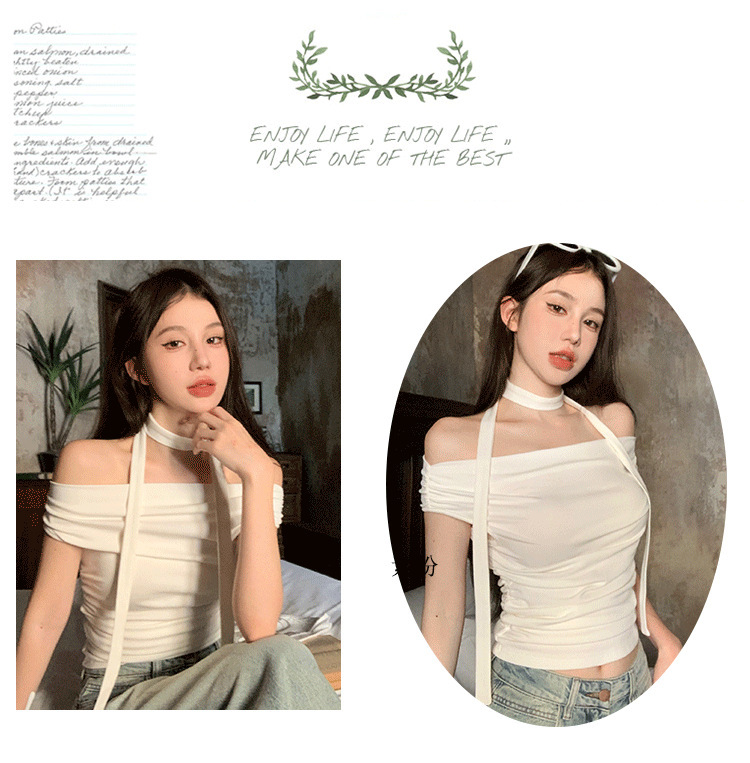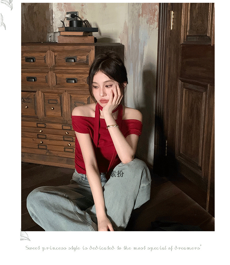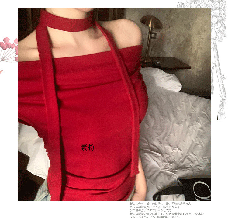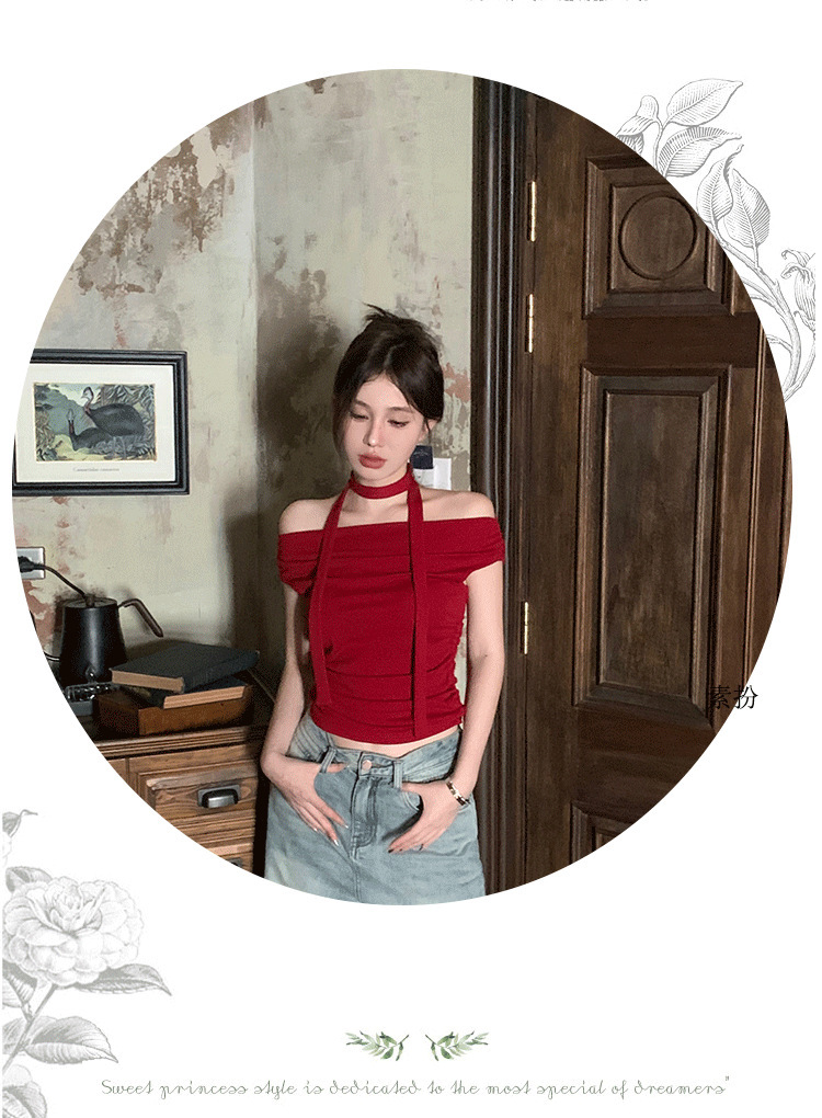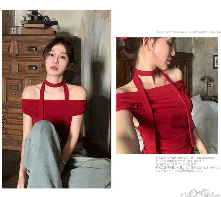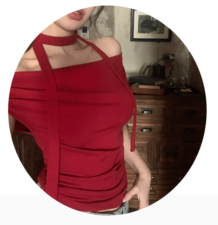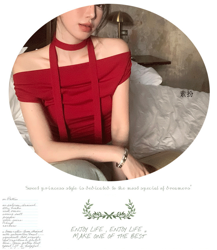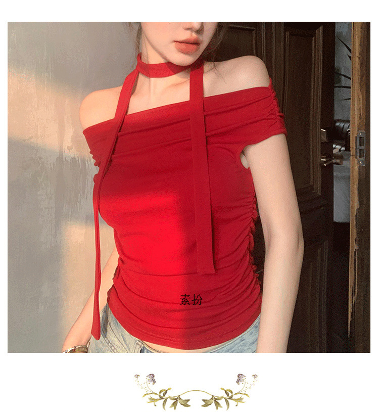 레드 퓨어 넥 콜라 본 어깨 반팔 티셔츠 여성용 여름 섹시한 슬림 핏 짧은 러플 탑 그레이스토어 가기