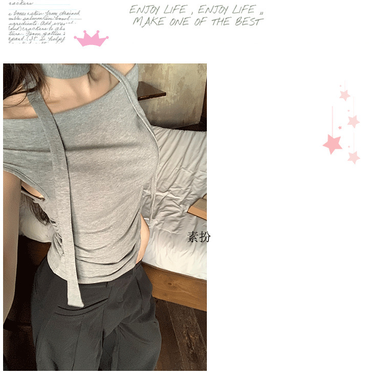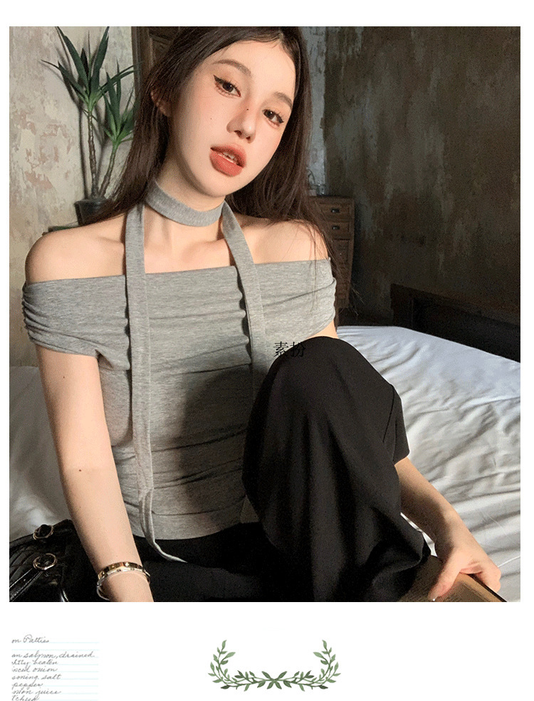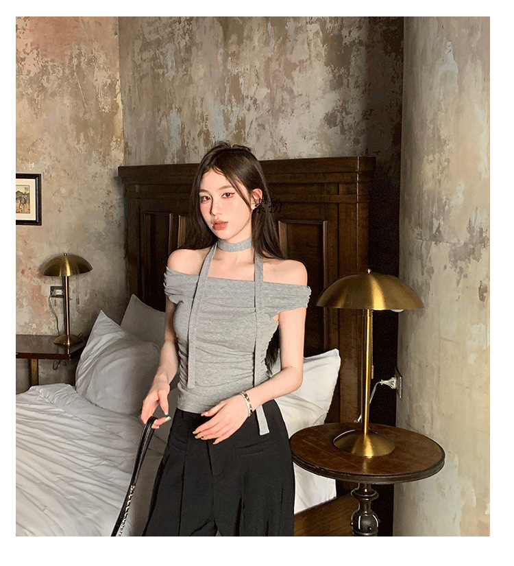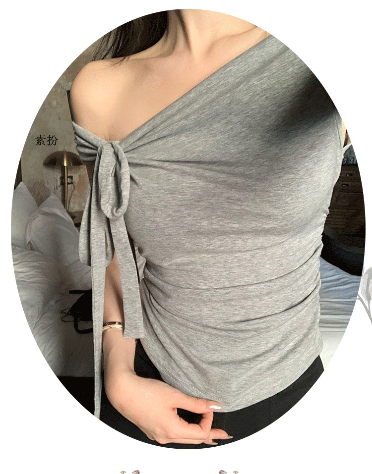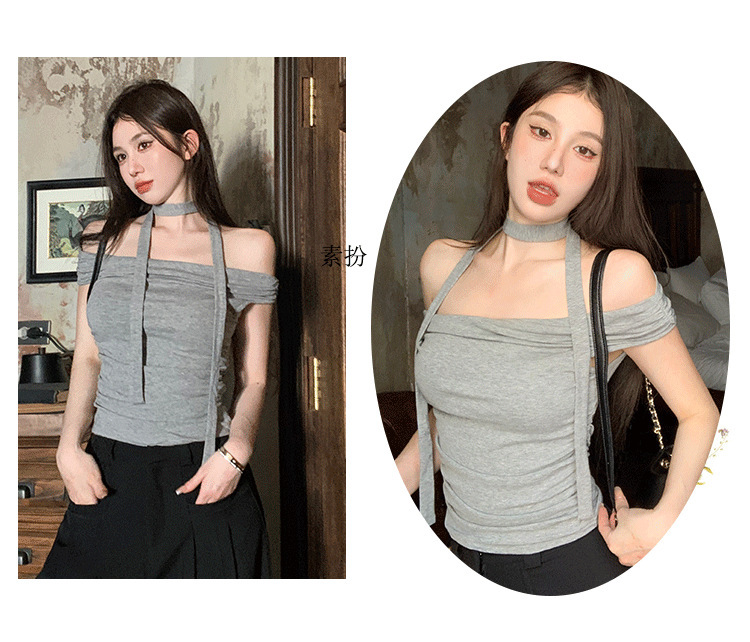 레드 퓨어 넥 콜라 본 어깨 반팔 티셔츠 여성용 여름 섹시한 슬림 핏 짧은 러플 탑 그레이