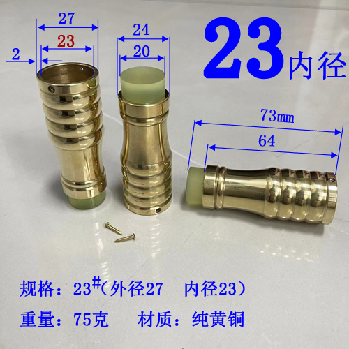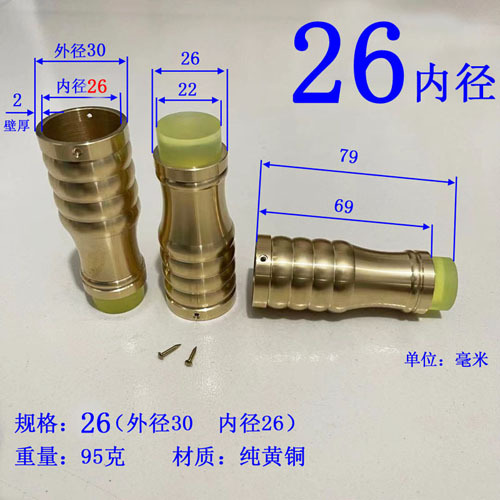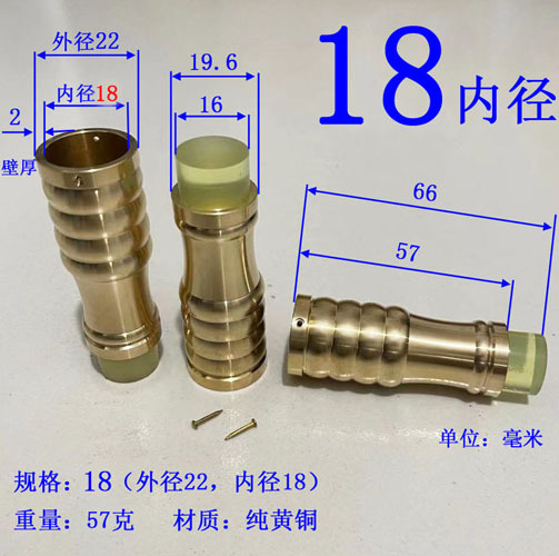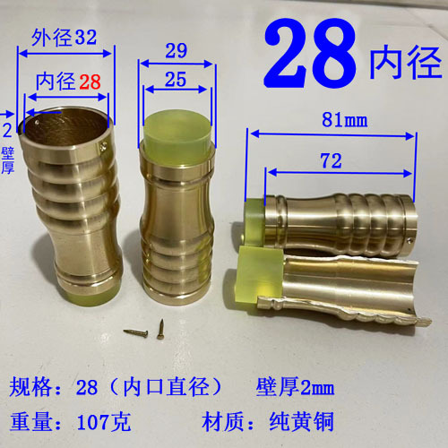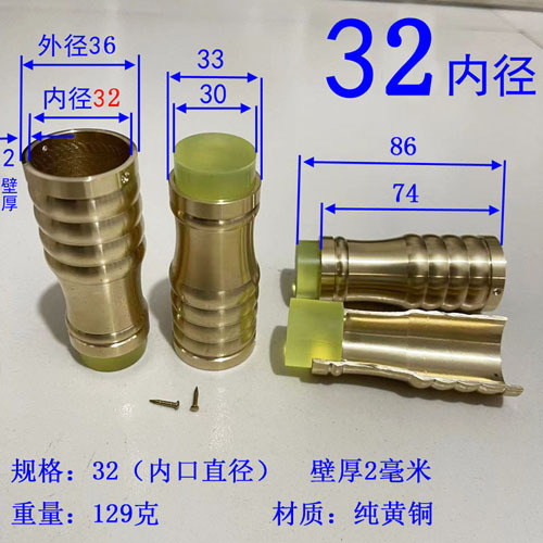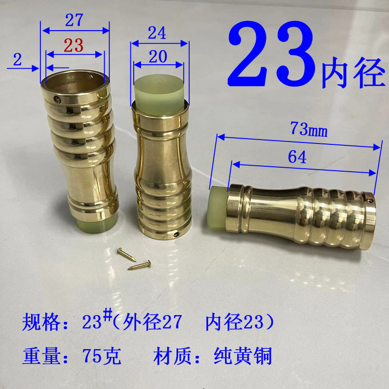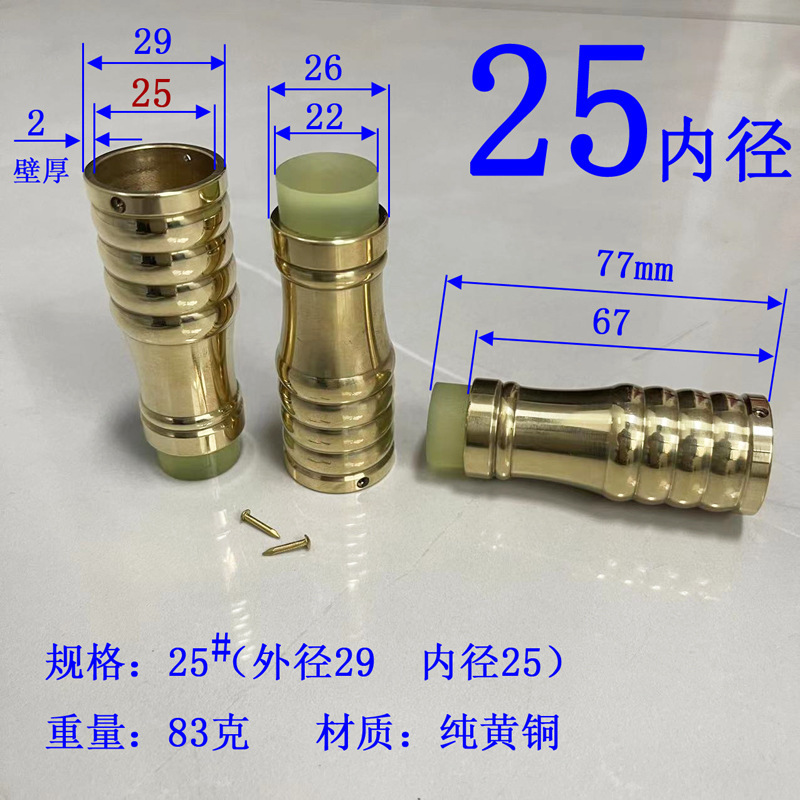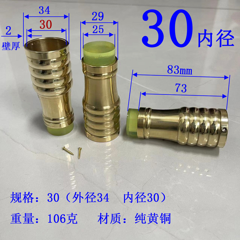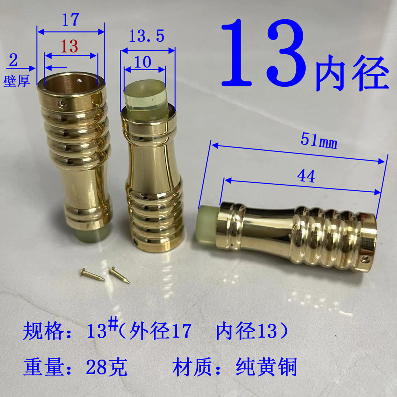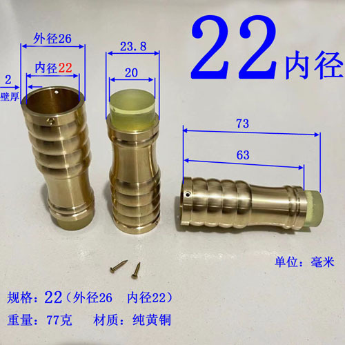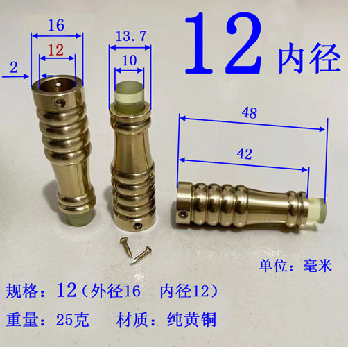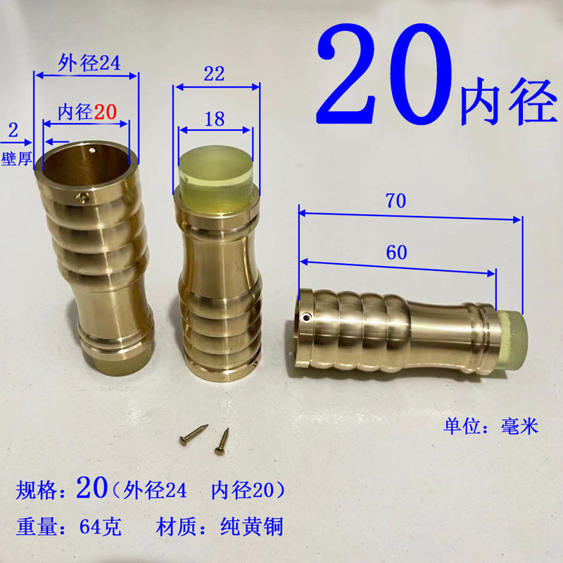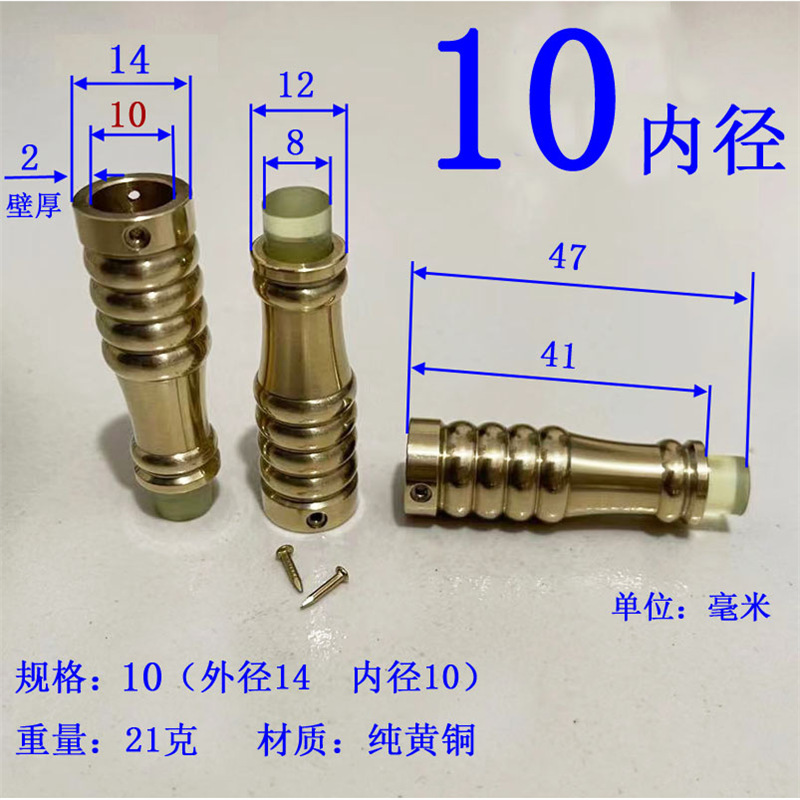 注意:2021.10.21日18点以前拍的订单规格都是按照外直径参数,以后都是按照内直径参数。拐杖拐棍手杖铜脚套,纯黄,规格有10、12、14/16/17/18/19/20/21/22/24/26/28/32/34。注意:规格大小都是指铜套上端内口直径,单边壁厚2毫米,铜脚中部以上内孔直径一样,以下有锥度,根据不同的安装方式选择不同的规格,配铜钉2个。售价都是单个的价格,需要多个型号请分别别加入购物车,最后去购物车里合并一个订单提交。我们签约的是圆通快递,其它快递贵,需要补运费差价,需要请和客服联系,新疆和西藏不包邮,希望理解。