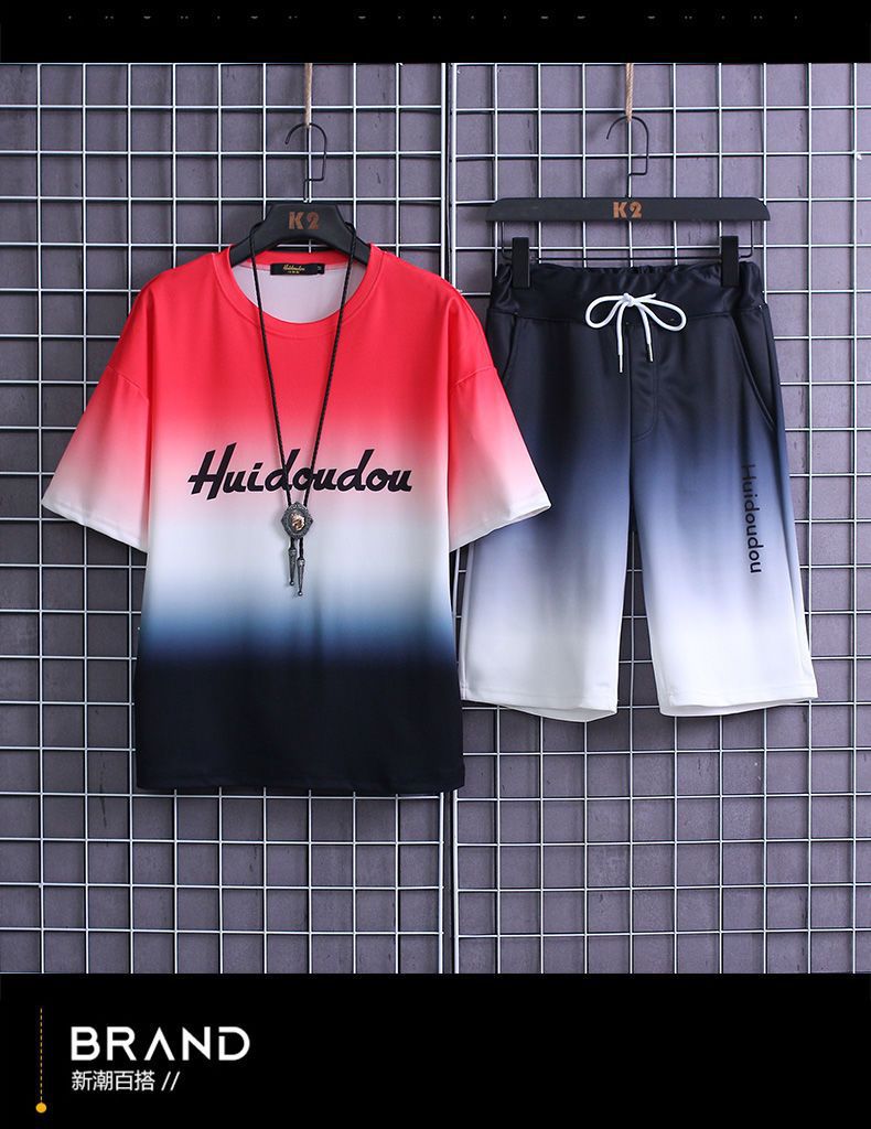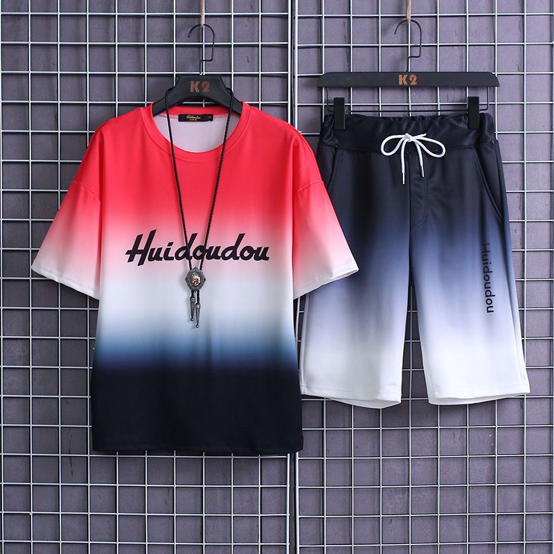 夏季套装男士运动冰丝速干短袖短裤韩版潮流渐变t恤一套磊红