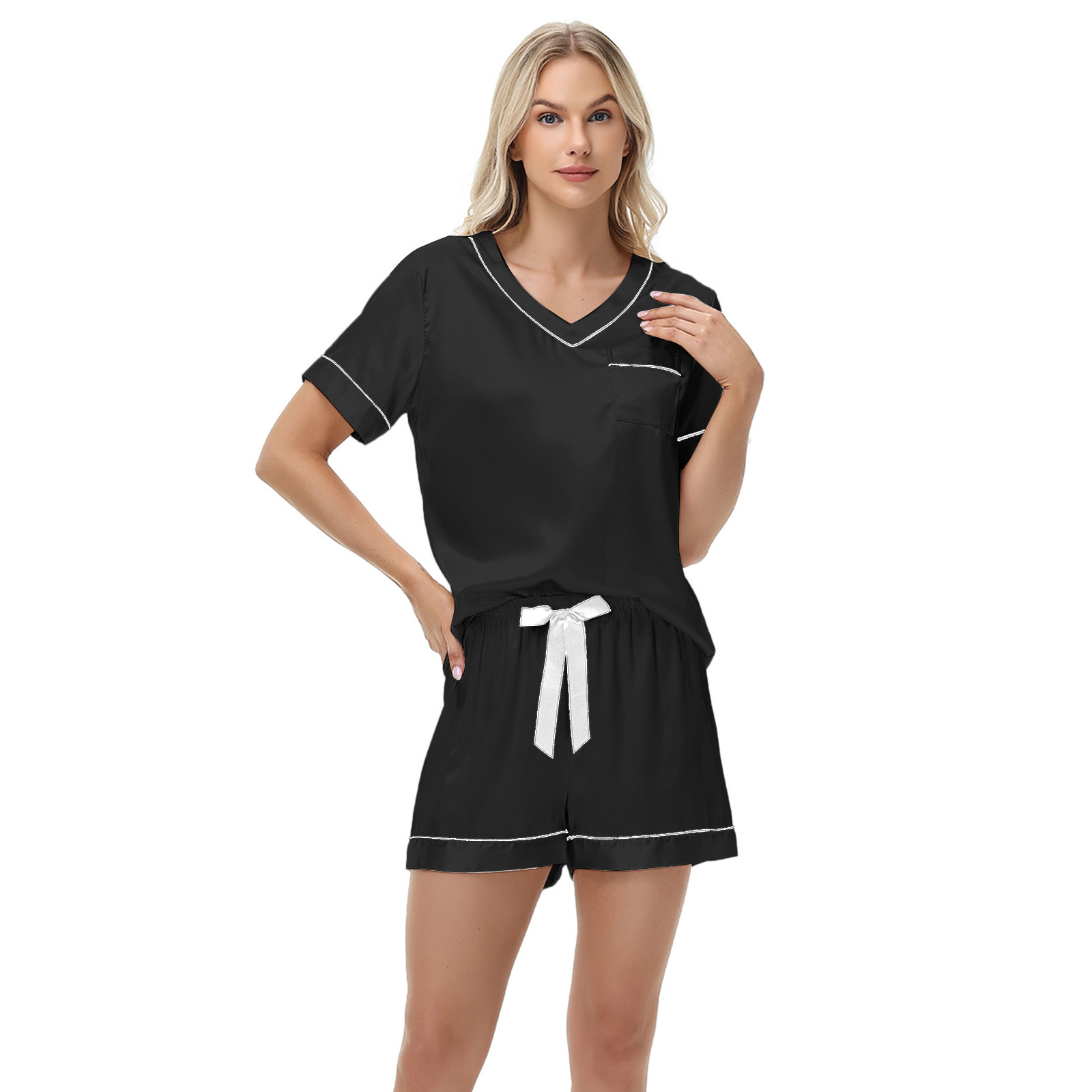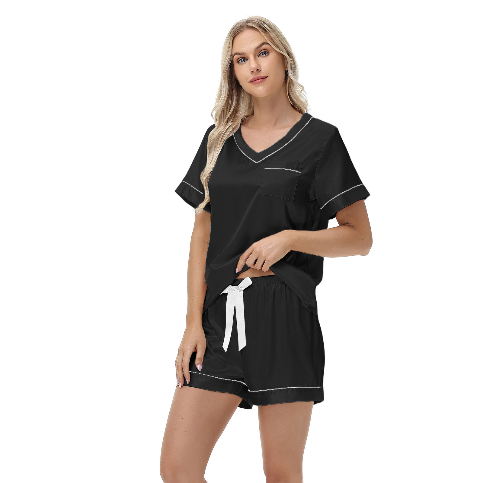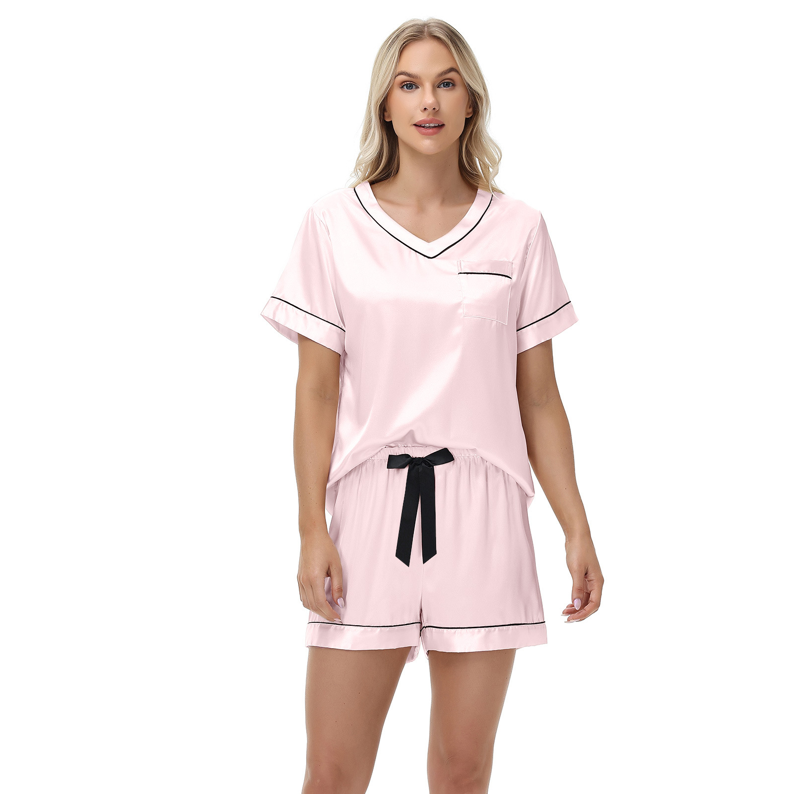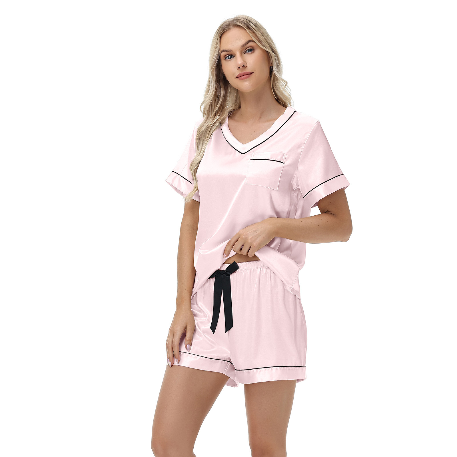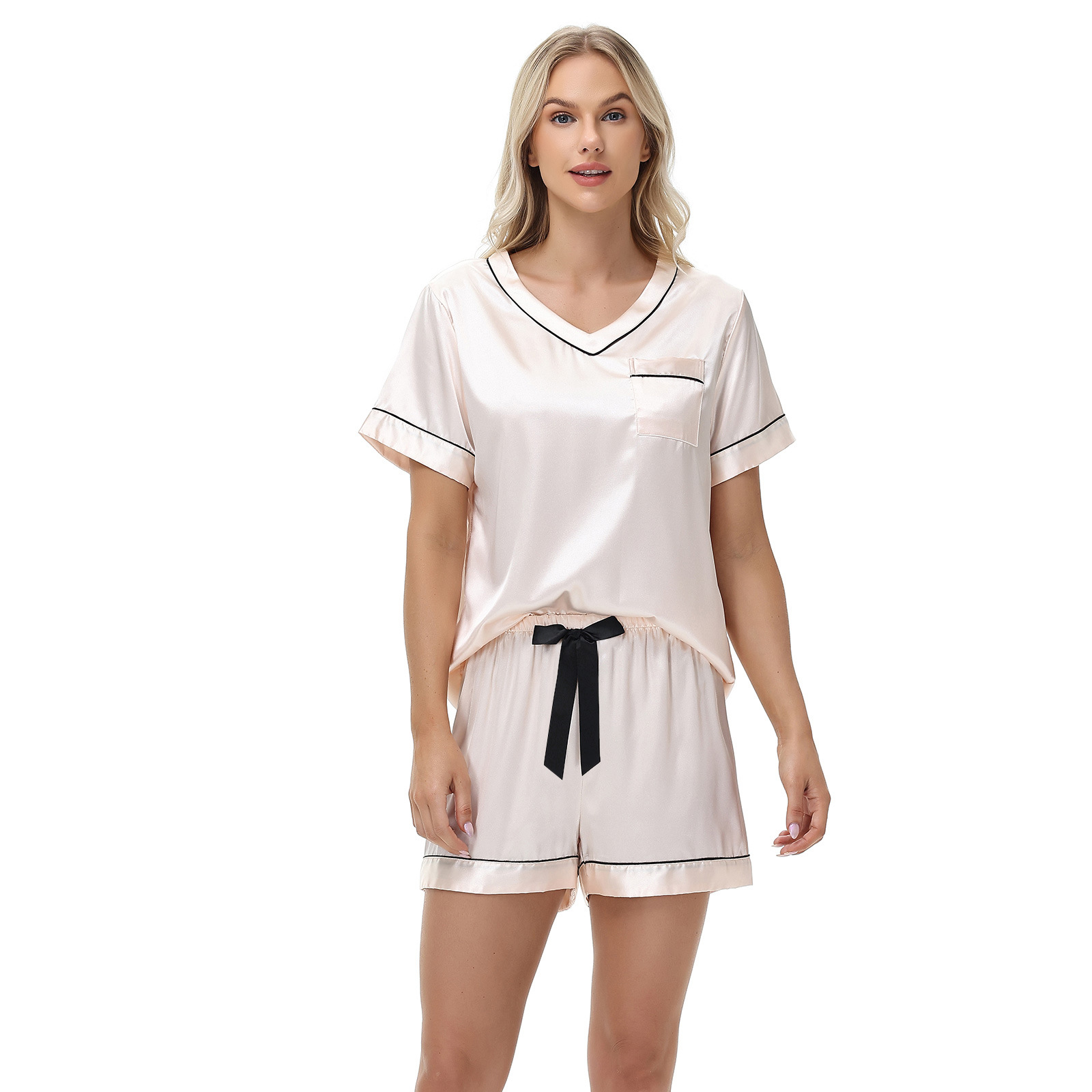 2025 국경을 넘는 아마존 대외 무역 반팔 반바지 여름 섹시한 잠옷 V넥 아이스 실크 세트 여성용 홈 의류스토어 가기
