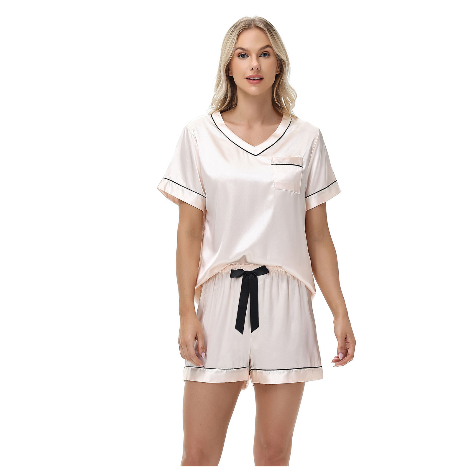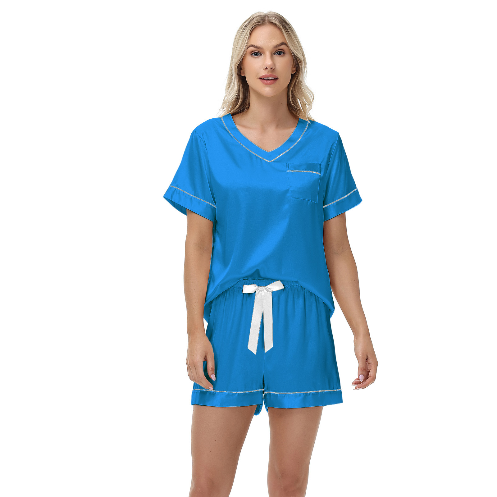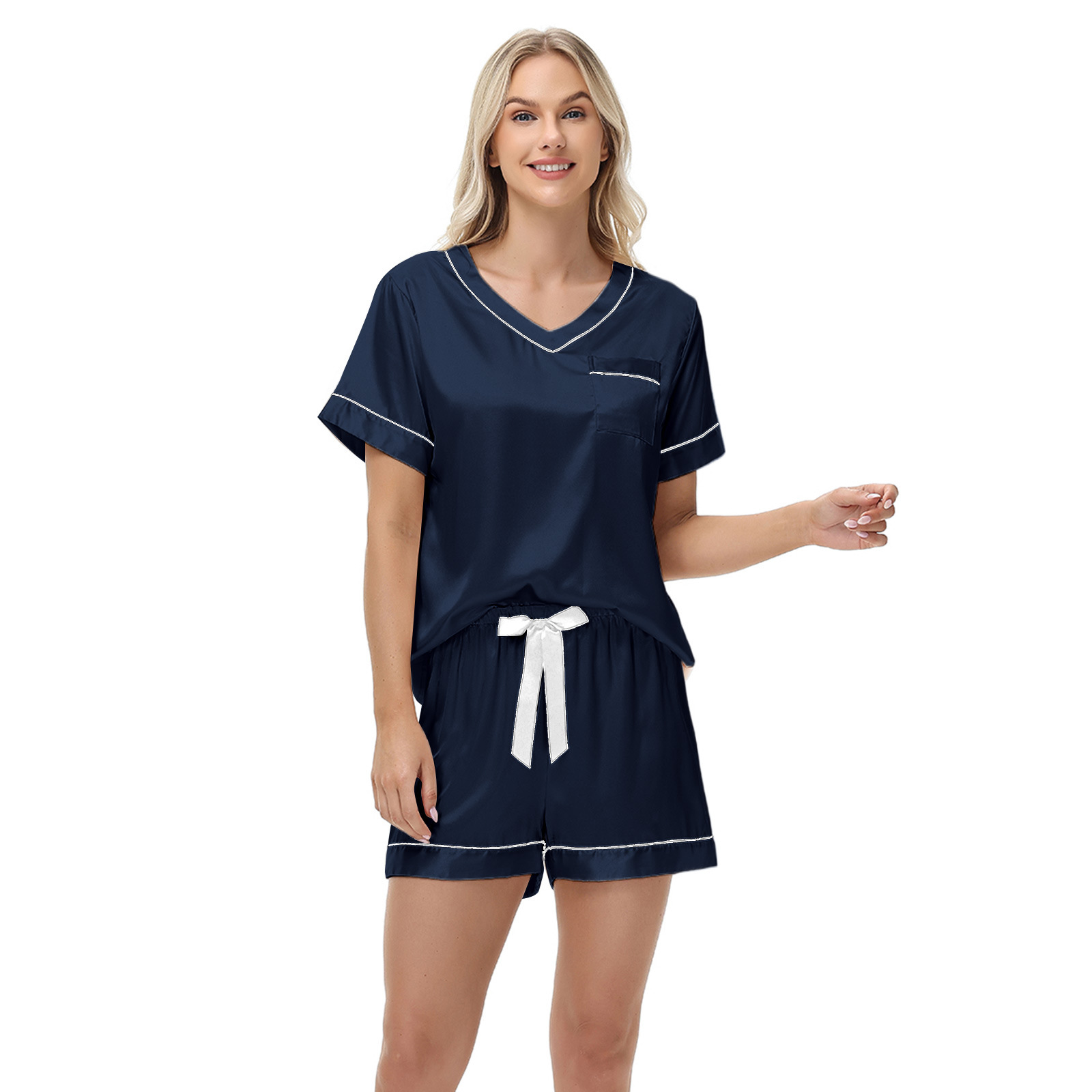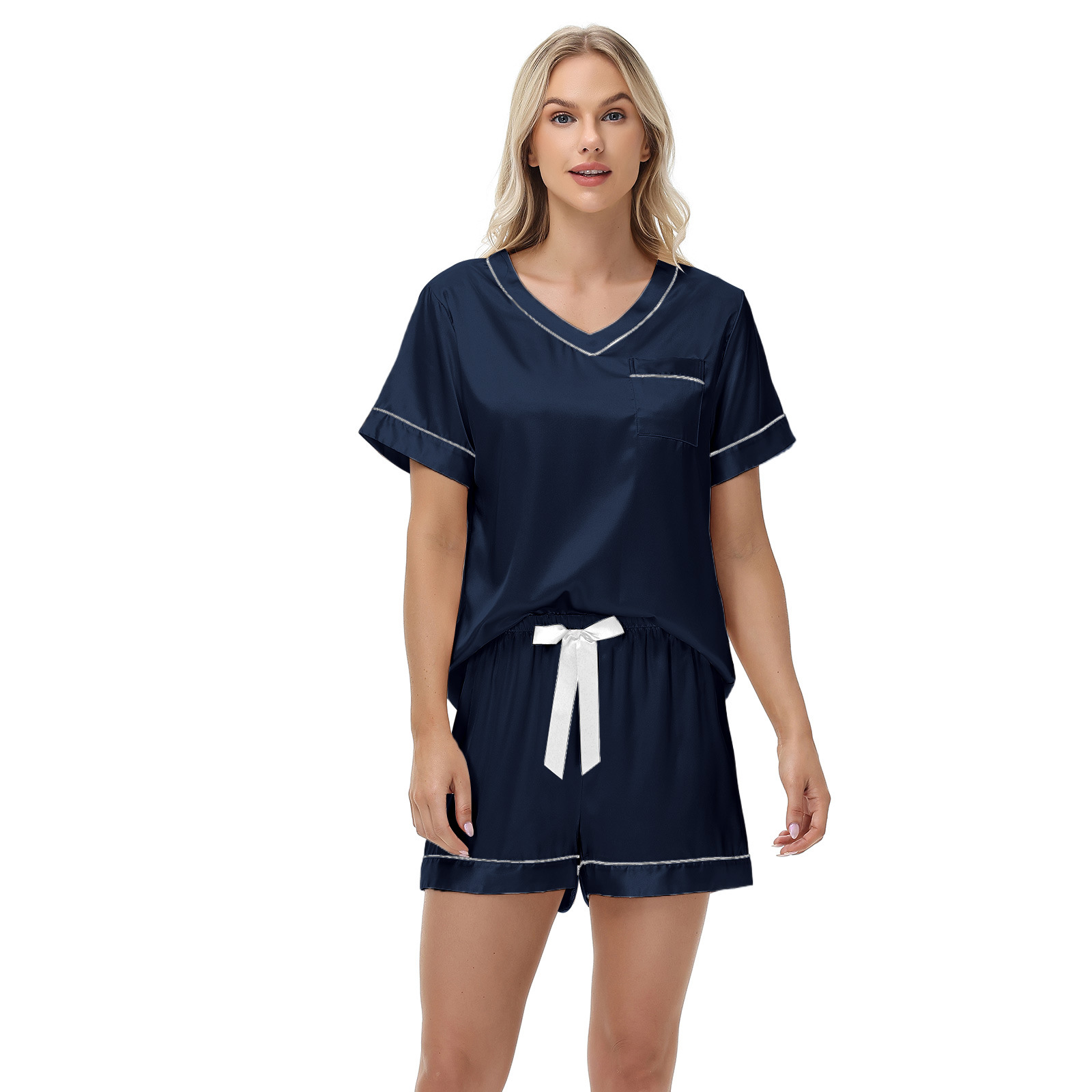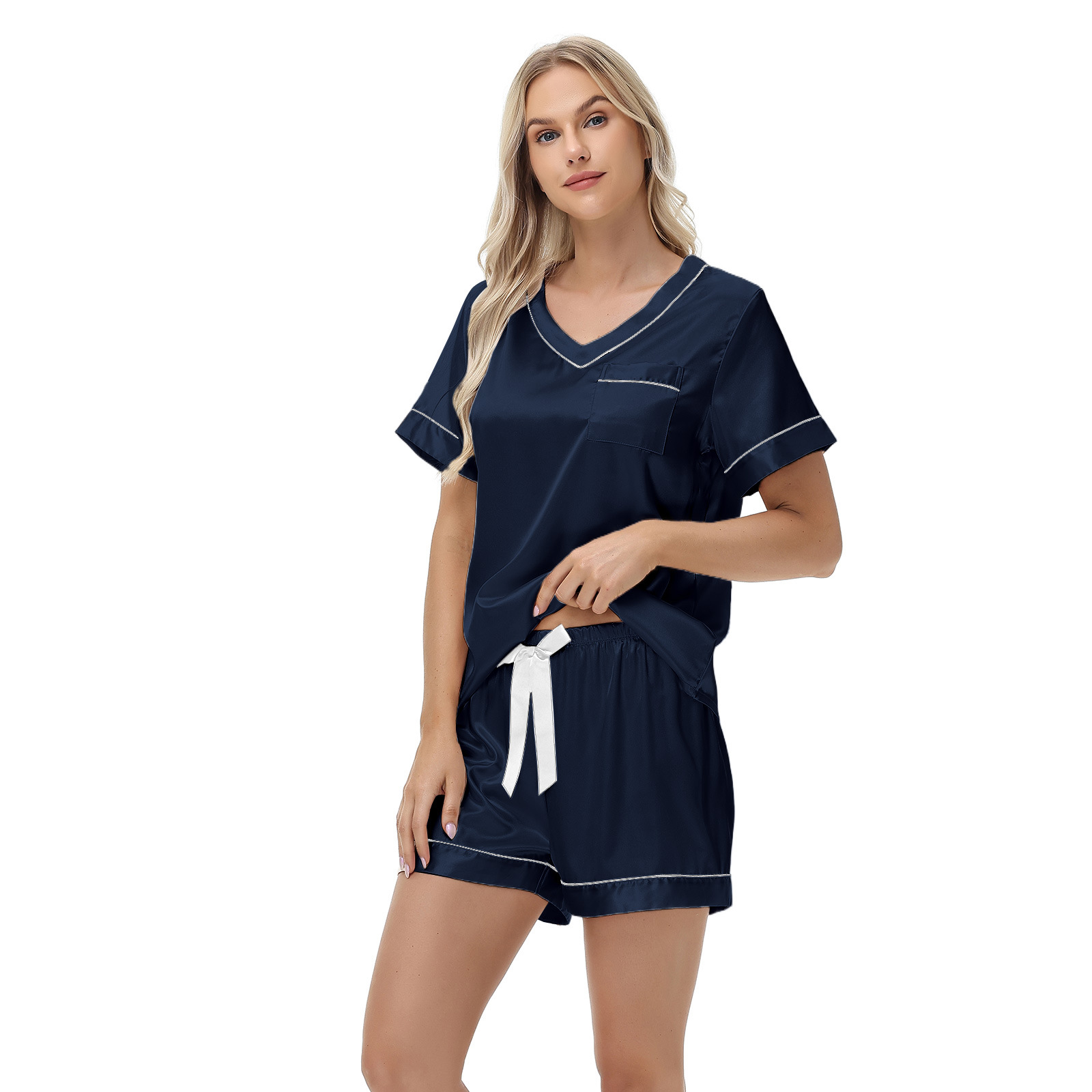 2025 국경을 넘는 아마존 대외 무역 반팔 반바지 여름 섹시한 잠옷 V넥 아이스 실크 세트 여성용 홈 의류스토어 가기