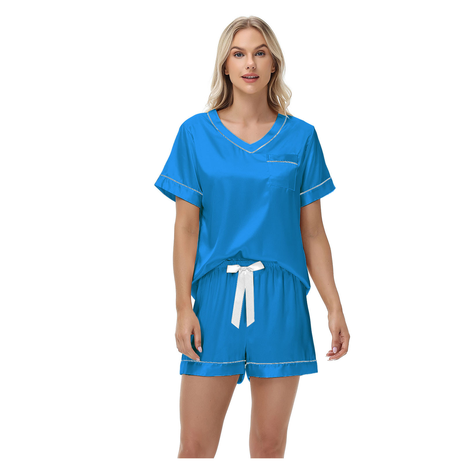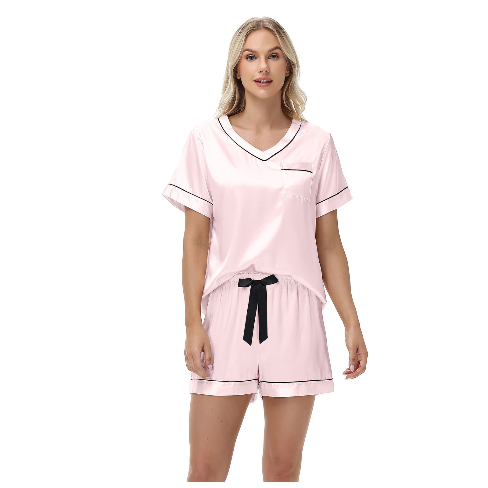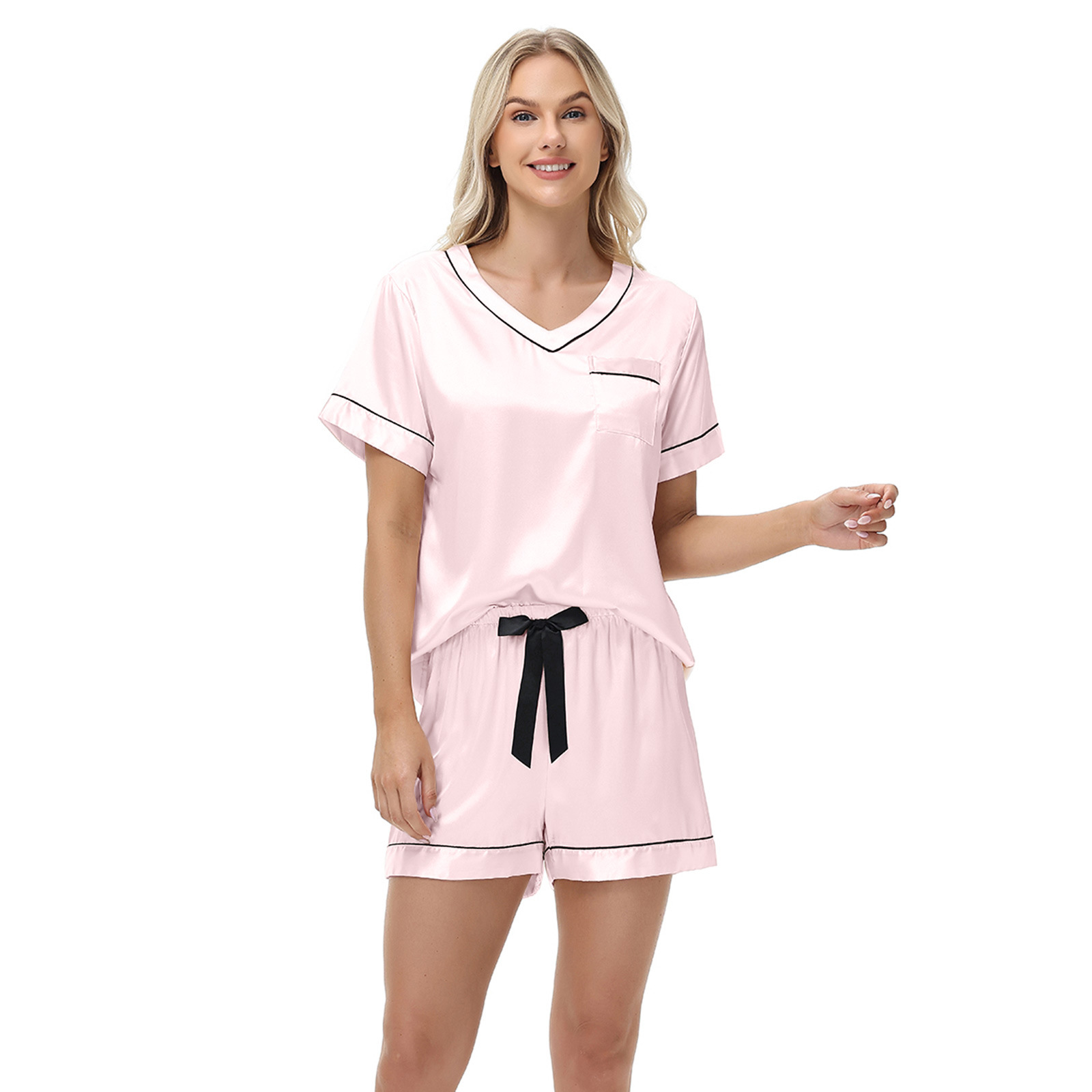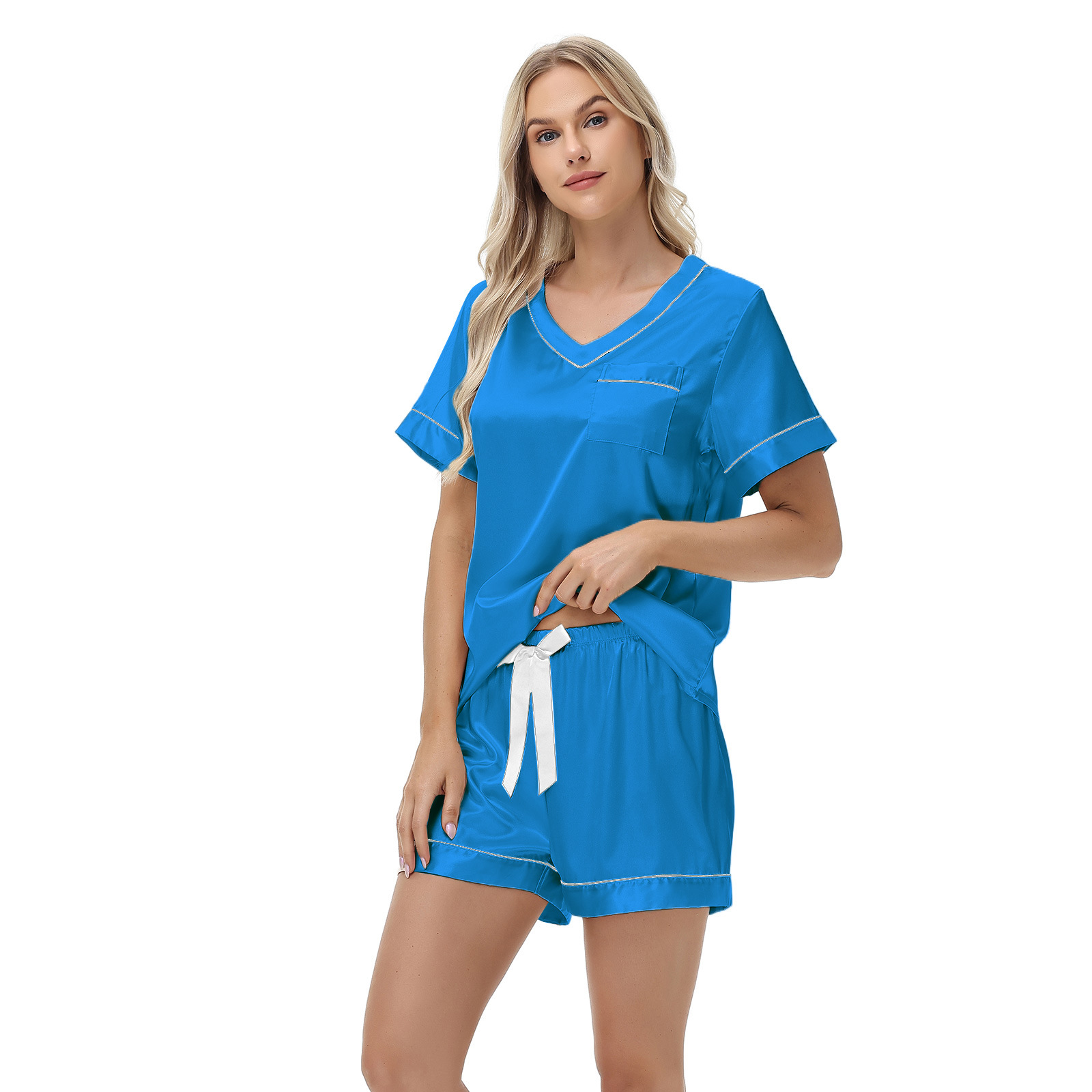 2025 국경을 넘는 아마존 대외 무역 반팔 반바지 여름 섹시한 잠옷 V넥 아이스 실크 세트 여성용 홈 의류스토어 가기