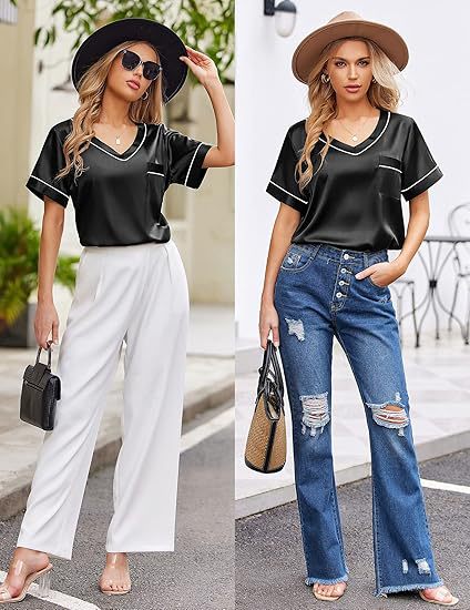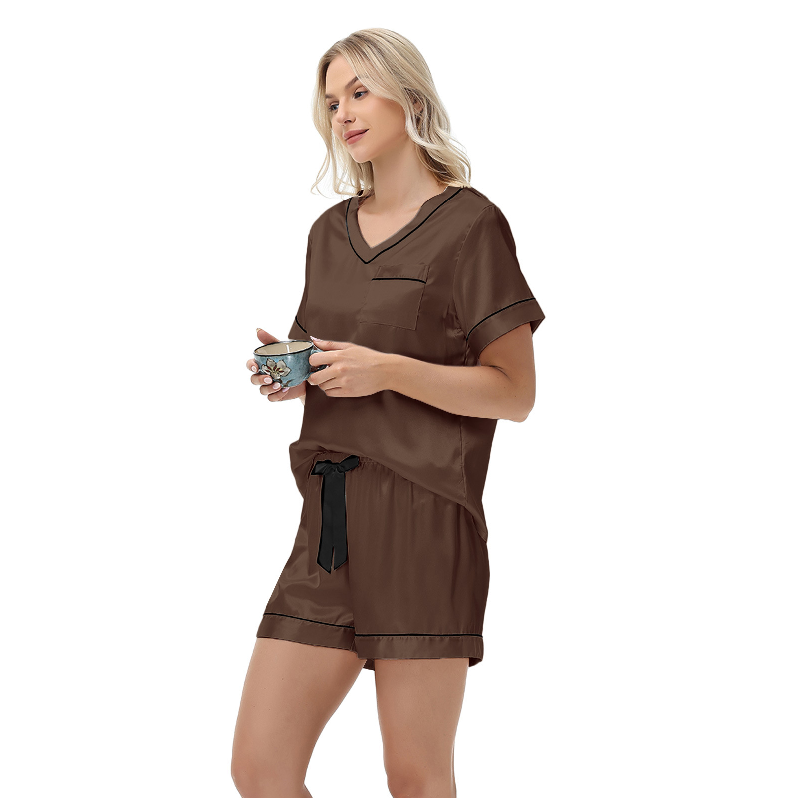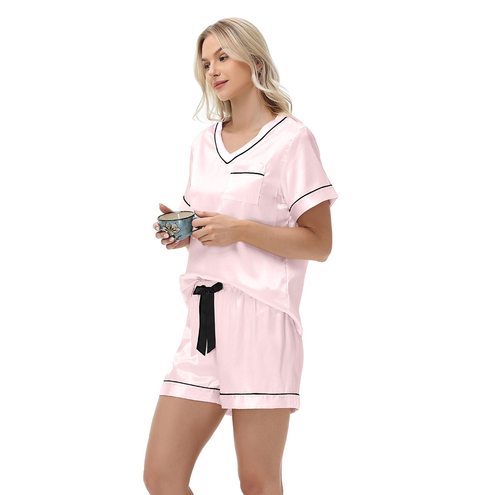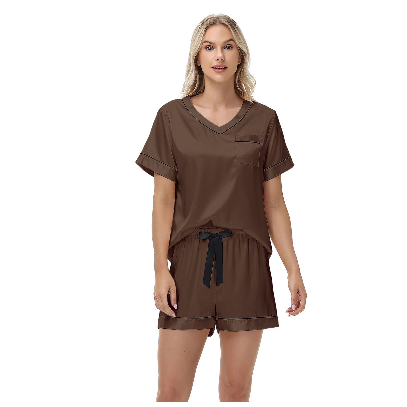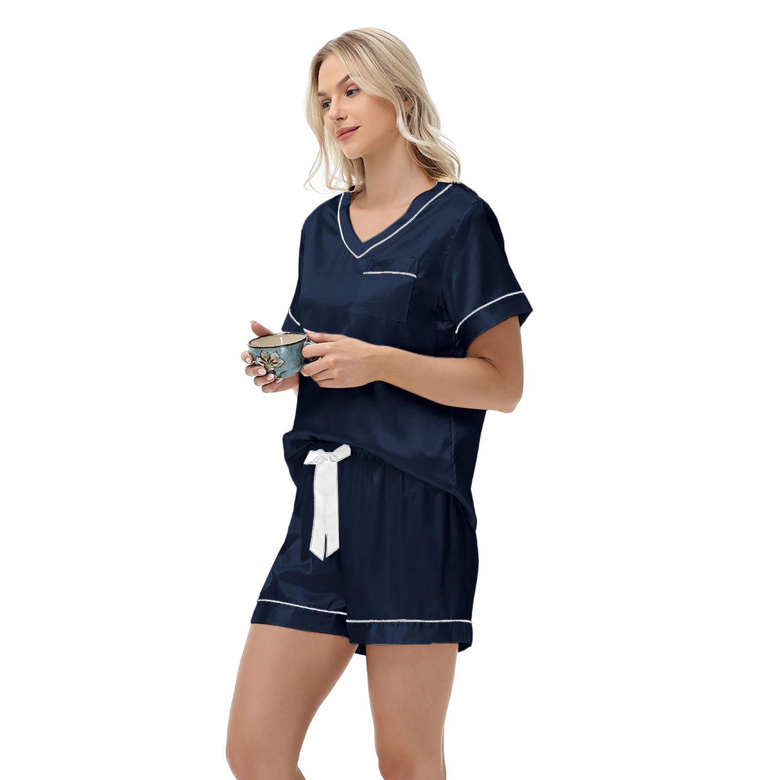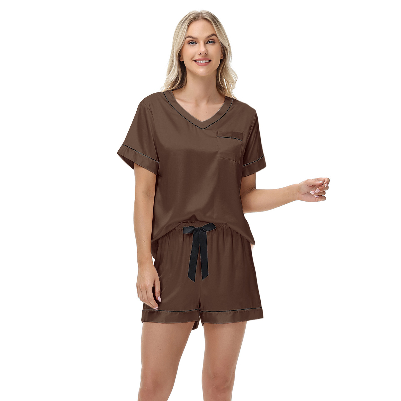 2025 국경을 넘는 아마존 대외 무역 반팔 반바지 여름 섹시한 잠옷 V넥 아이스 실크 세트 여성용 홈 의류스토어 가기