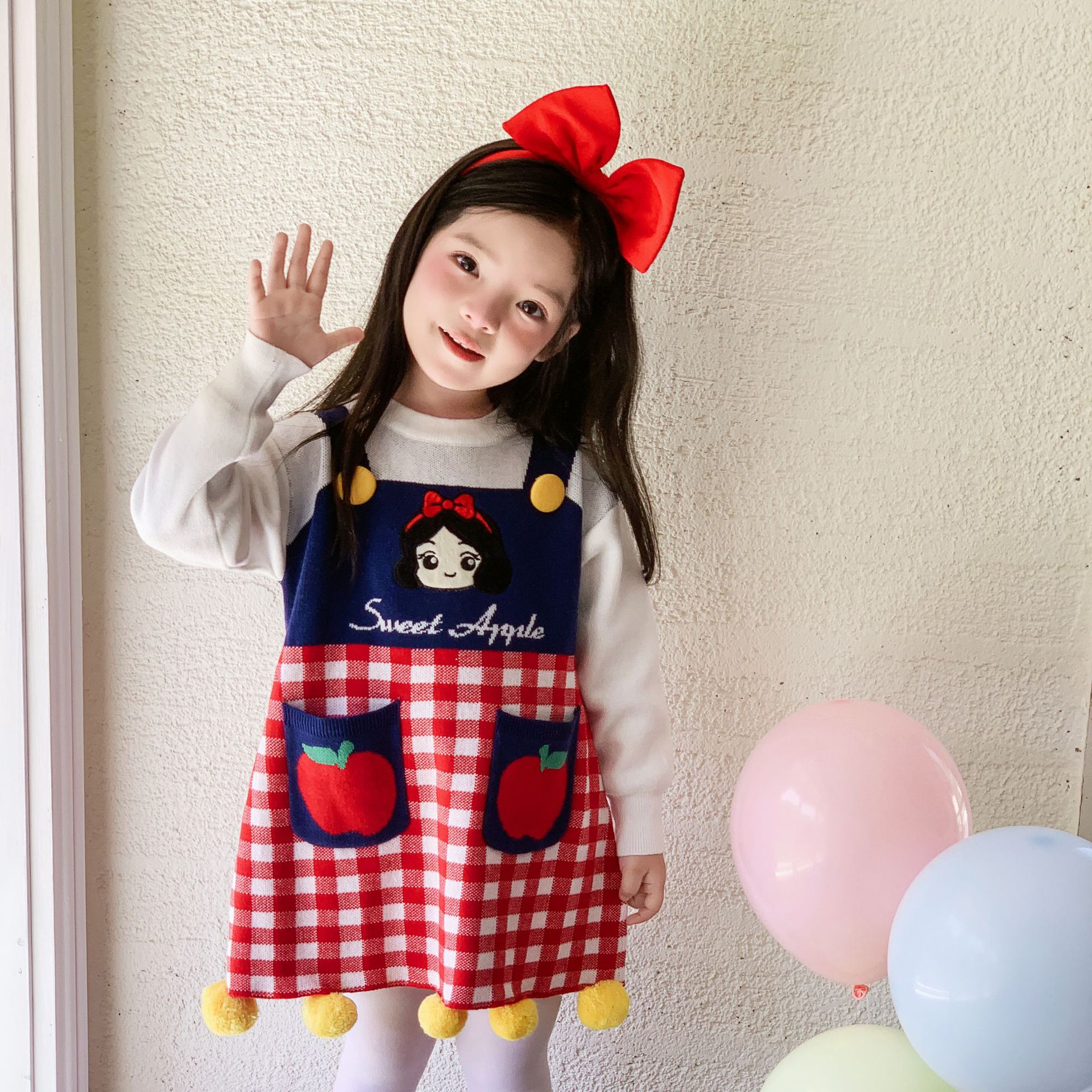 【특가 재고】백설공주 드레스 여아 가을 겨울 니트 원피스 체크무늬 털볼 아동 스웨터 원피스스토어 가기