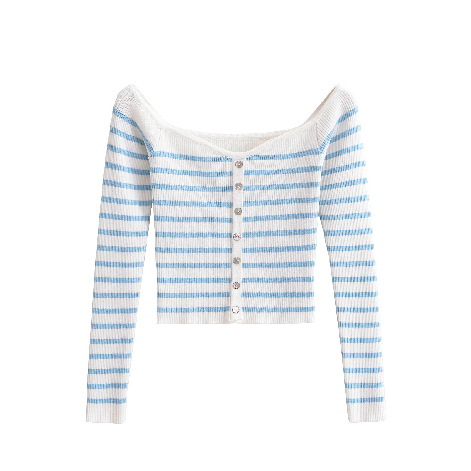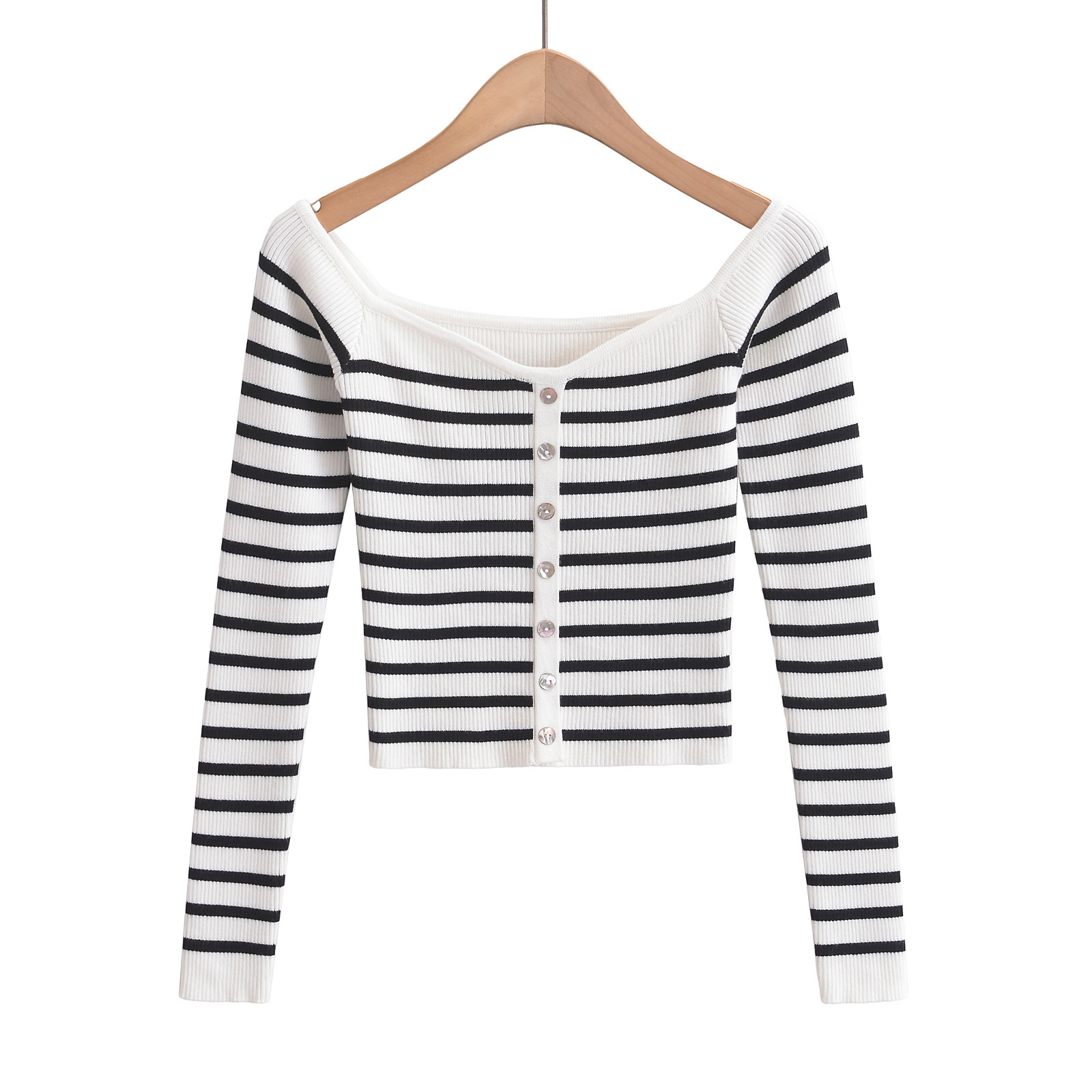 대조 컬러 스트라이프 칼라 긴팔 니트 여성용 2024 가을 및 겨울 새로운 순수 스파이스 소녀 슬림핏 숄더 탑