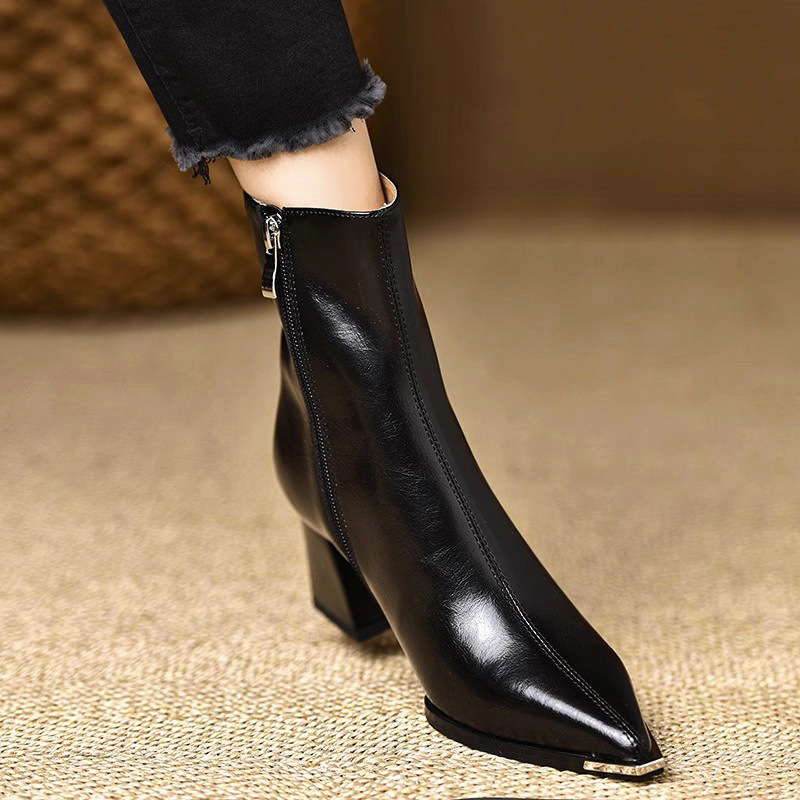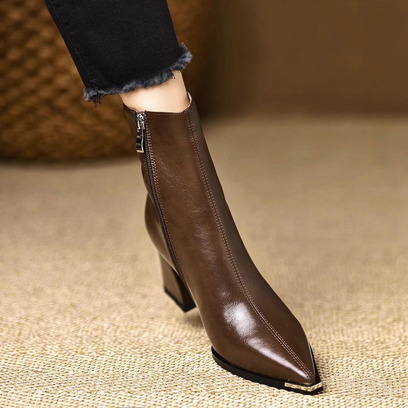 Maillard Vintage 패션 메탈릭 포인팅 두꺼운 힐 패션 가죽 부츠 가을과 겨울 새로운 도착 기모 올매치 우아한 발목 부츠스토어 가기