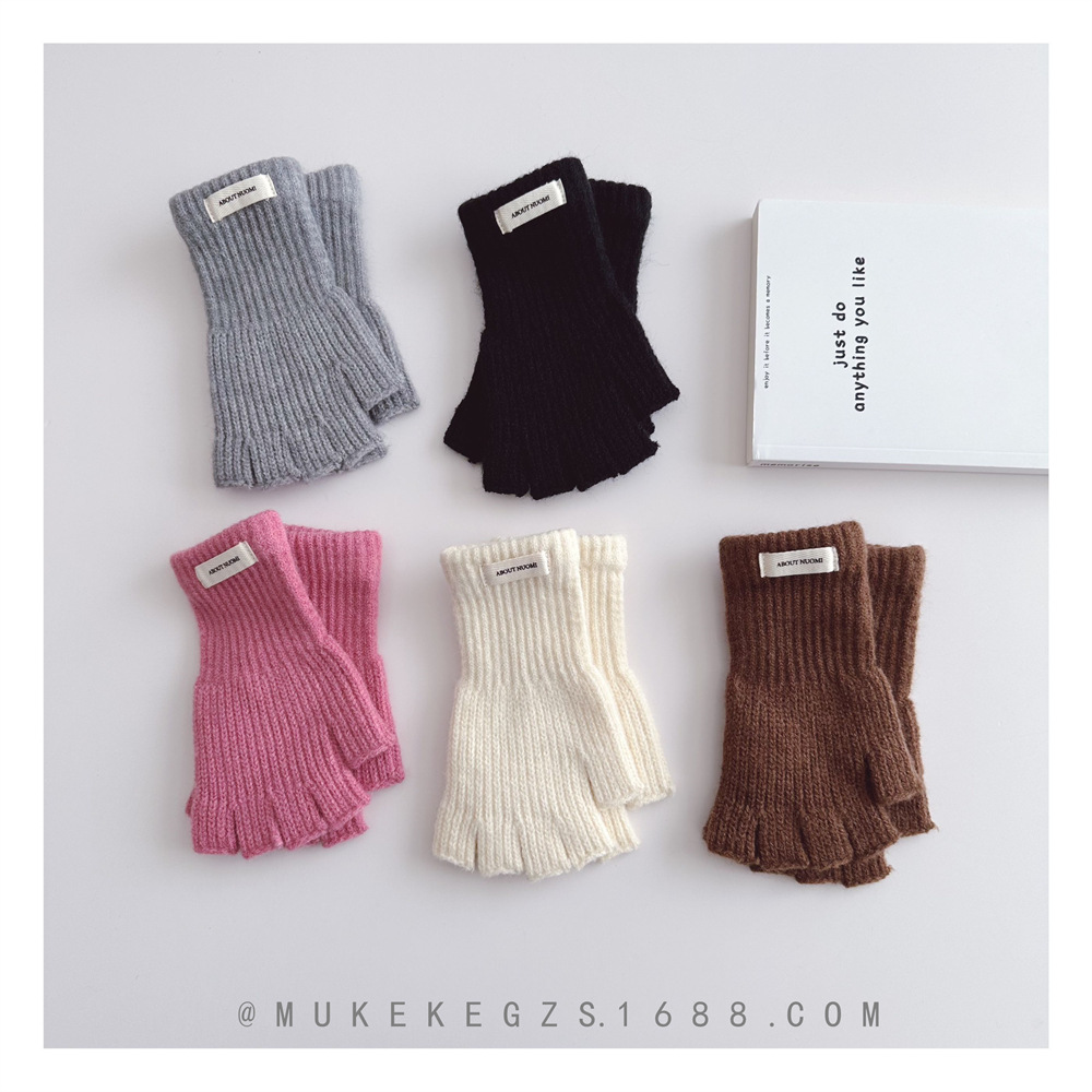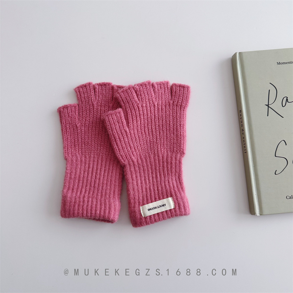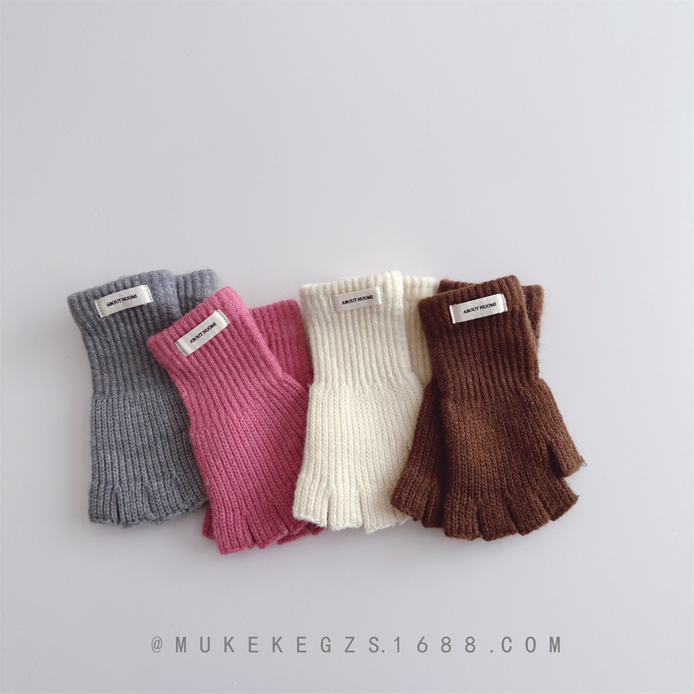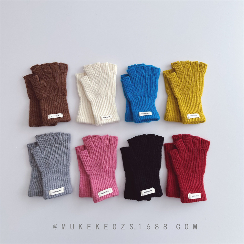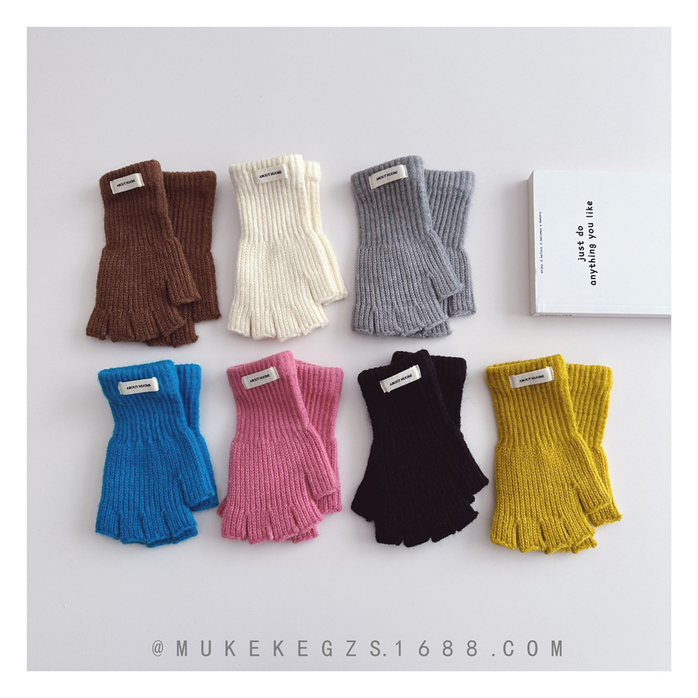 한국식 어린이 단색 니트 장갑 가을과 겨울 학생 전시 장갑 남학생과 여학생을위한 따뜻한 양모 반 손가락 장갑