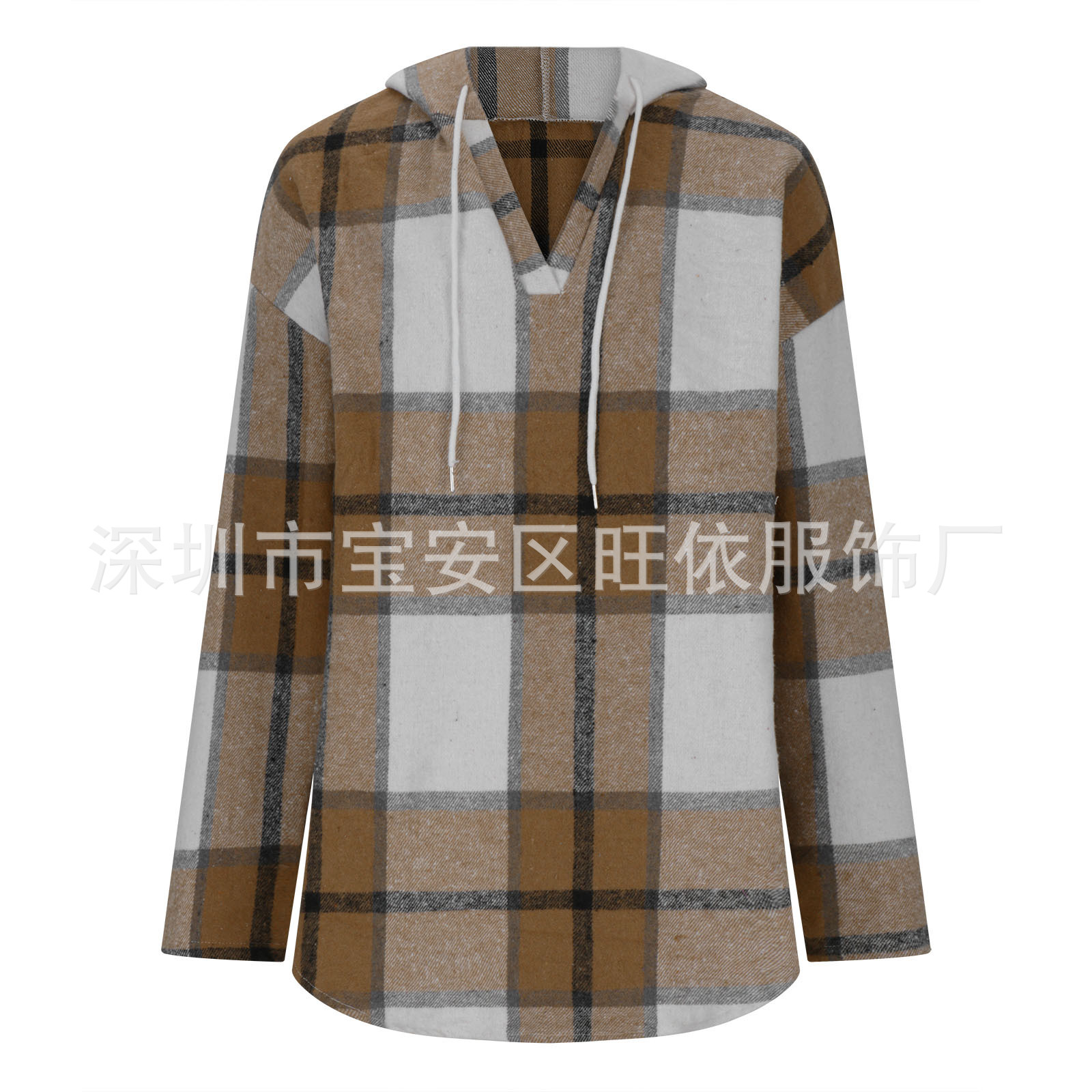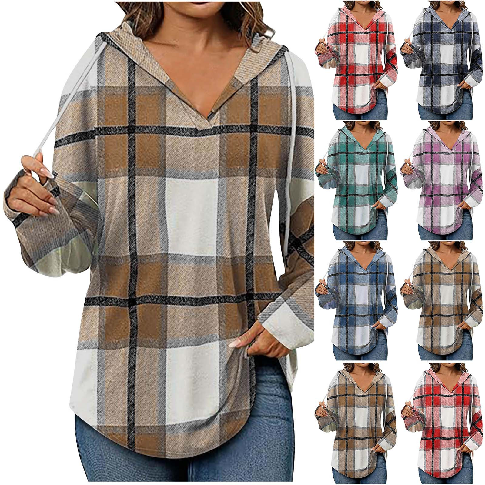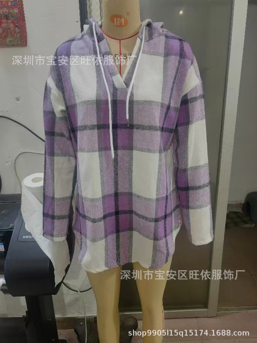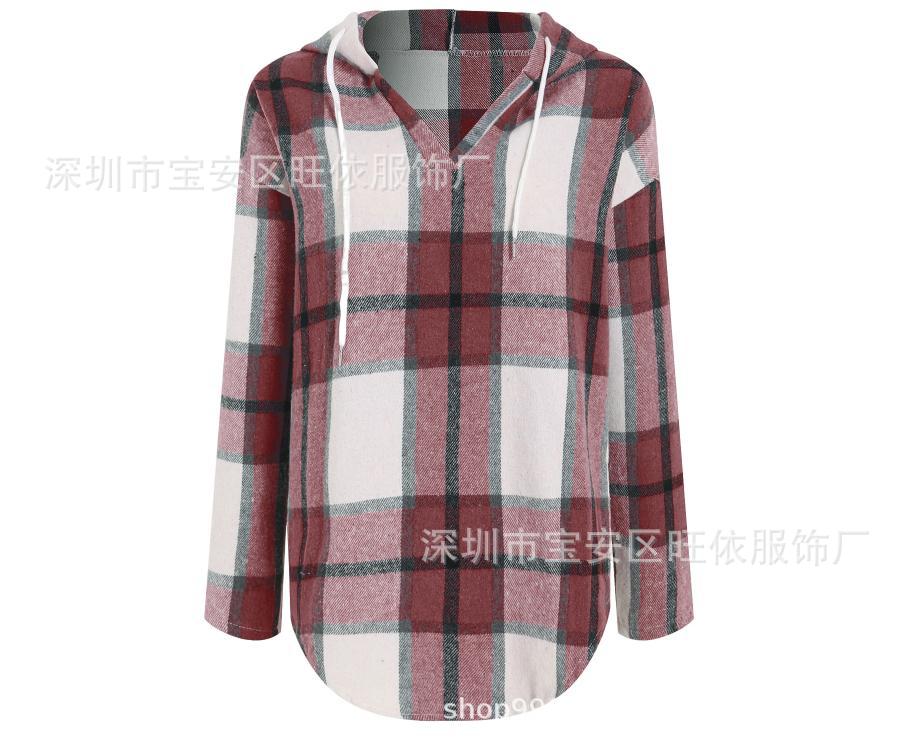 유럽과 미국의 국경 2024 후드 풀오버 V-Neck 양모 배치되지 않은 서랍 캐주얼 체크 무늬 여성용 긴팔 셔츠스토어 가기
