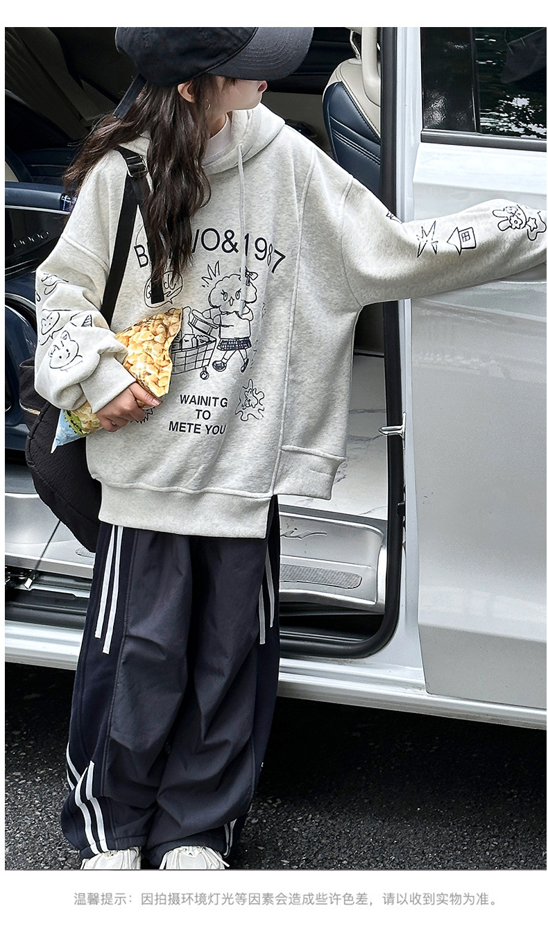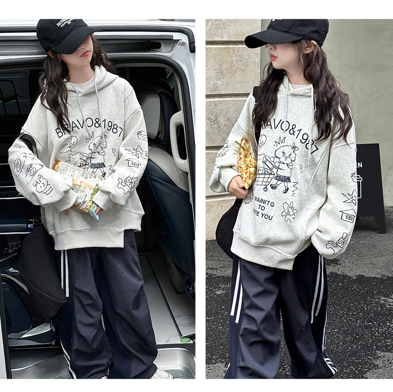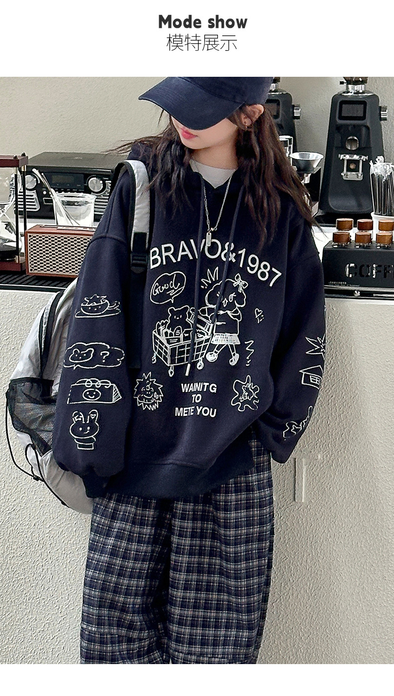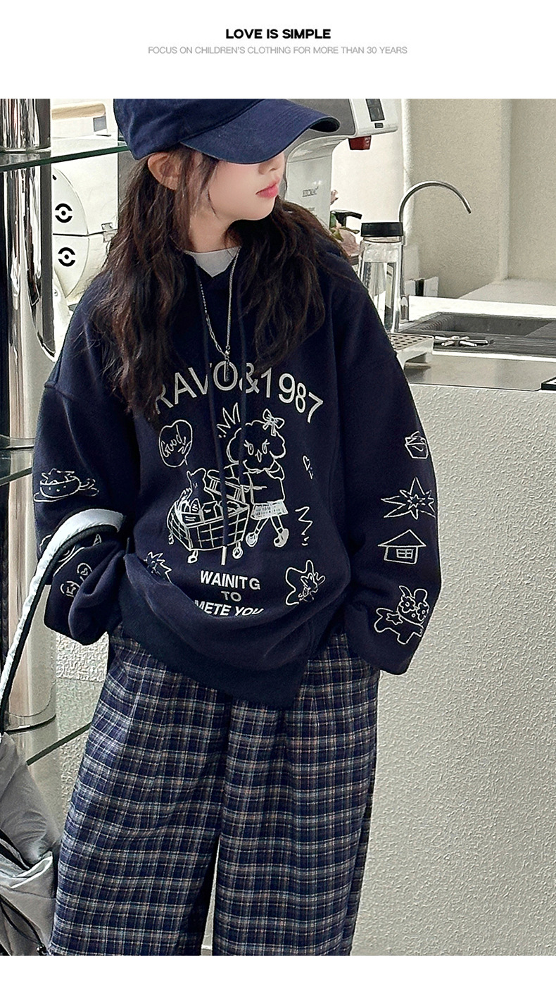소녀 스웨터 가을과 겨울 기모 두꺼운 만화 인쇄 따뜻한 탑 2024 새로운 아동베이스 셔츠스토어 가기