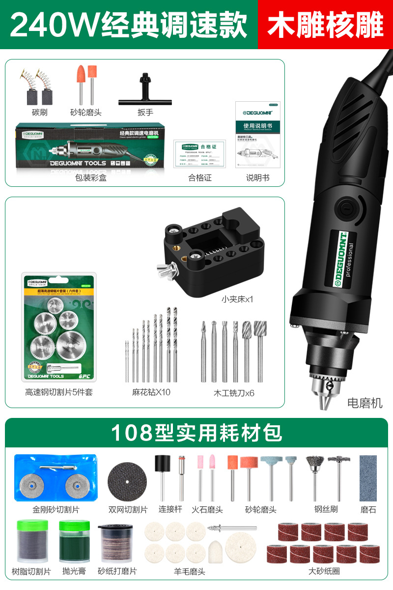• [240W/6단 속도 조절/0.6-6.5 클램핑] 목각 및 코어 조각 + 무료 108 액세서리